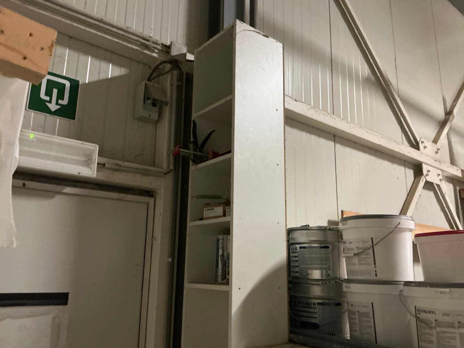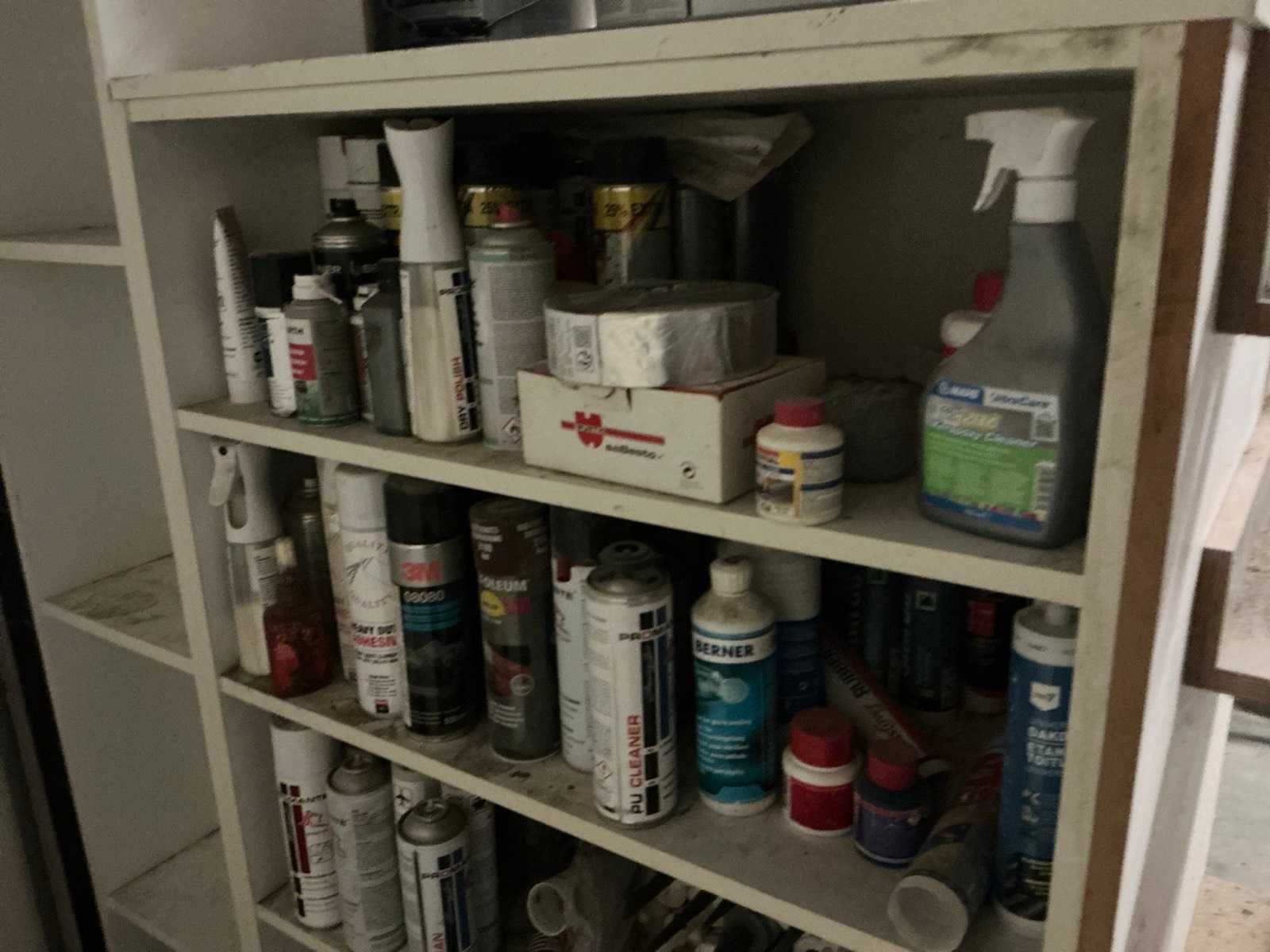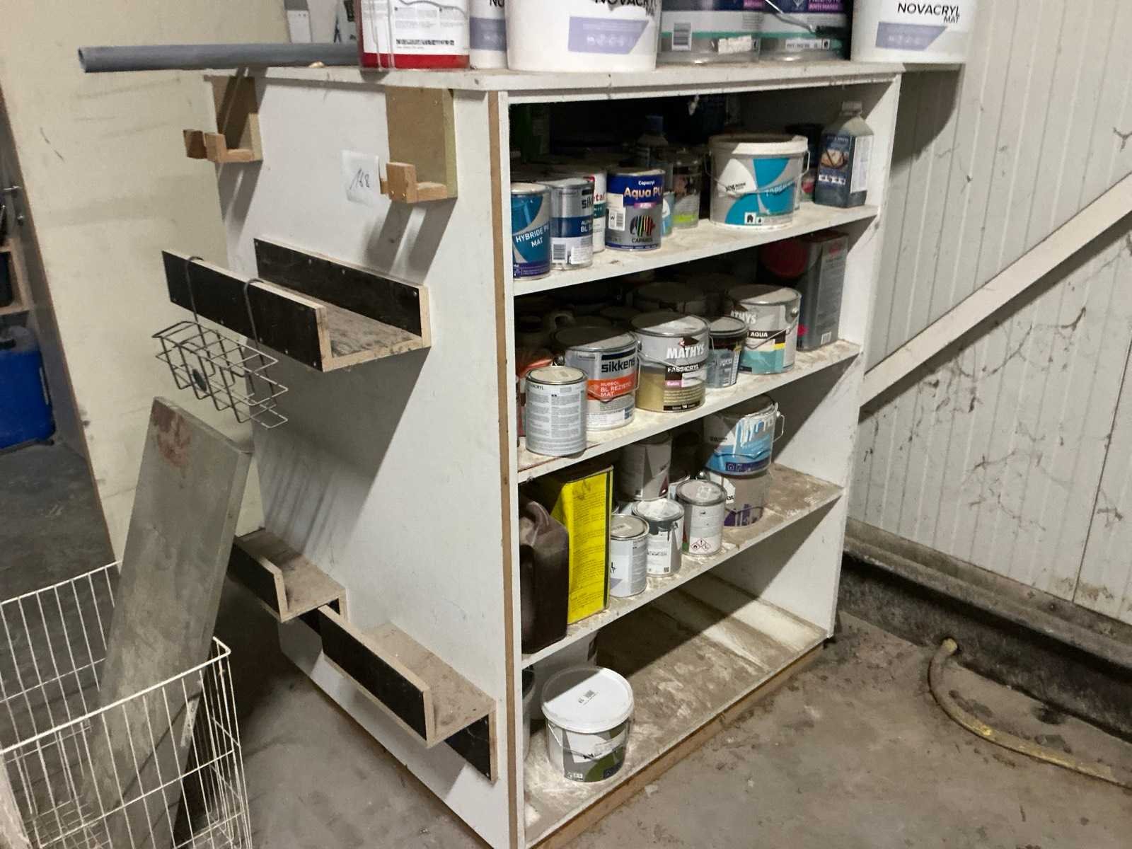 Met inhoud waaronder muurverf, lak, diverse sprays, siliconen en diverse vloeistoffen. Waaronder merken Novaprim, Sikkens, Mathys, Boss Paints, Ardex,… Waaronder 1x met afmetingen ca. 120 x 94 x 290cm en 1x met afmetingen ca. 124 x 61 x 148cm. Afgifte volgens aanwijzing. Door koper te verplaatsen van omgeving. Nee