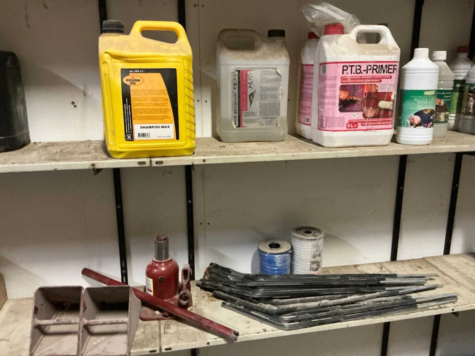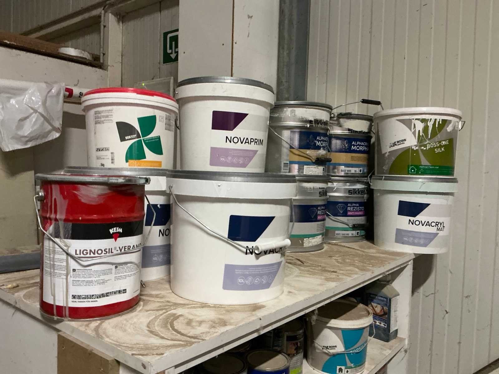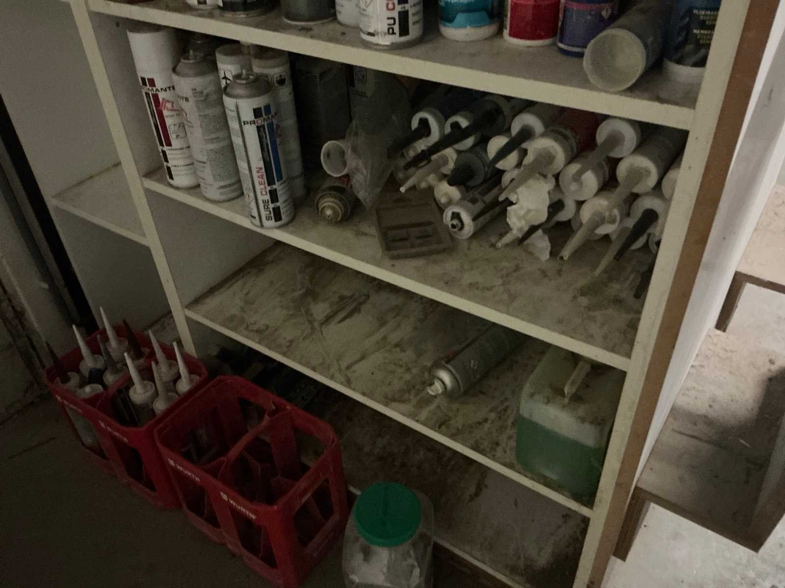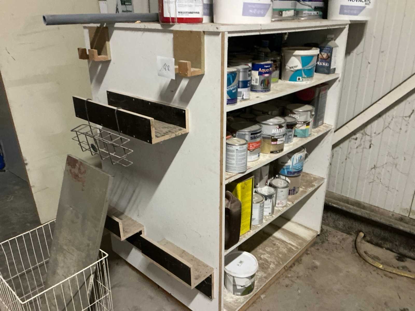 Met inhoud waaronder muurverf, lak, diverse sprays, siliconen en diverse vloeistoffen. Waaronder merken Novaprim, Sikkens, Mathys, Boss Paints, Ardex,… Waaronder 1x met afmetingen ca. 120 x 94 x 290cm en 1x met afmetingen ca. 124 x 61 x 148cm. Afgifte volgens aanwijzing. Door koper te verplaatsen van omgeving. Nee