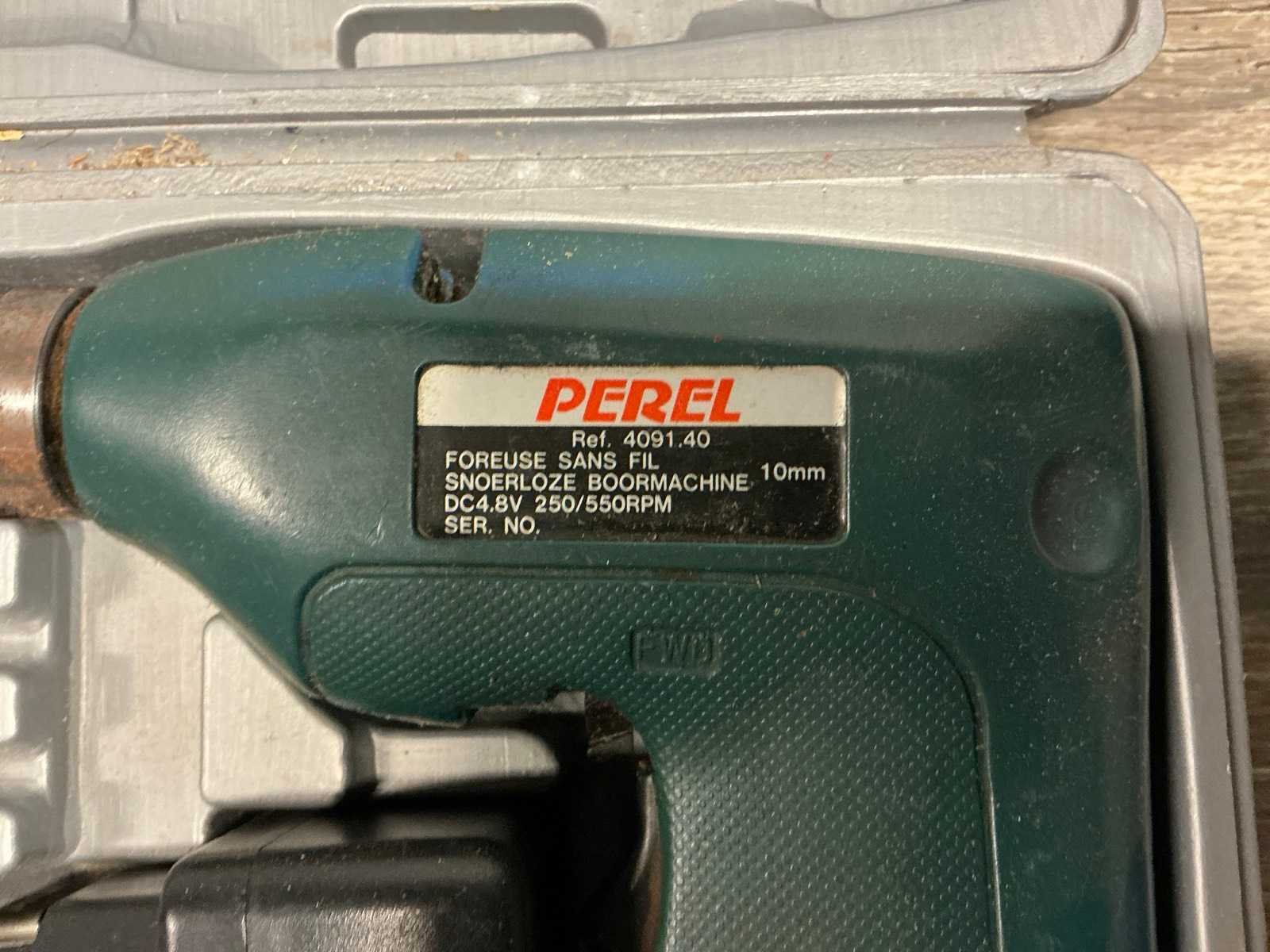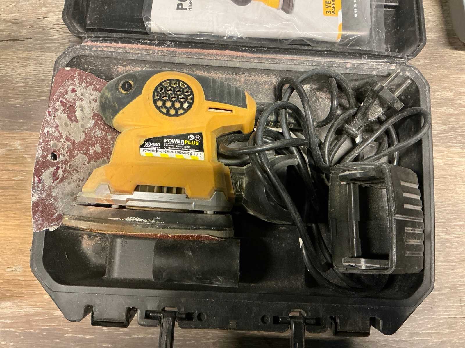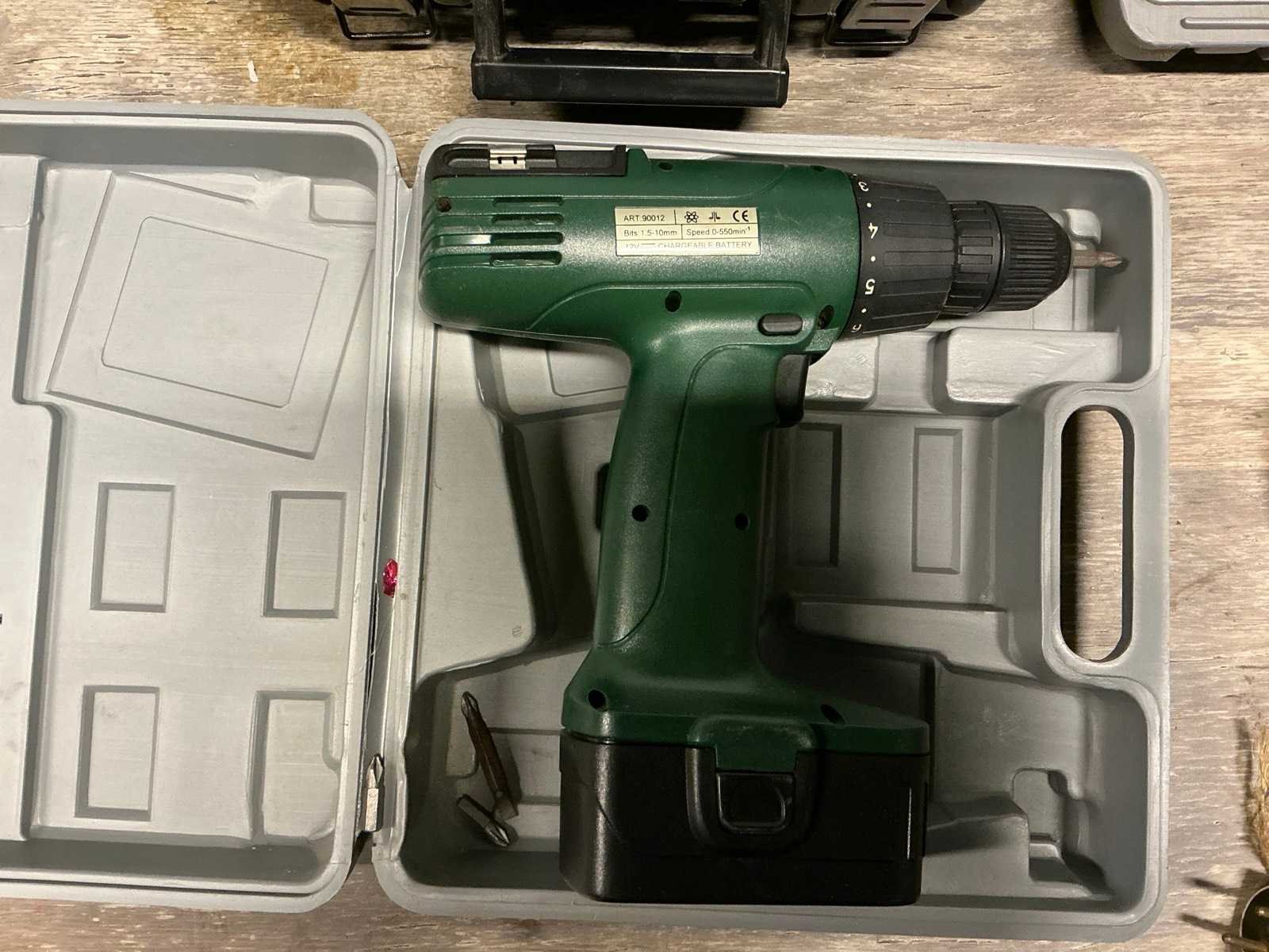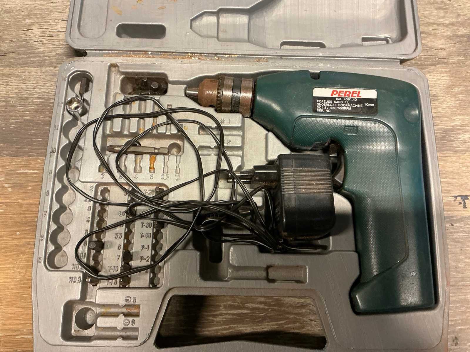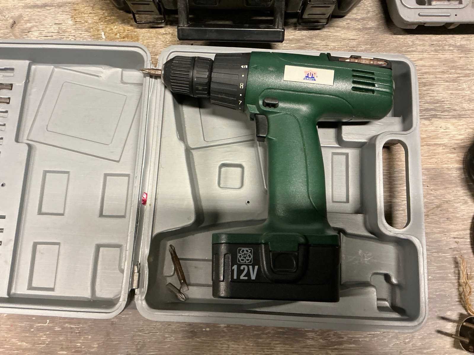 Bestaande uit accu schroefmachine TOPCRAFT, voorzien van accu en opbergkoffer, niet voorzien van lader. Elektrische schuurmachine POWERPLUS ; X0480 compleet met opbergkoffer. Snoerloze boormachine PEREL in opbergkoffer compleet met elektrische dito BLACK&DECKER Nee
