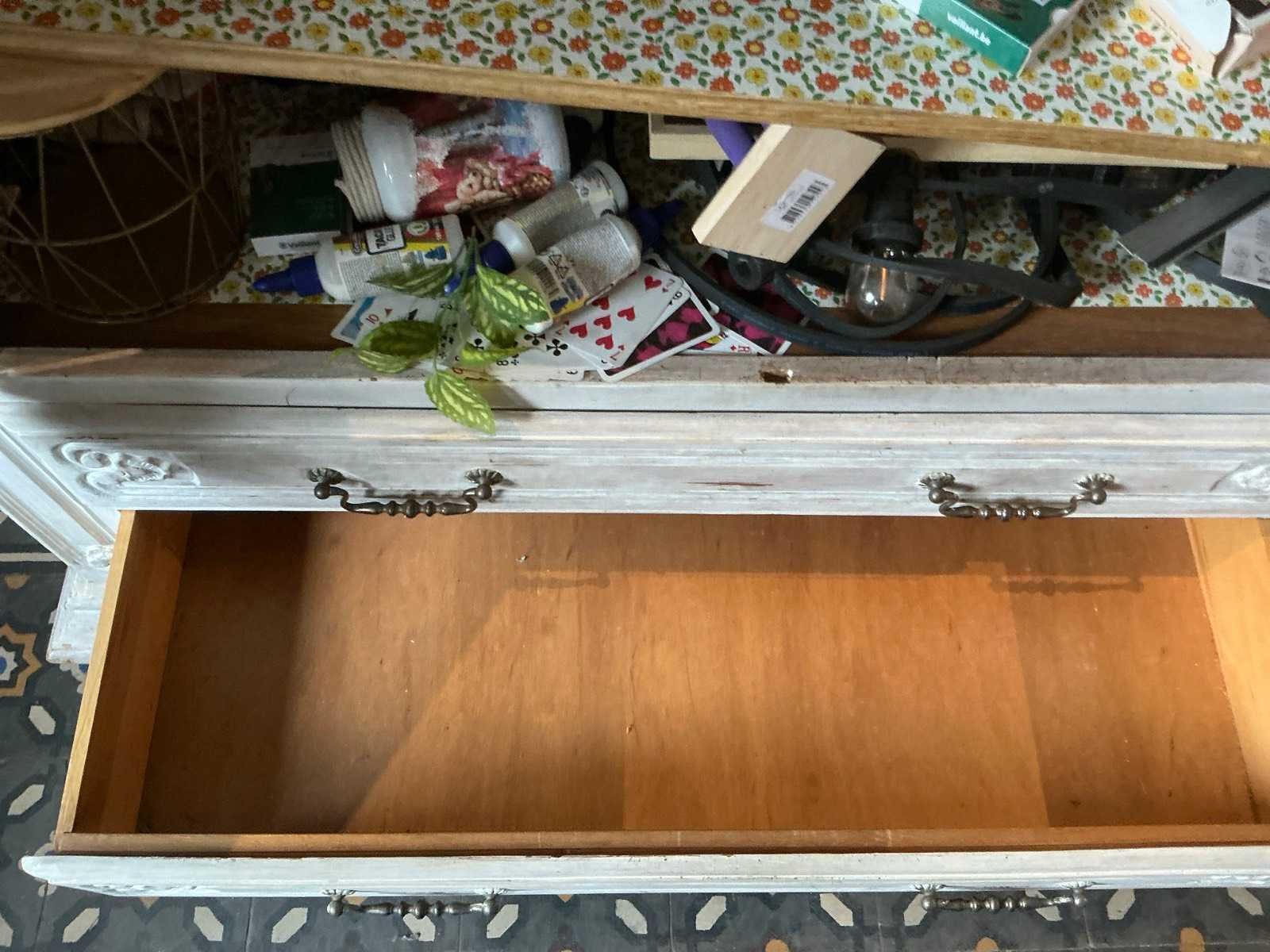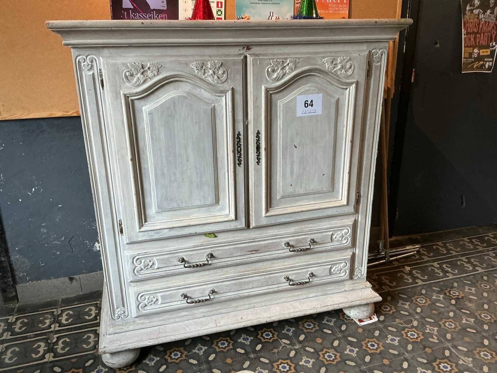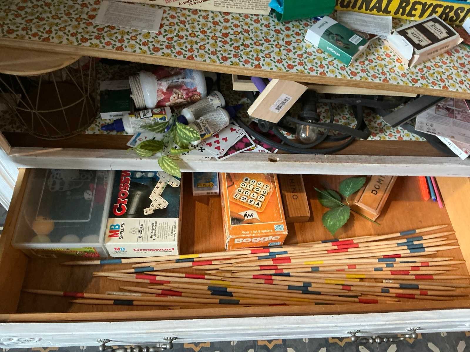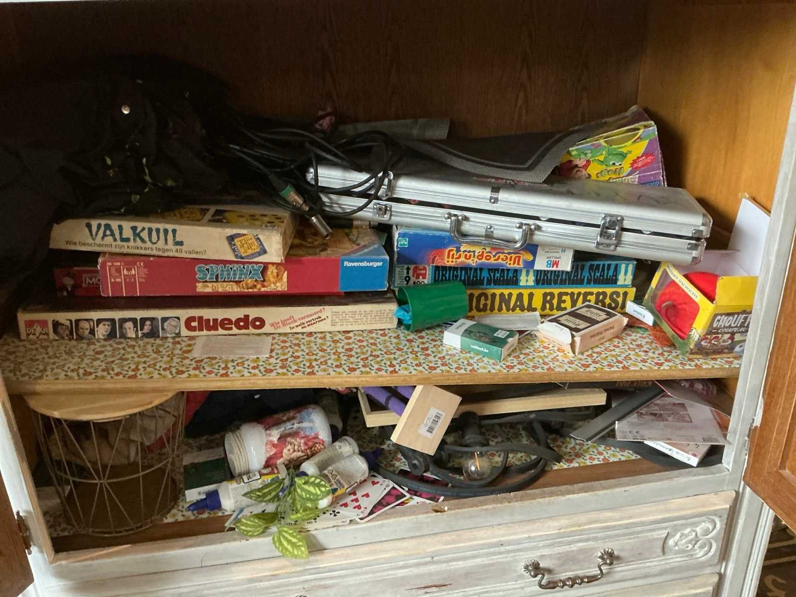Met afmeting circa 122 x 60 x 130 cm, voorzien van 2 deuren en 2 laden compleet met inhoud inhoudende partij gezelschapspelletjes waaronder CLUEDO, VALKUIL, SPHINX, enzovoort Nee