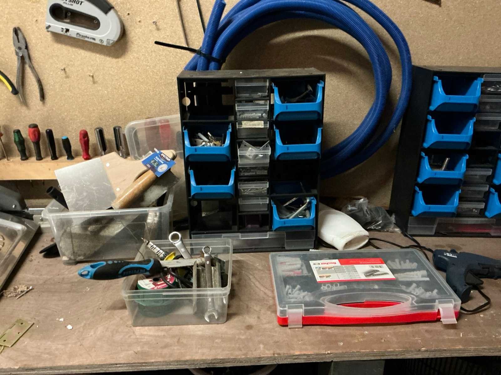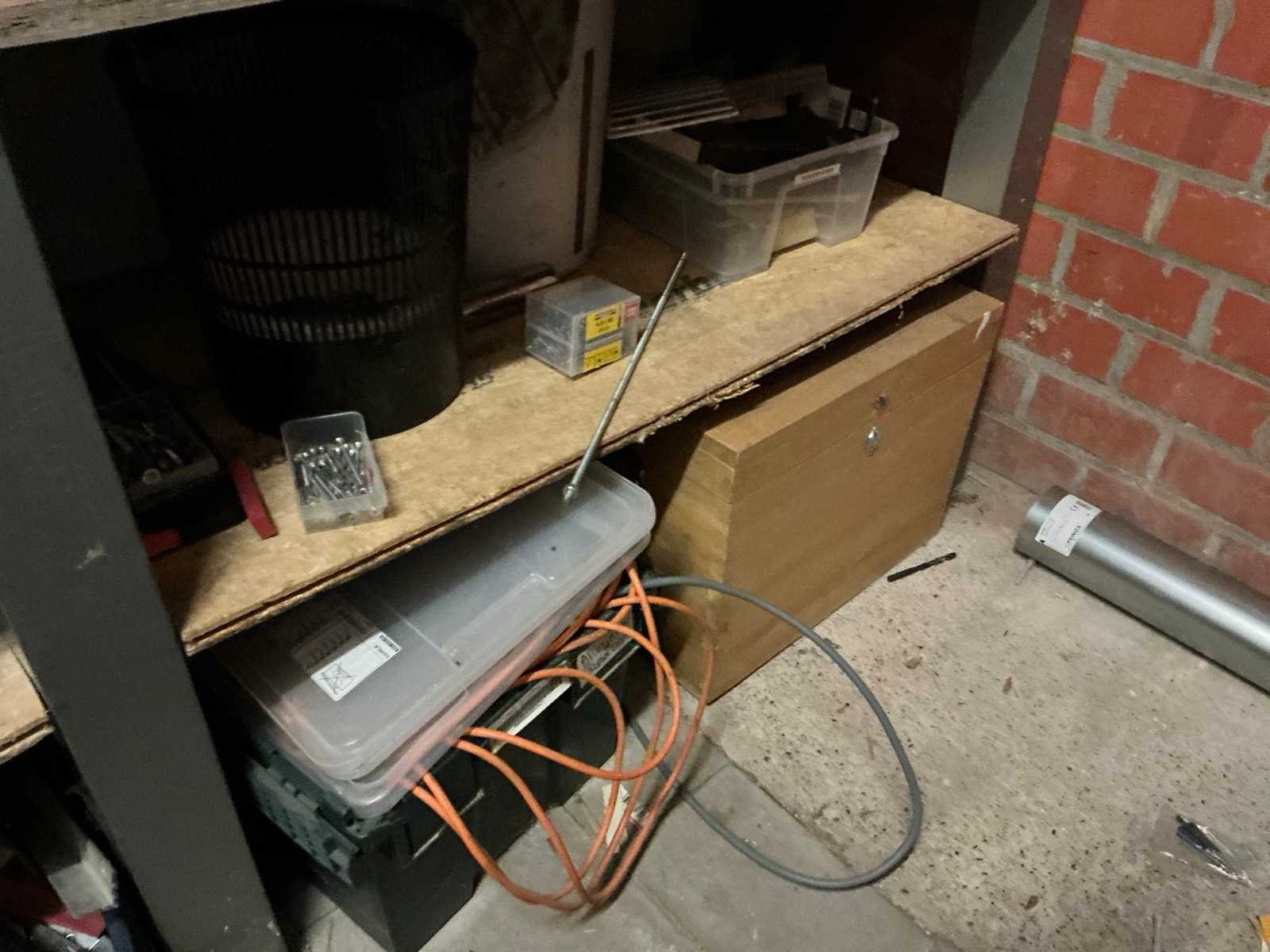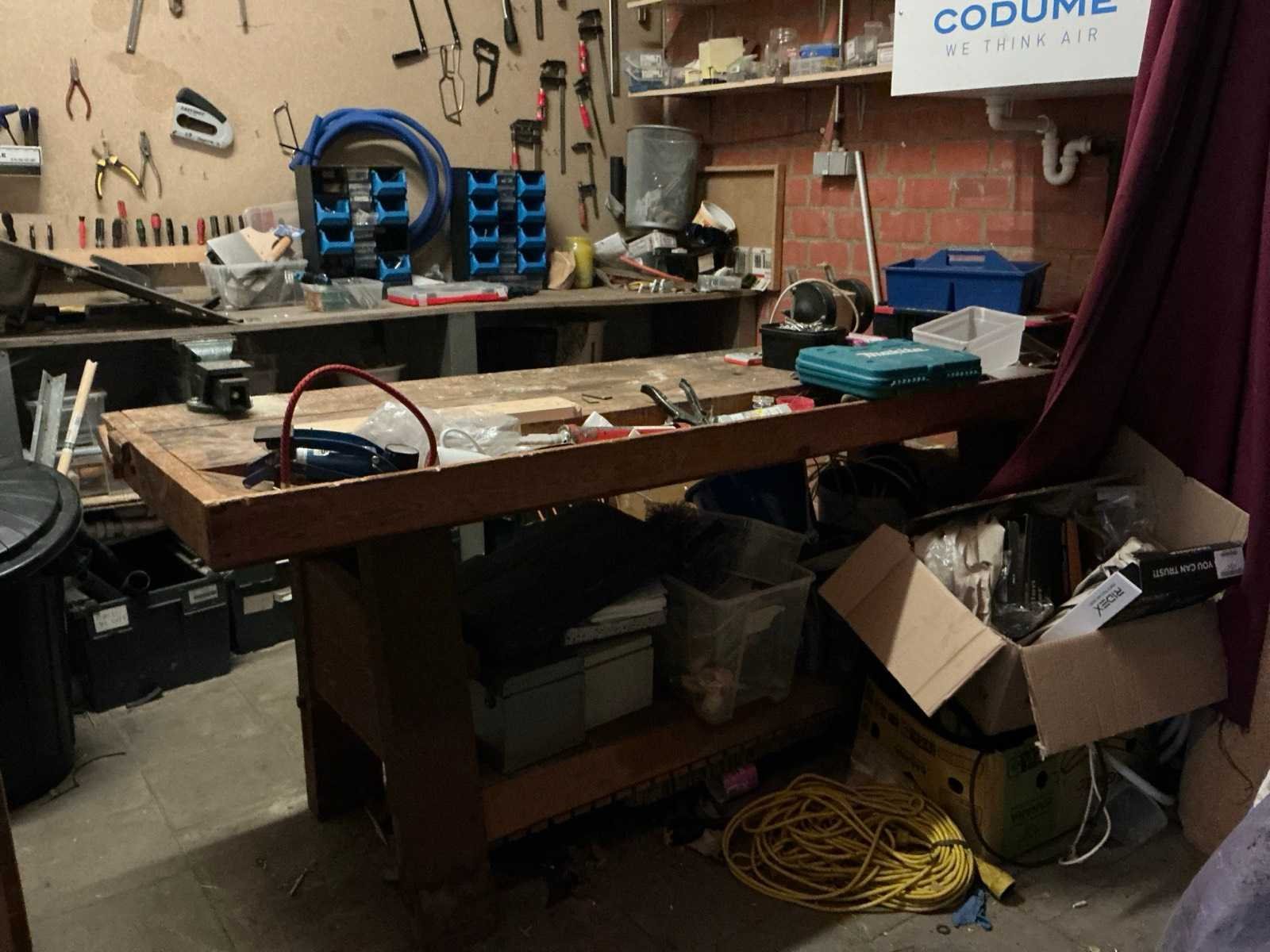 De inhoud van deze werkruimte bestaande uit houten werkbank, afmeting circa 233 x 65 x 88 cm compleet met partij divers handgereedschap waaronder spanklemmen, tangen, zagen, schroevendraaiers, bankschroef, dubbelkopse slijpmolen, enzovoort. Partij divers bevestigingsmateriaal waaronder schroeven en moeren, pvc gereedschapskoffer, metalen opbergrekje, enzovoort Afgifte volgens aanwijzing Nee
