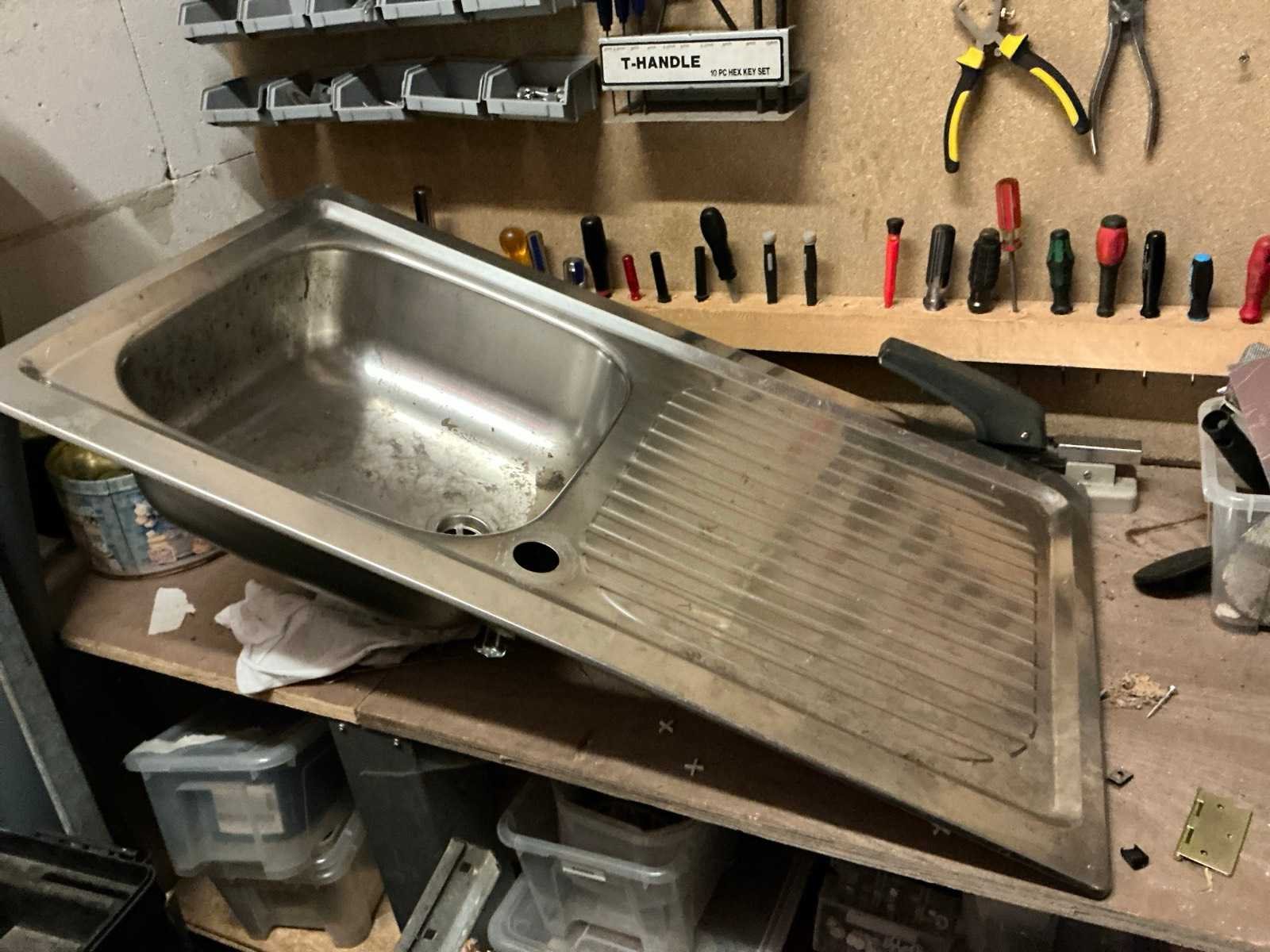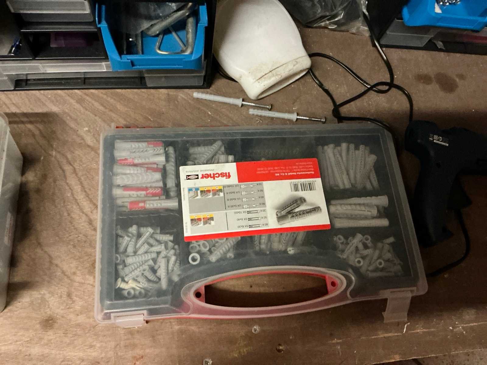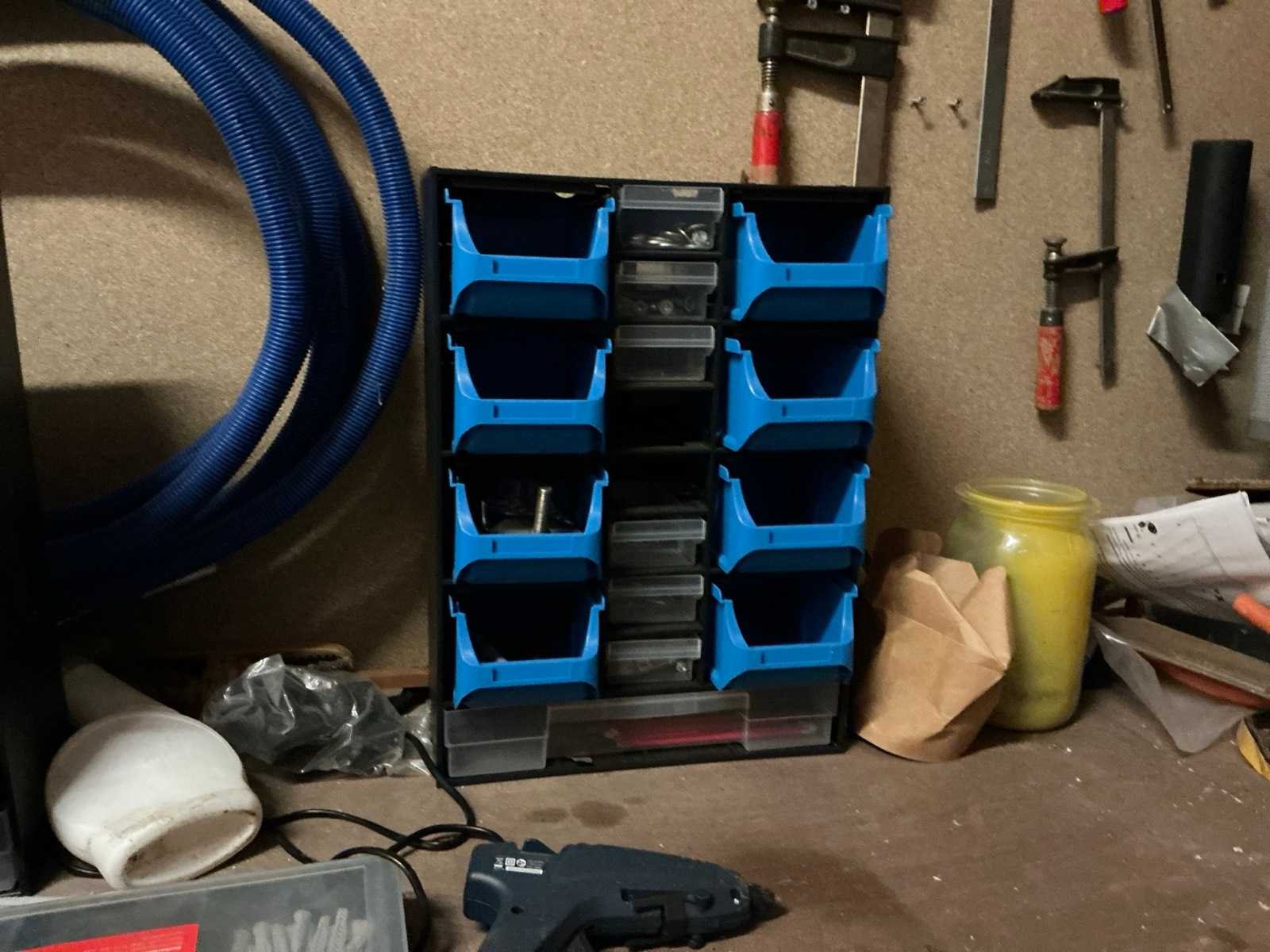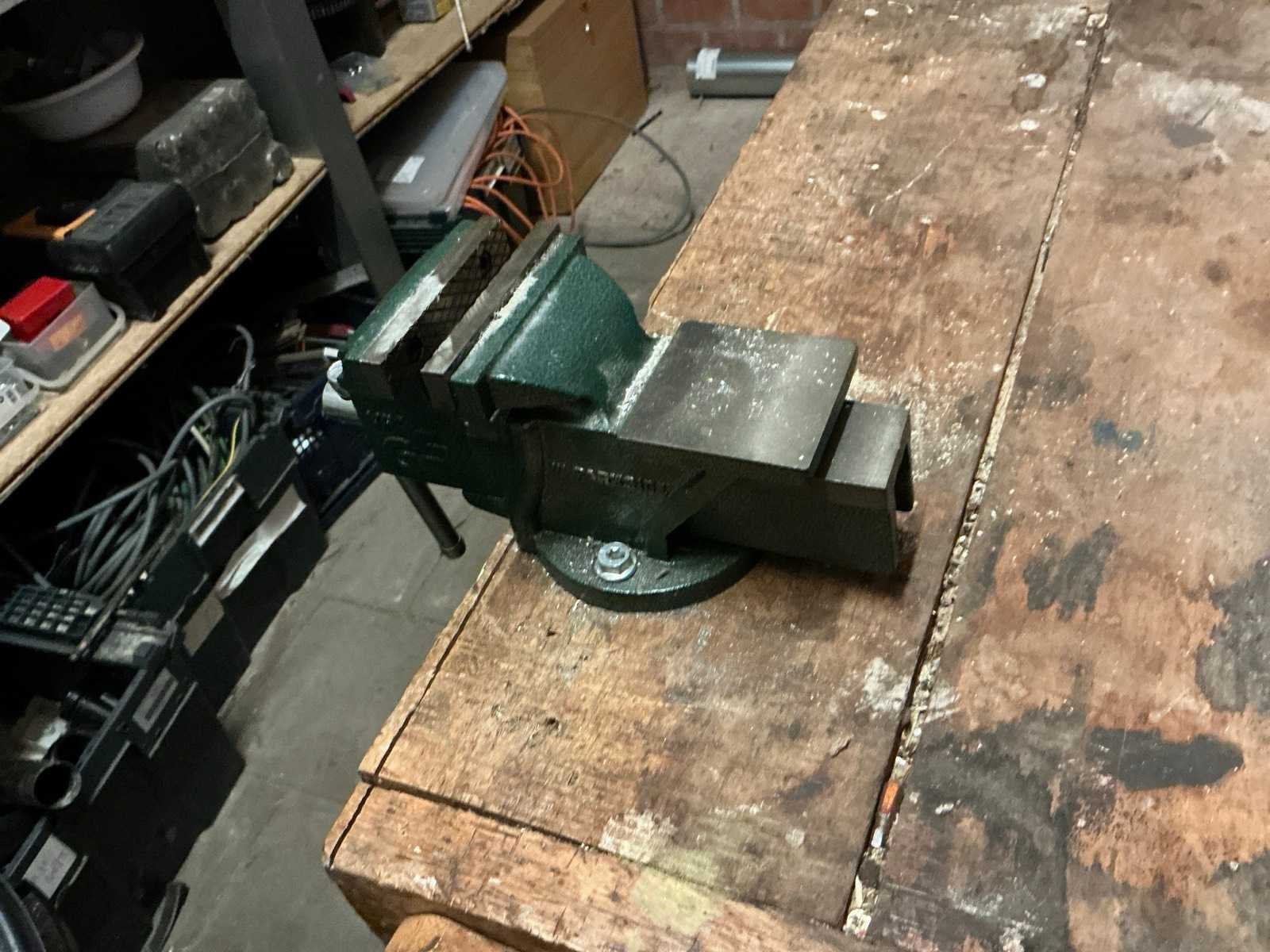 De inhoud van deze werkruimte bestaande uit houten werkbank, afmeting circa 233 x 65 x 88 cm compleet met partij divers handgereedschap waaronder spanklemmen, tangen, zagen, schroevendraaiers, bankschroef, dubbelkopse slijpmolen, enzovoort. Partij divers bevestigingsmateriaal waaronder schroeven en moeren, pvc gereedschapskoffer, metalen opbergrekje, enzovoort Afgifte volgens aanwijzing Nee