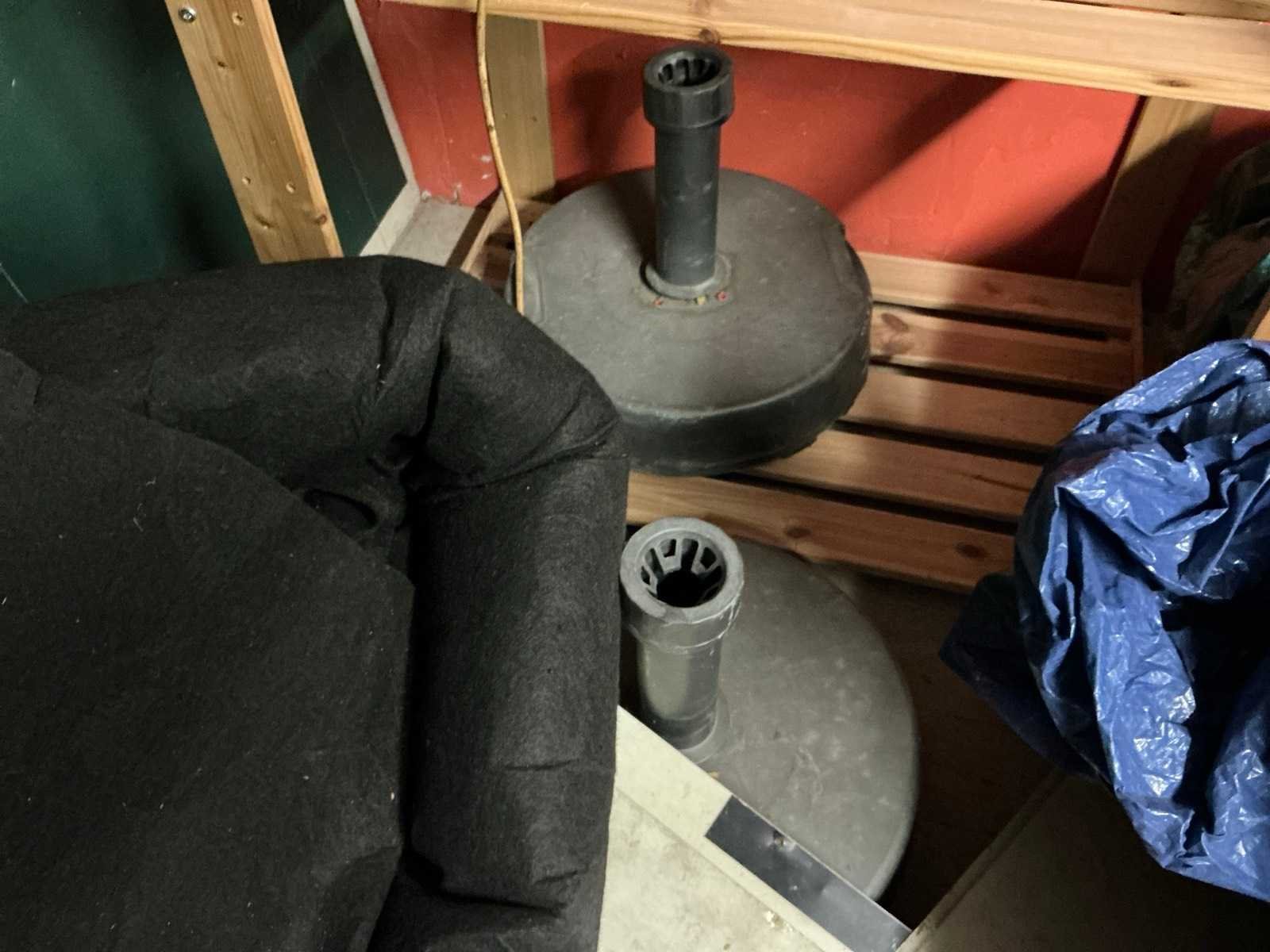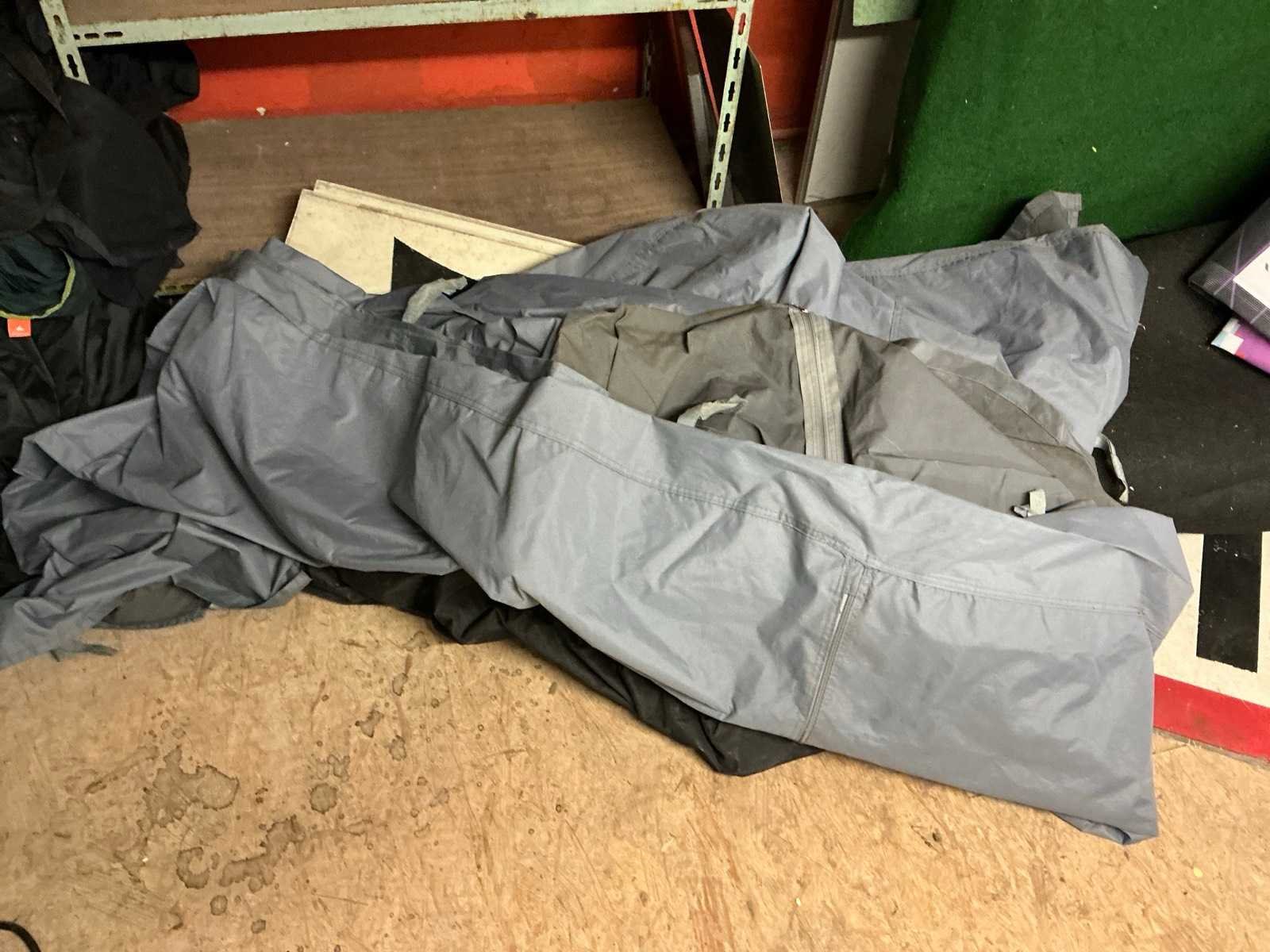 Vermoedelijk groot afdekzeil, compleet met enige stoffen opbergtassen en reclamebanners compleet met 2 pvc parasolvoet, zich bevindend op de vlonder dient door de klant via de trap verwijderd te worden. Nee