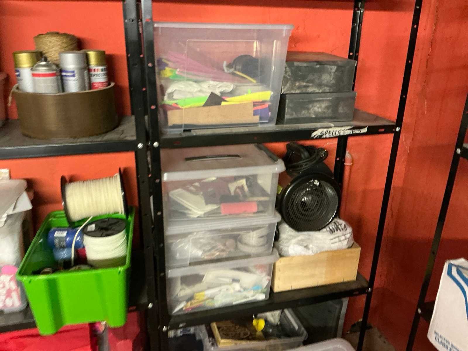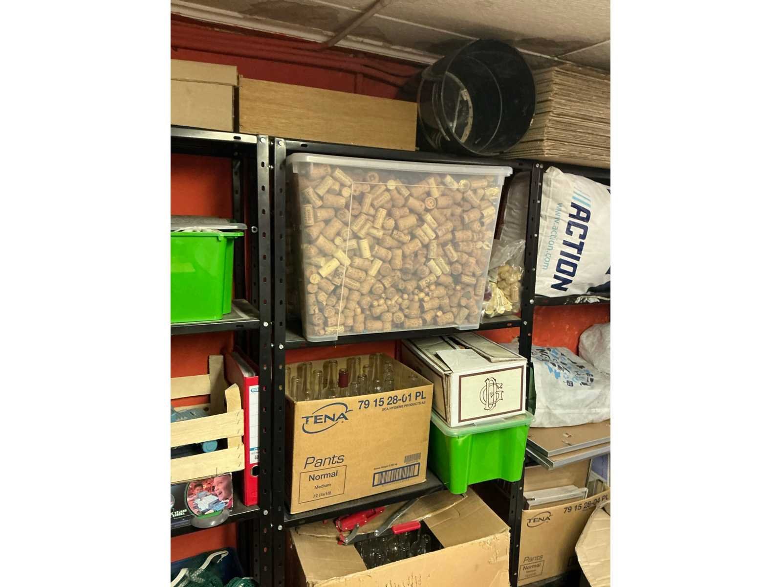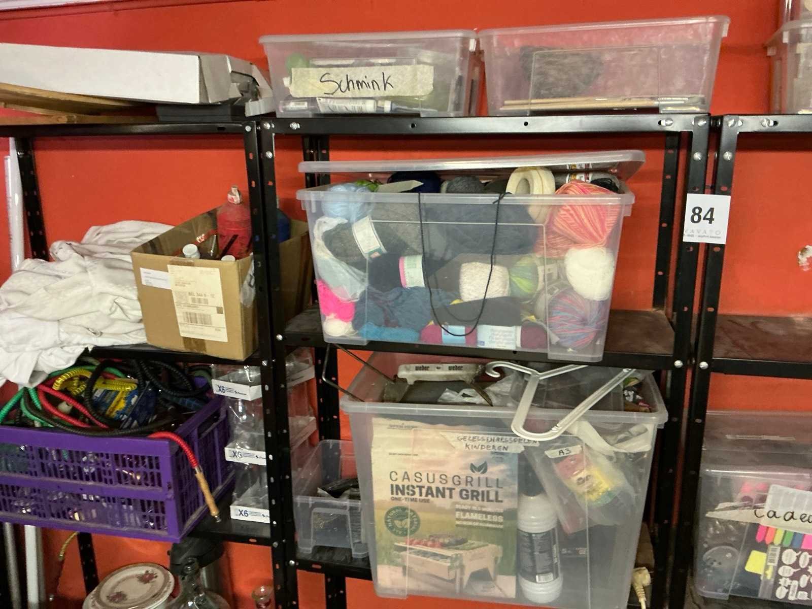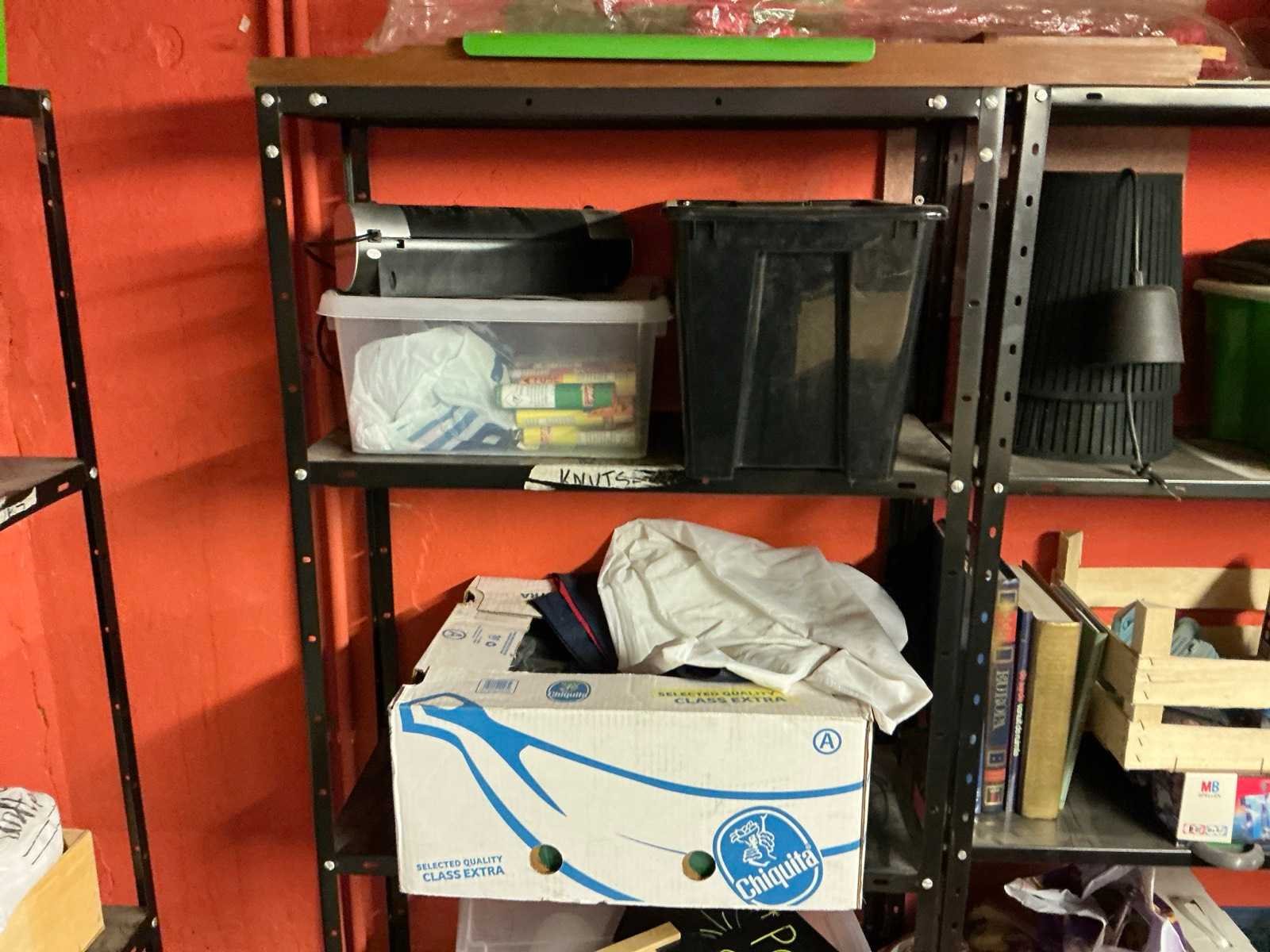 Bestaande uit garen, glazen, kurken, karton, stickers, servies, lampenkappen, heteluchtblazer, lamineer apparaat, schmink, enzovoort compleet met 8 zwart metalen opbergrekjes elk met afmeting circa 75 x 30 x 150 cm, zich bevindend op de vlonder dient door de klant via de trap verwijderd te worden. Nee