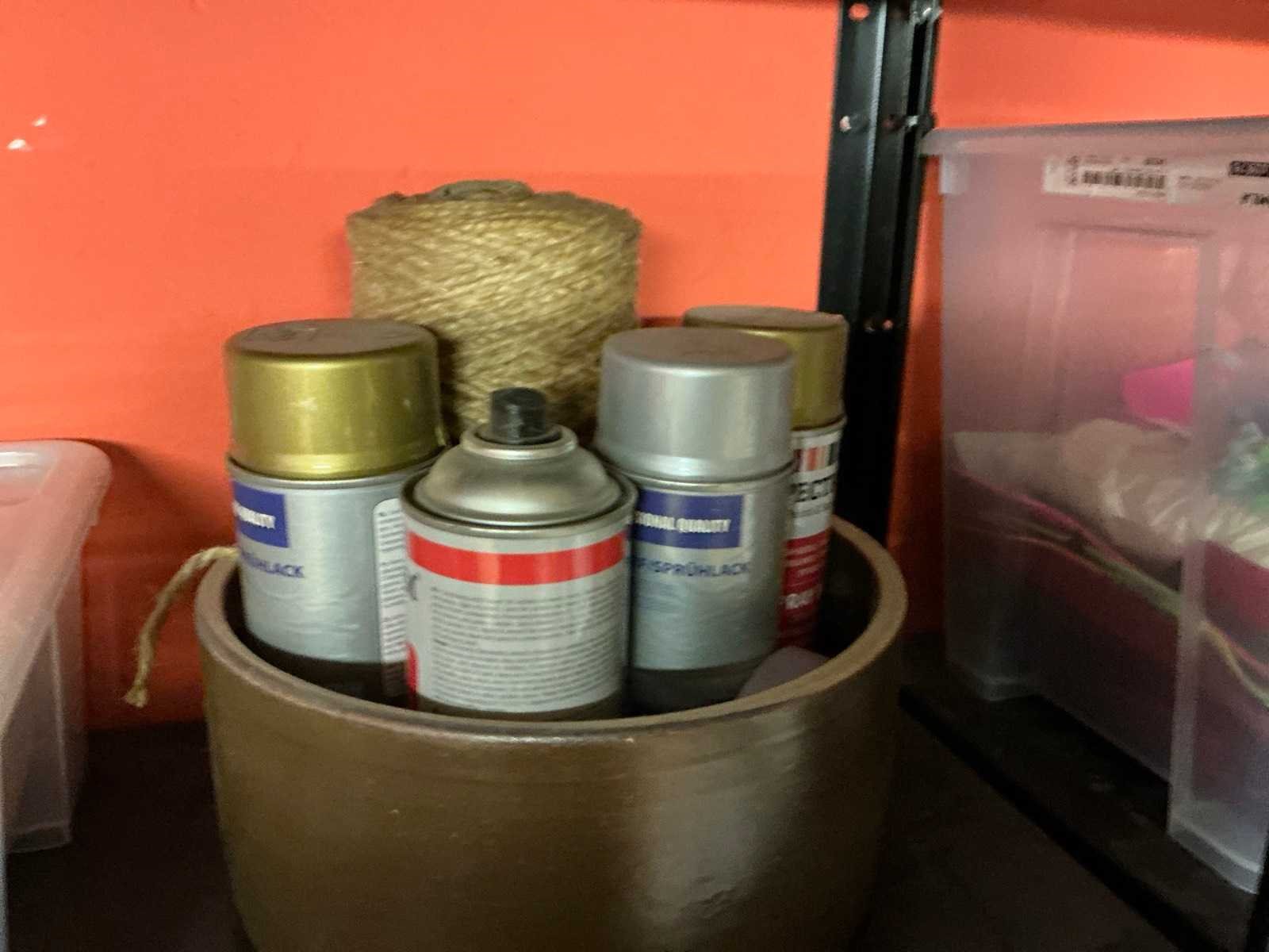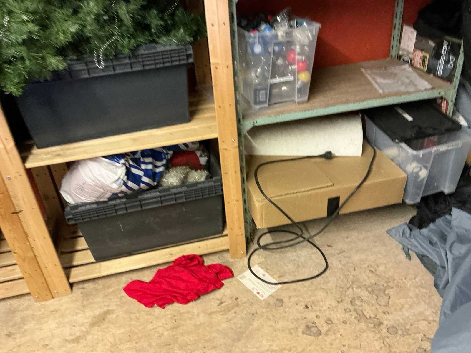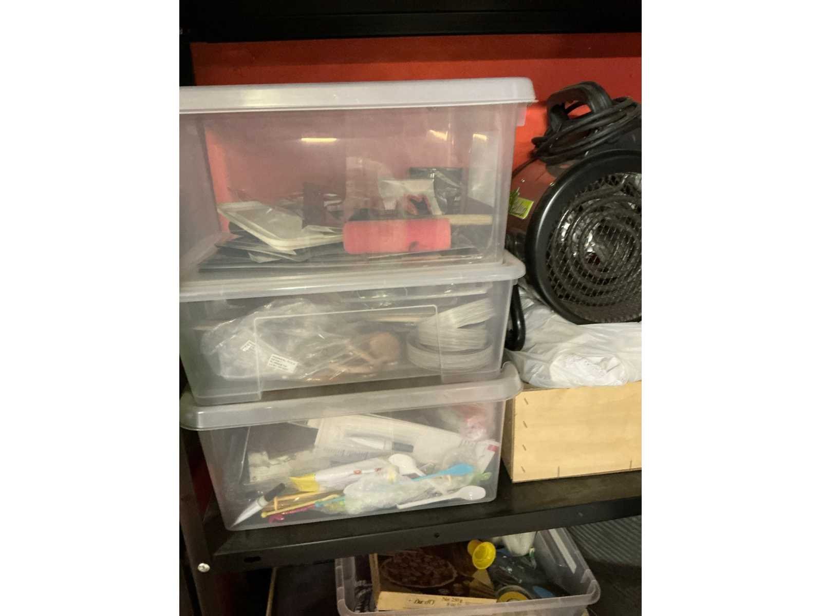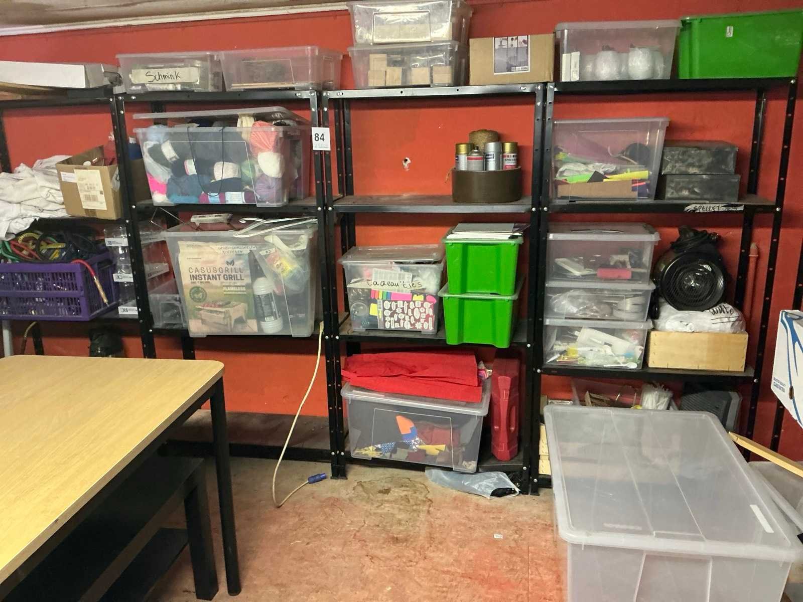 Bestaande uit garen, glazen, kurken, karton, stickers, servies, lampenkappen, heteluchtblazer, lamineer apparaat, schmink, enzovoort compleet met 8 zwart metalen opbergrekjes elk met afmeting circa 75 x 30 x 150 cm, zich bevindend op de vlonder dient door de klant via de trap verwijderd te worden. Nee