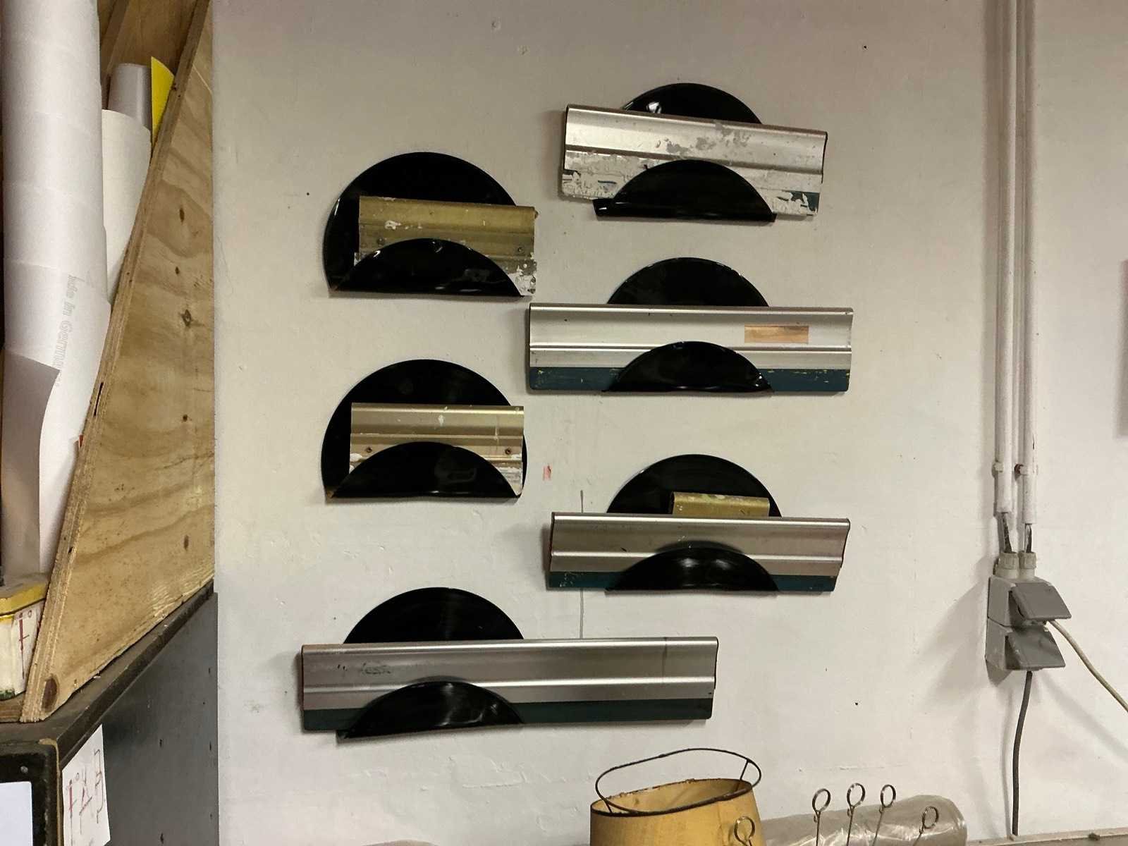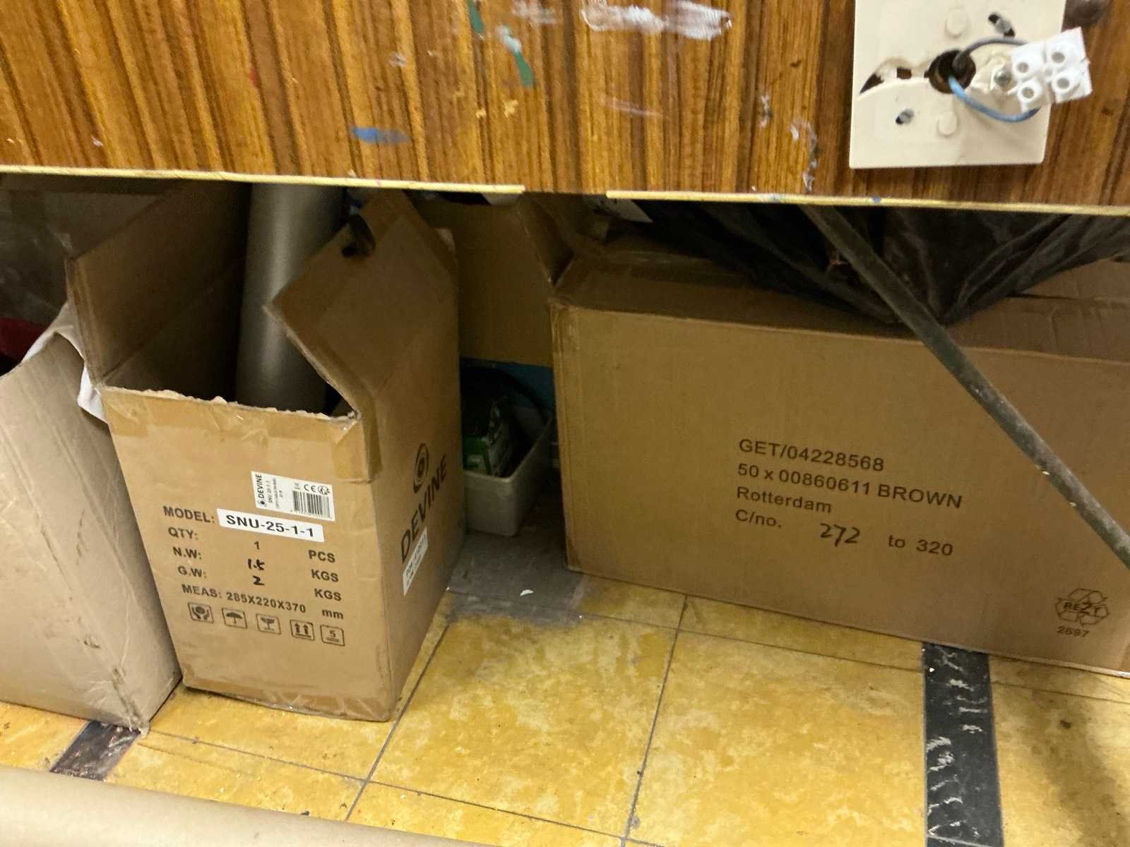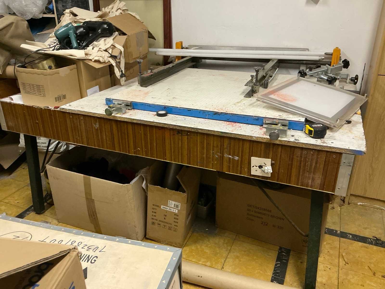 Afmeting circa 105 x 68 x 140 cm, lichtbak met afmeting circa 70 x 89 x 90 cm, tafel afmeting circa 187 x 135 x 90 cm, compleet met inhoud inhoudende diverse zeefdrukken, dito materiaal, aangesproken verf, meters,scharen, kleding, 3 diverse haardrogers, partij goodiebags, enzovoort Nee