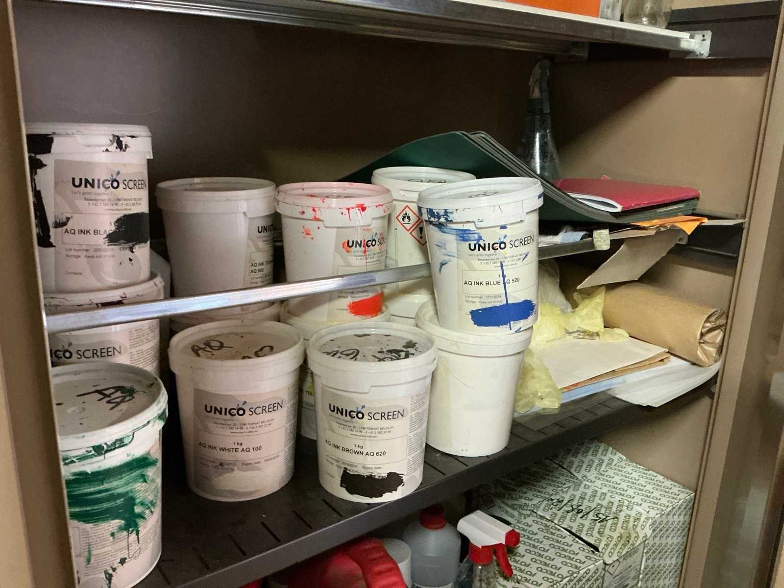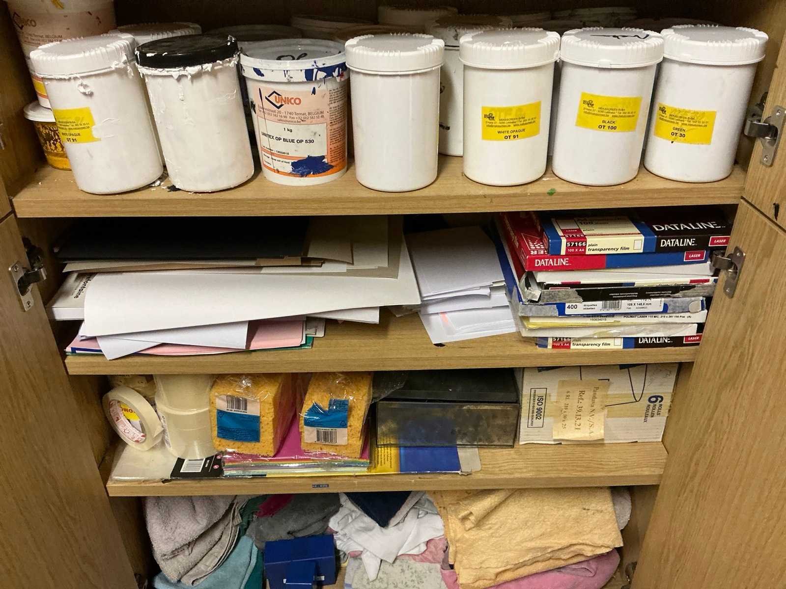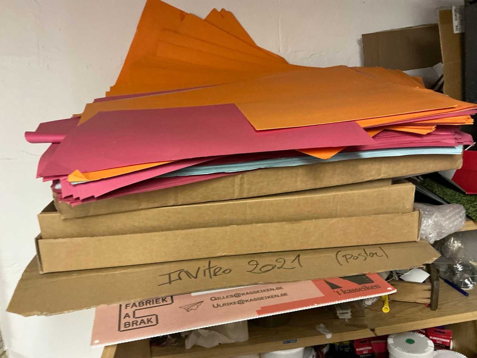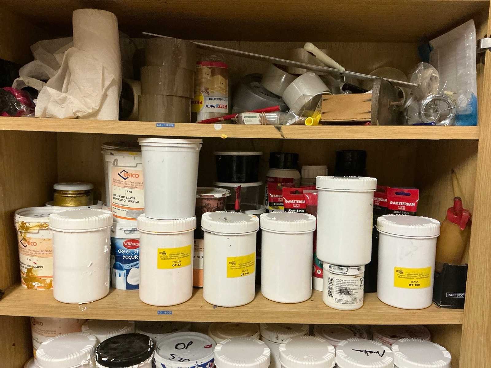 Partij verf en knutselmateriaal waaronder grote partij aangesproken verf, tape, sponzen, papier, enzovoort compleet met 2 diverse kasten en metalen emmer Nee
