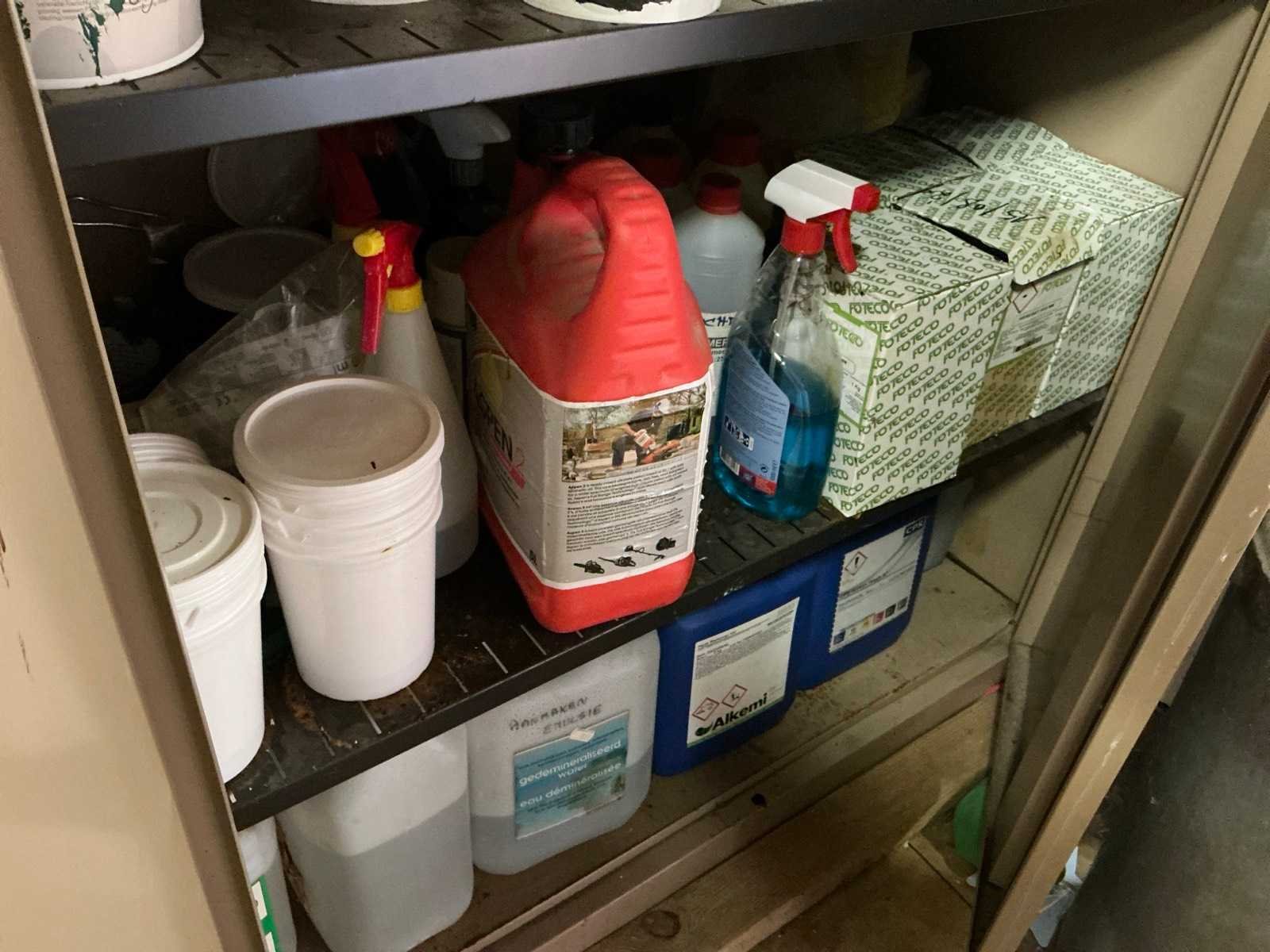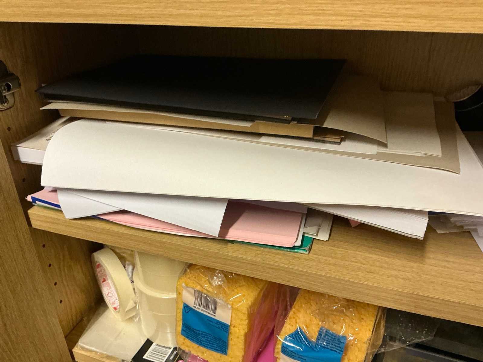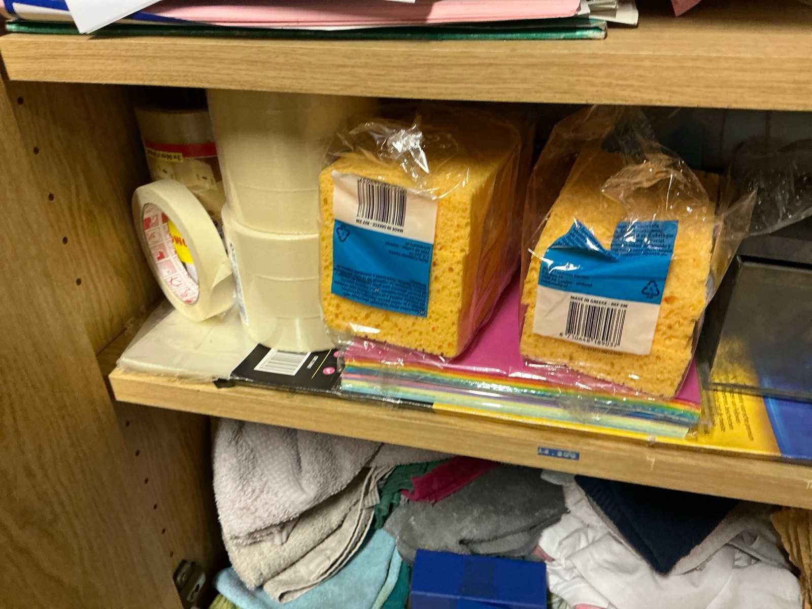 Partij verf en knutselmateriaal waaronder grote partij aangesproken verf, tape, sponzen, papier, enzovoort compleet met 2 diverse kasten en metalen emmer Nee