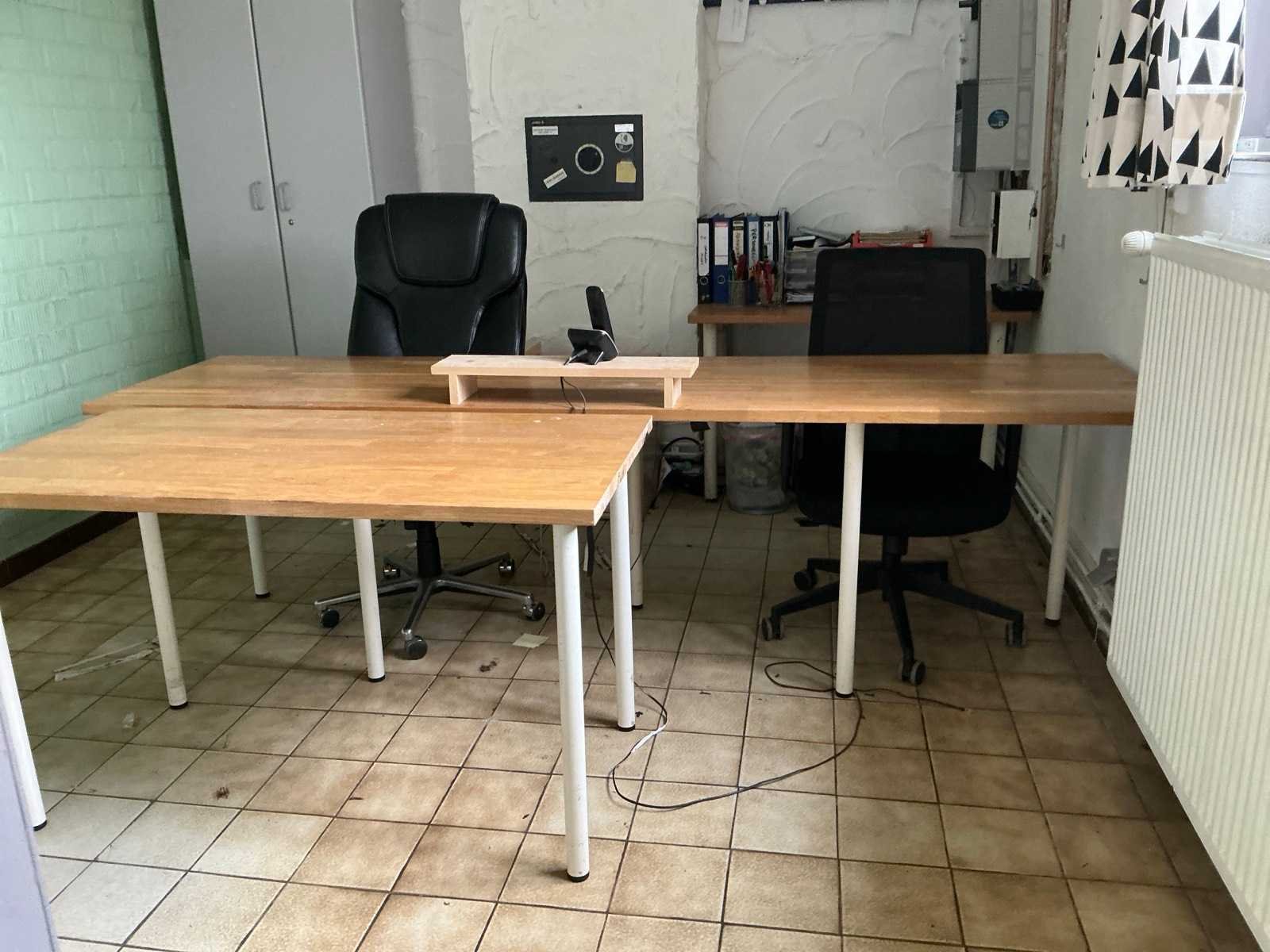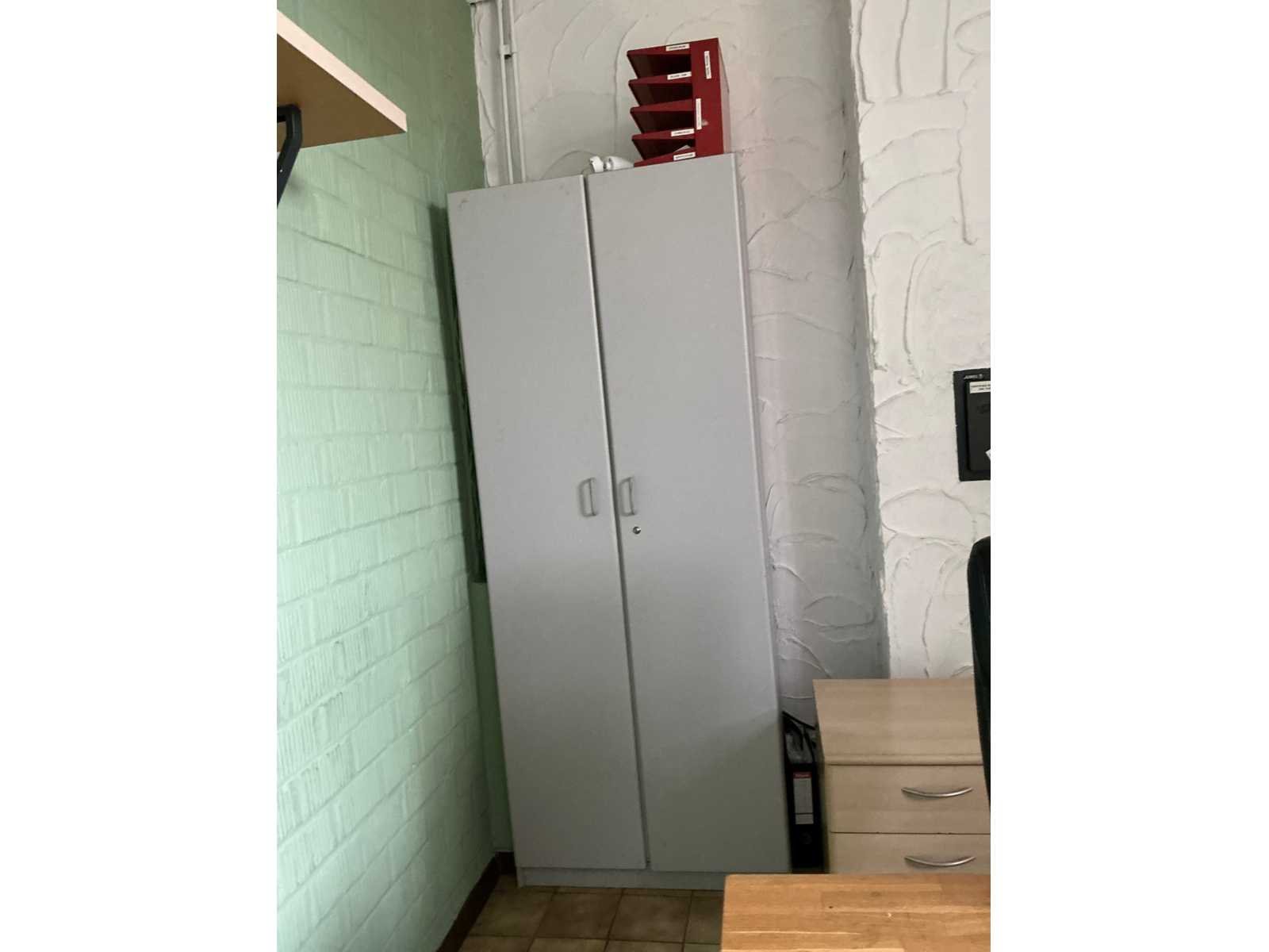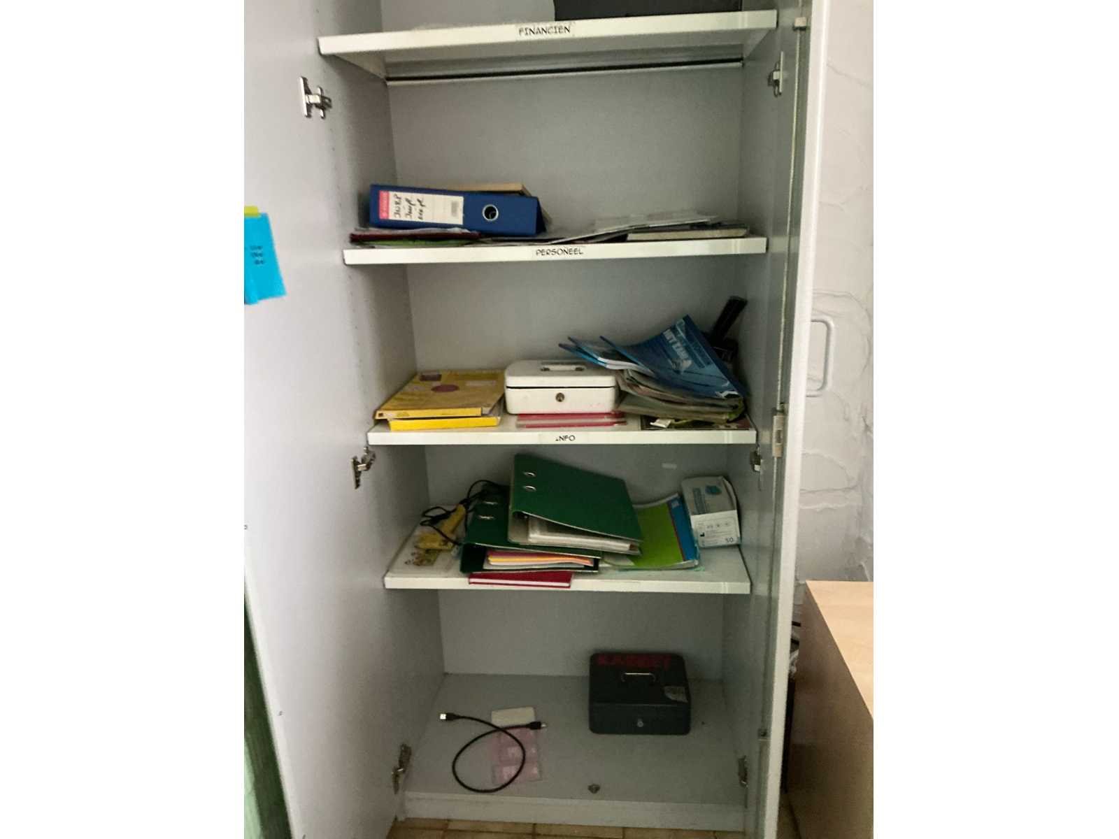 Bestaande uit 3 diverse tafels voorzien van houten bovenblad en metalen onderstel waaronder 2x afmeting circa 125 x 64 x 73 cm en 1 afmeting circa 245 x 64 x 75 cm, 2 diverse bureaustoelen, 2x verrijdbare ladeblok, houten bijzettafeltje, 2 wandleggers, formica dossierkast afmeting circa 80 x 46 x 200 cm, enige pvc legvakjes, papiersnijder, laptopventilator, enzovoort Nee