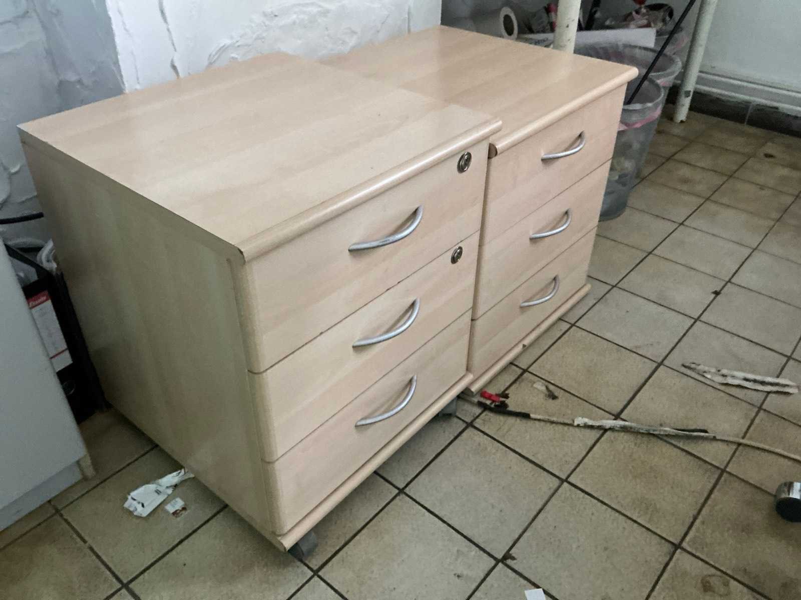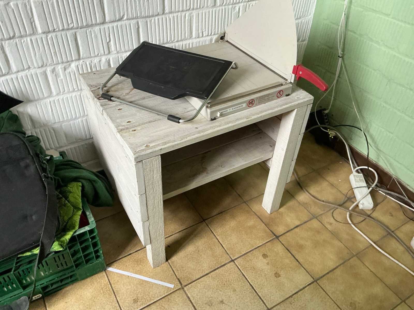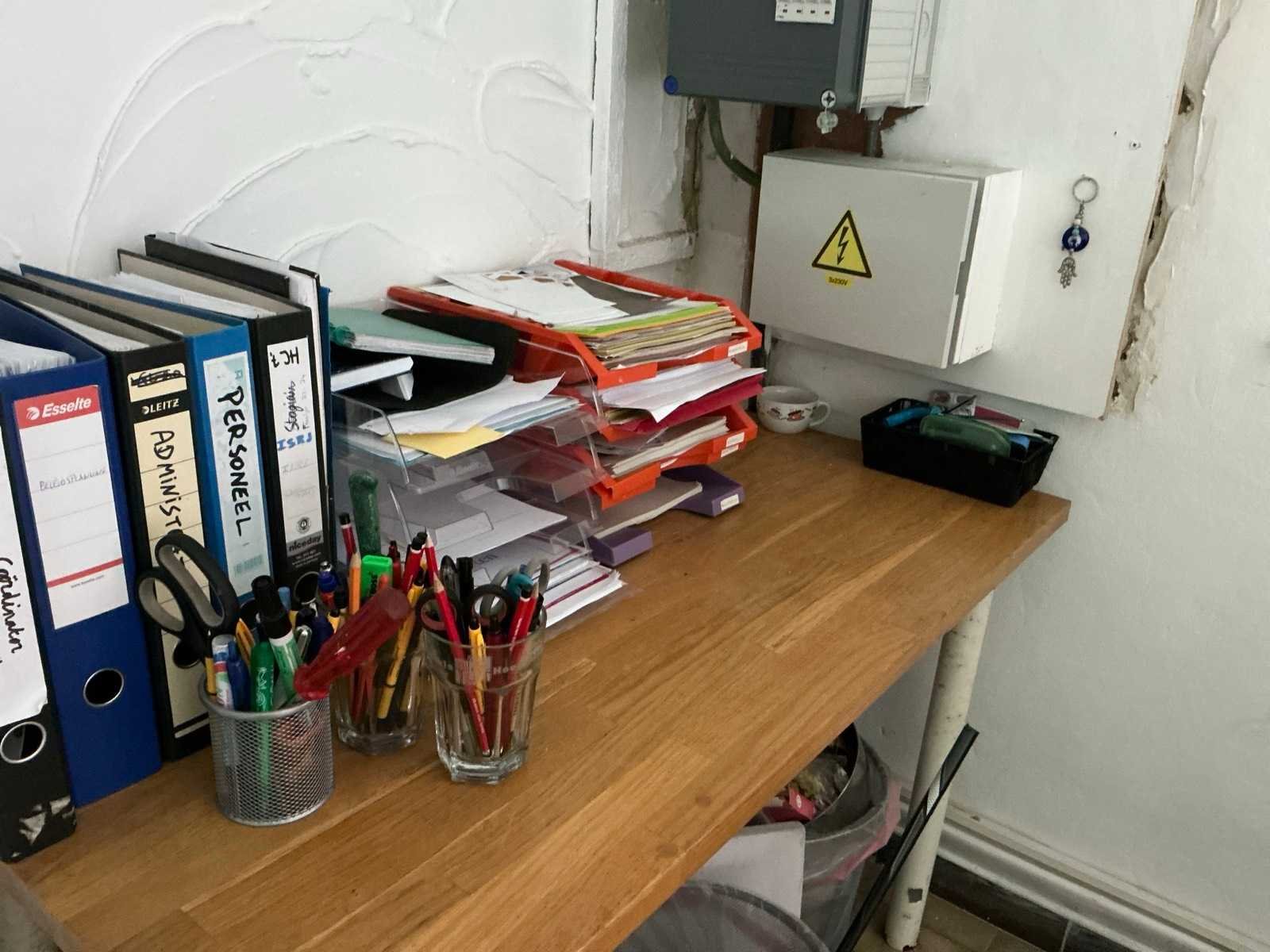 Bestaande uit 3 diverse tafels voorzien van houten bovenblad en metalen onderstel waaronder 2x afmeting circa 125 x 64 x 73 cm en 1 afmeting circa 245 x 64 x 75 cm, 2 diverse bureaustoelen, 2x verrijdbare ladeblok, houten bijzettafeltje, 2 wandleggers, formica dossierkast afmeting circa 80 x 46 x 200 cm, enige pvc legvakjes, papiersnijder, laptopventilator, enzovoort Nee