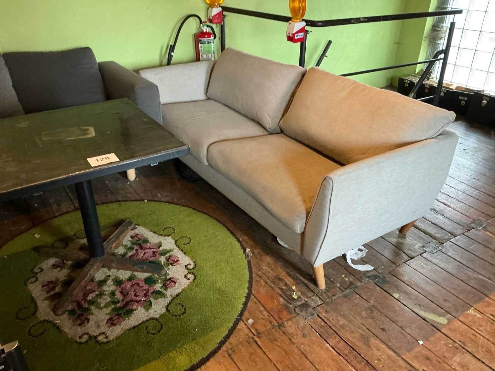 Bestaande uit 2x stoffen 2-zit, tapijt, tafel met afmeting circa 70 x 70 x 75 cm compleet met 12 diverse stoelen waaronder 5 voorzien van pvc zitting en Chrome onderstel en 6 diverse stoelen voorzien van houten zit en rug en metalen onderstel en 1 houten stoel Zich bevindend op de vlonder dient door klant via de trap verwijderd te worden. Nee