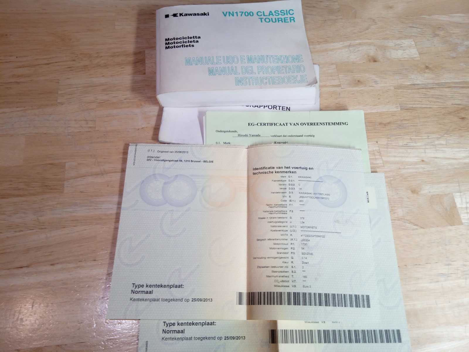Inschrijvingsbewijs deel 1 en 2 aanwezig, gelijkvormigheidsattest aanwezig kilometerstand niet afleesbaar Nee Merk: kawasaki Model: vn 1700 classic tourder Chassisnummer: JKBVNT70CCA001597 Cilinderinhoud: 1700cc Datum eerste toelating: 26/05/2009 Vermogen (kW): 54kW Boorddocumenten aanwezig?: true Aantal sleutels: 1 Startinformatie: Start niet, accu te zwak Bouwjaar: 2009
