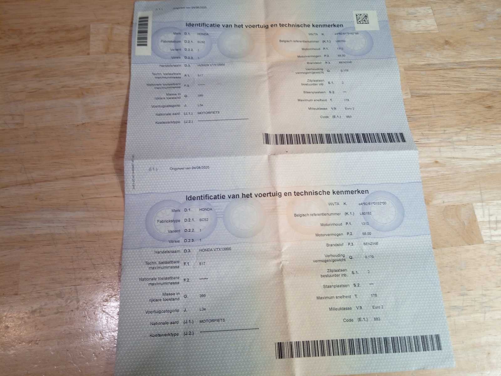Inschrijvingsbewijs deel 1 en 2 aanwezig, gelijkvormigheidsattest niet aanwezig kilometerstand niet afleesbaar Nee Merk: HONDA Model: VTX 1300 S Chassisnummer: 1HFSC52A35A200624 Cilinderinhoud: 1300cc Datum eerste toelating: 29/03/2006 Vermogen (kW): 55kW Aantal sleutels: 1 Boorddocumenten aanwezig?: true Startinformatie: Start niet, accu te zwak Bouwjaar: 2006