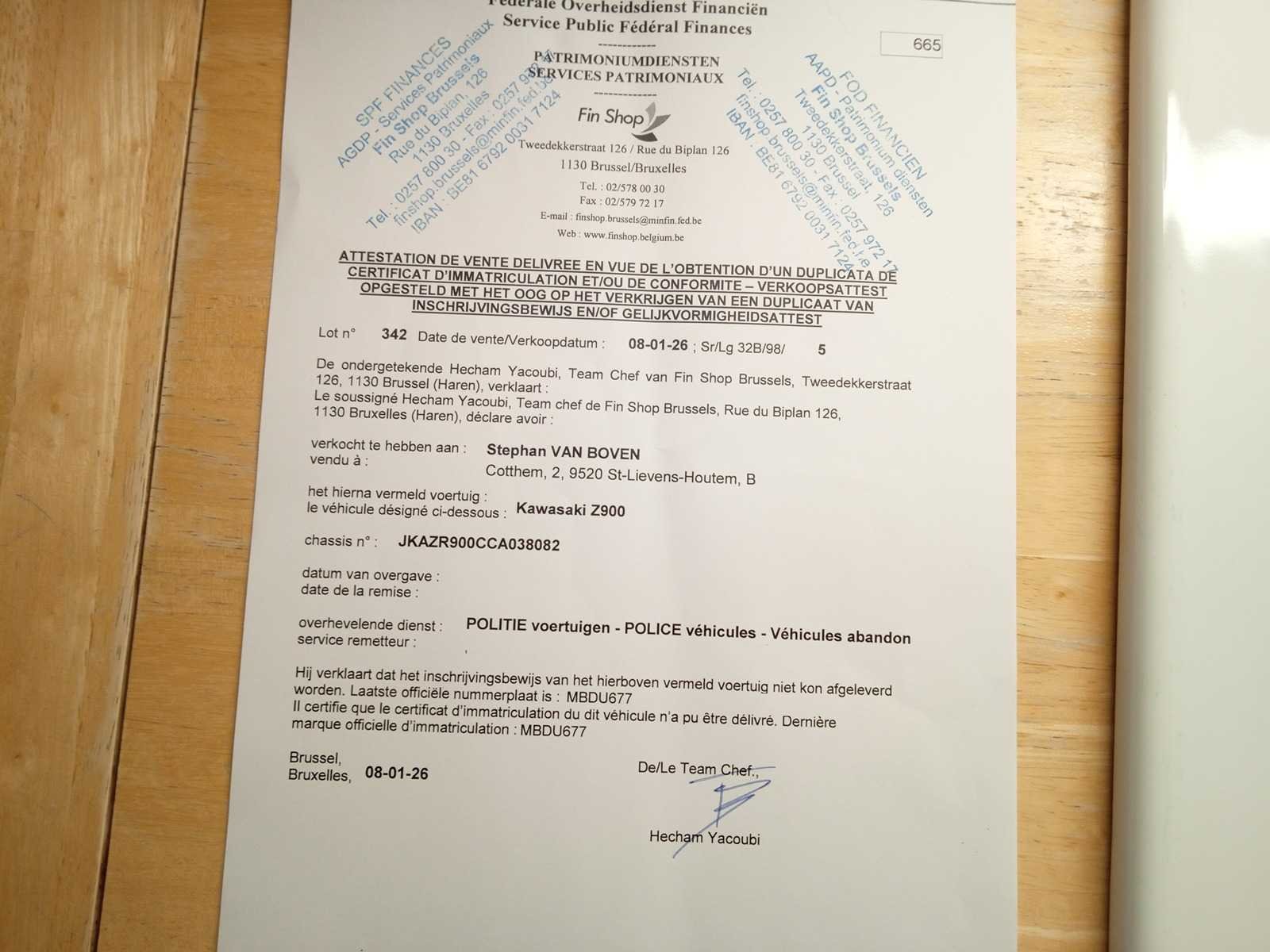 Zonder verdere gegevens boorddocumenten: verkoopsattest van politie voor aanvraag inschrijvingsbewijs. Moto heeft schade aan rechter stuur. Nee Merk: kawasaki Model: z900 rs Chassisnummer: JKAZR900CCA038082 Cilinderinhoud: 900cc Datum eerste toelating: 04/05/2020 Boorddocumenten aanwezig?: false Aantal sleutels: 1 Startinformatie: neen . accu vervangen Bouwjaar: 2020