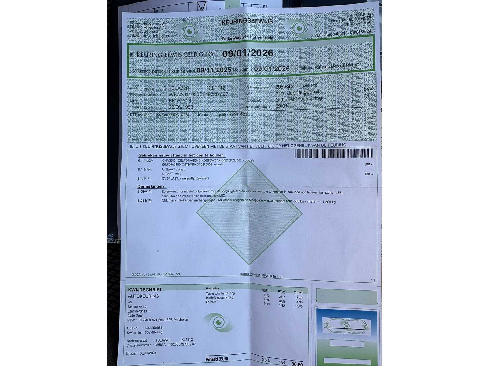 Onlangs vernieuwd: • Groot onderhoud • Brandstoftank • Viscofan • Uitlaat • Distributieriem • Hulpkoppelingcilinder • Brandstofleidingen • Remleidingen Aandachtspunten: • roestvorming ‘krikpunt’ • bestuurderszetel zitting en leuning (te lassen) • spot repair op motorkap nodig • staat 4 maand stil • geen keuring voor verkoop No Merk: BMW Type: 316i Bouwjaar: 1993 Chassisnummer: WBAAJ11020CL49730 Afgelezen kilometerstand: 296581 Model: E30 Brandstof: Benzine Datum eerste toelating: 29/06/1993 Boorddocumenten aanwezig?: true Nationaliteit documenten: België Kentekenpapieren compleet?: true Transmissie: Manueel Aantal deuren: 5 Aantal zitplaatsen: 5 Aantal sleutels: 2 Inschrijvingsbewijs - deel 1 : Aanwezig Inschrijvingsbewijs - deel 2: Aanwezig Gelijkvormigheidsattest aanwezig: true