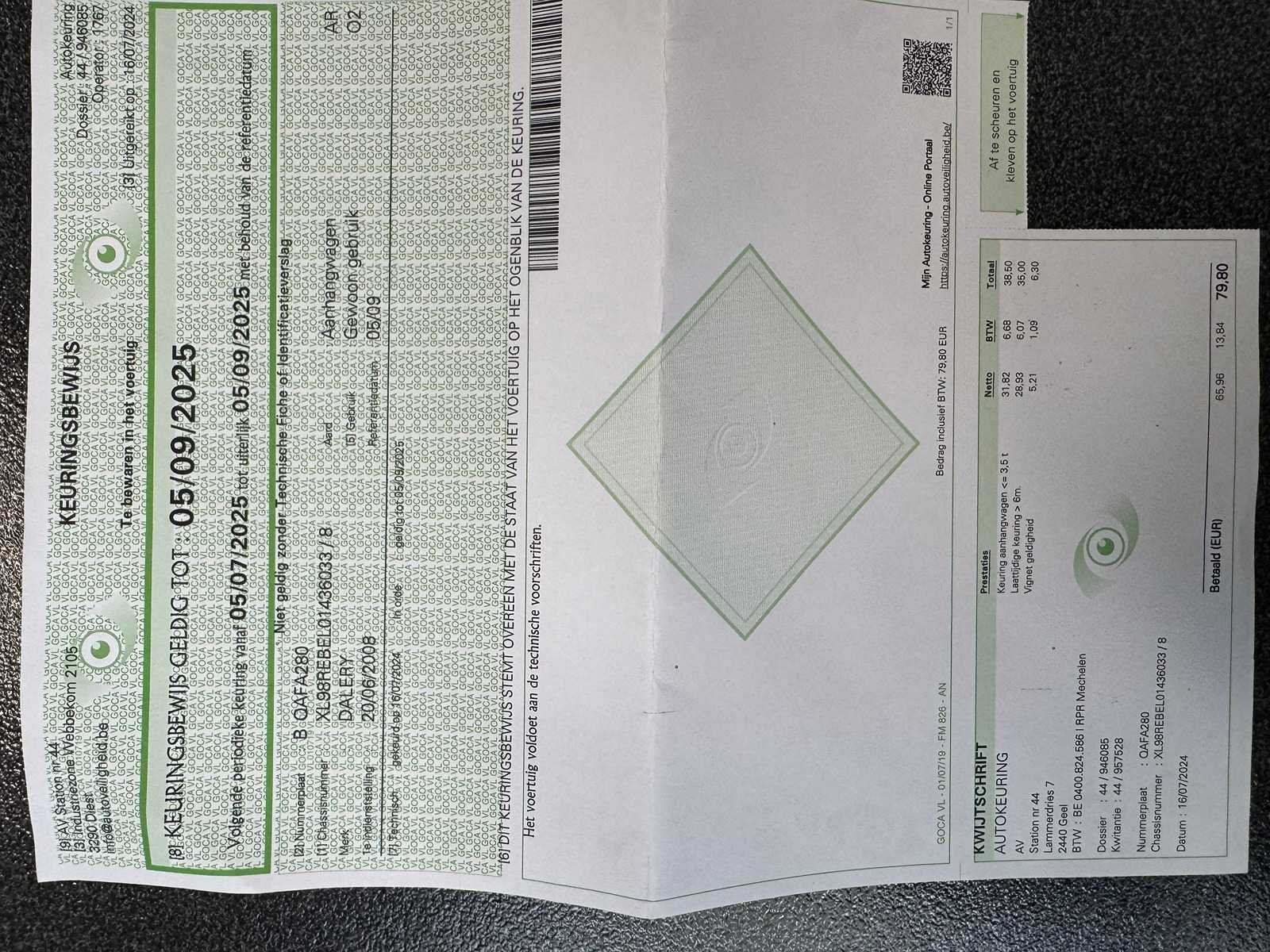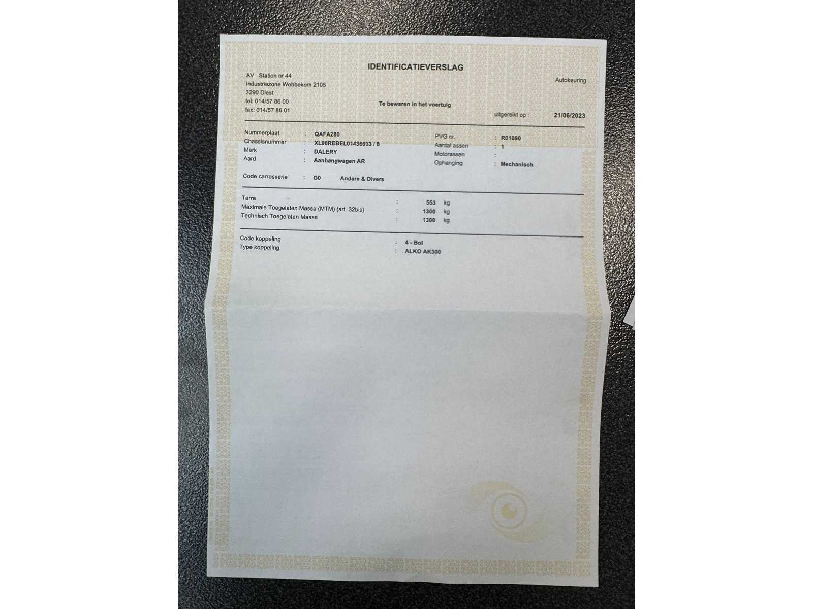 Enkelas geremde aanhangwagen Binnenafm 2m95 x 1m52 x 1m52 HTG 1300 kg Met reservewiel Aluminium velgen black Opklapbaar neuswiel Alle documenten aanwezig Nee Merk: Dalery Type: Rebel 1 Model: Gesloten Bouwjaar: 2008 Chassisnummer: XL98REBEL01436033 Aantal assen: 1 Laadbak afmeting l: 295cm Laadbak afmeting b: 152cm Ledig gewicht: 553kg Laadvermogen: 747kg Gesloten opbouw: true
