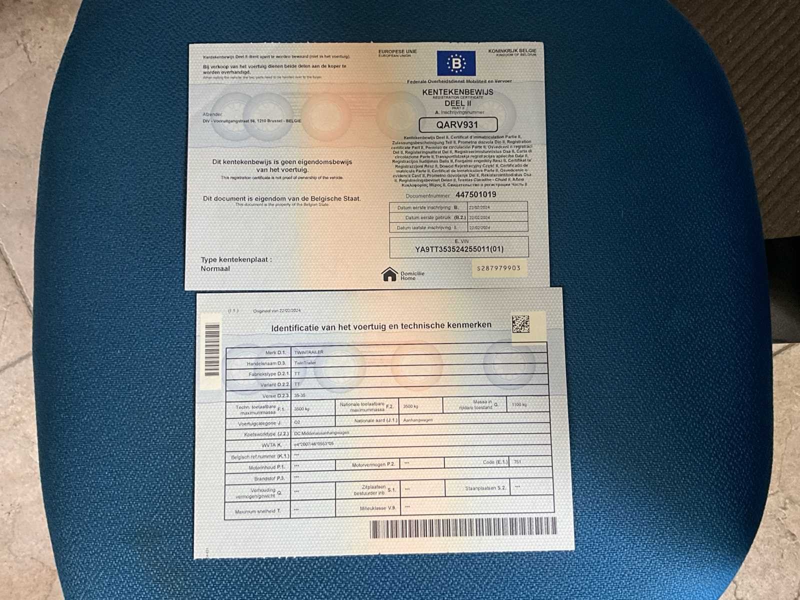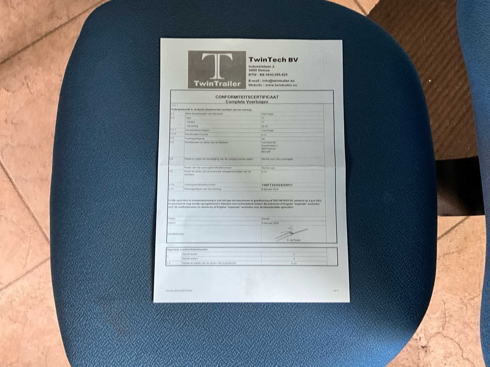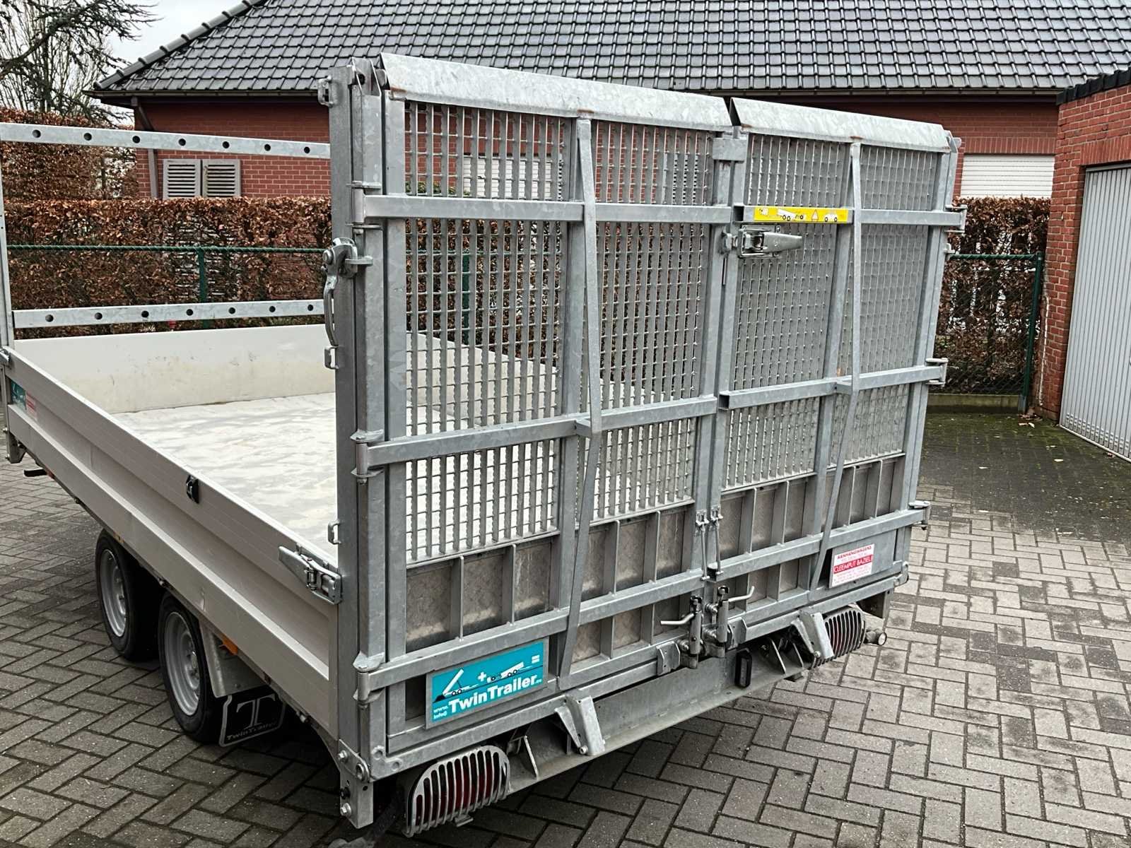 - kipper-machinelader - 2de extra batterij met druppellader - 2 zenders - reservewiel - achterlichtbescherming No Merk: TwinTrailer Type: TT Bouwjaar: 2024 Chassisnummer: YA9TT353524255011 Aantal assen: 2 Laadbak afmeting l: 350cm Laadbak afmeting b: 192cm Ledig gewicht: 1100kg Laadvermogen: 2400kg Datum eerste toelating: 22/02/2024 Nationaliteit documenten: Belgie