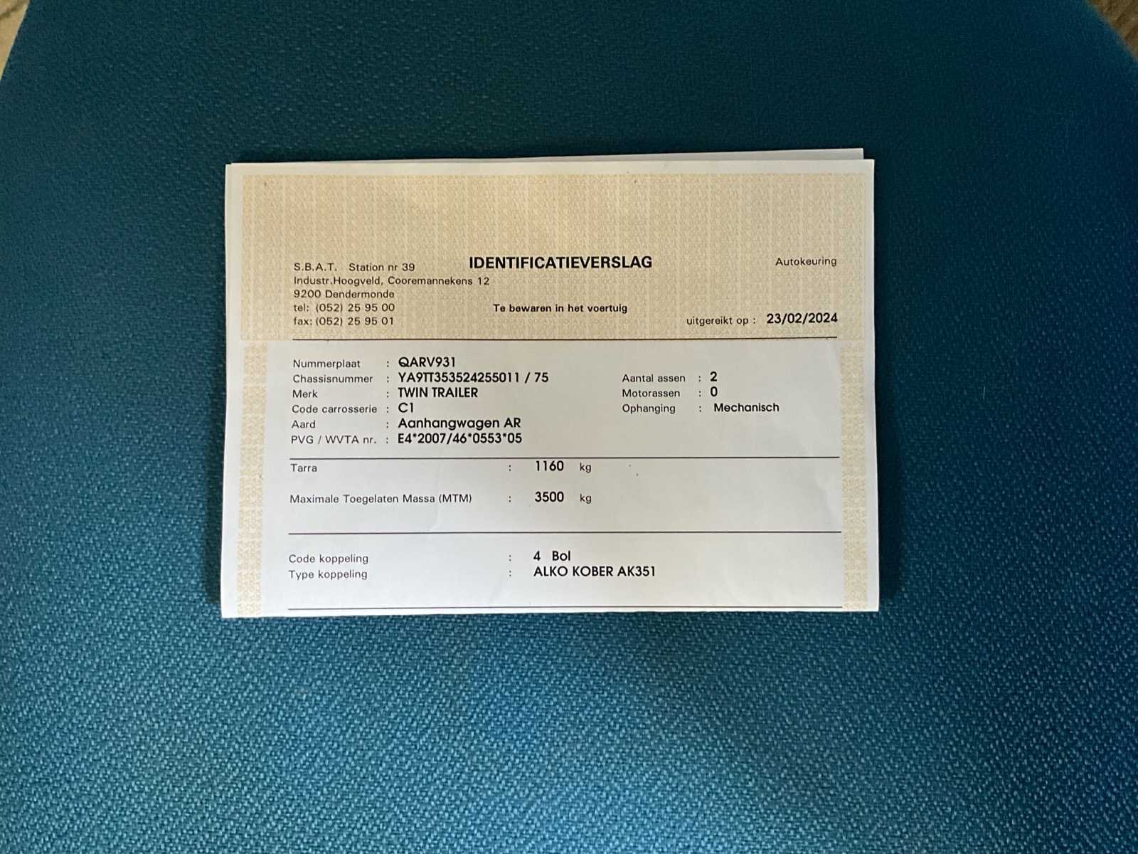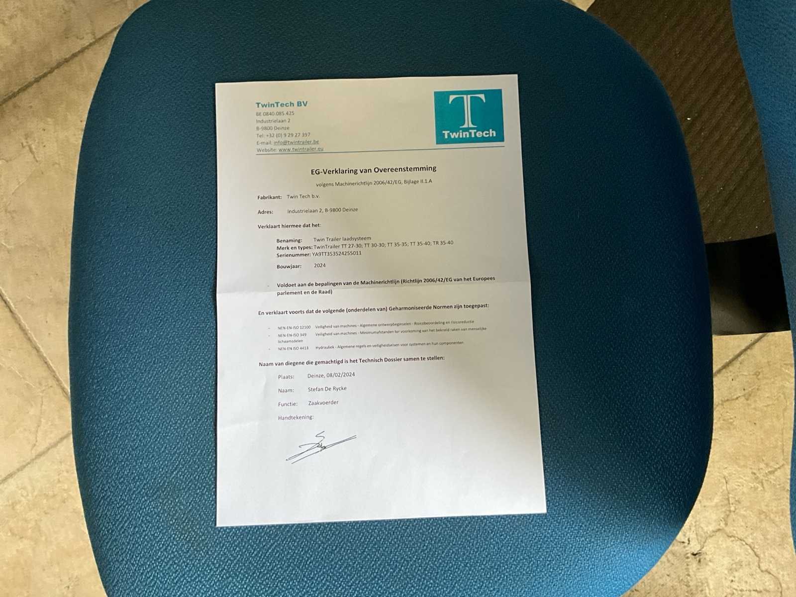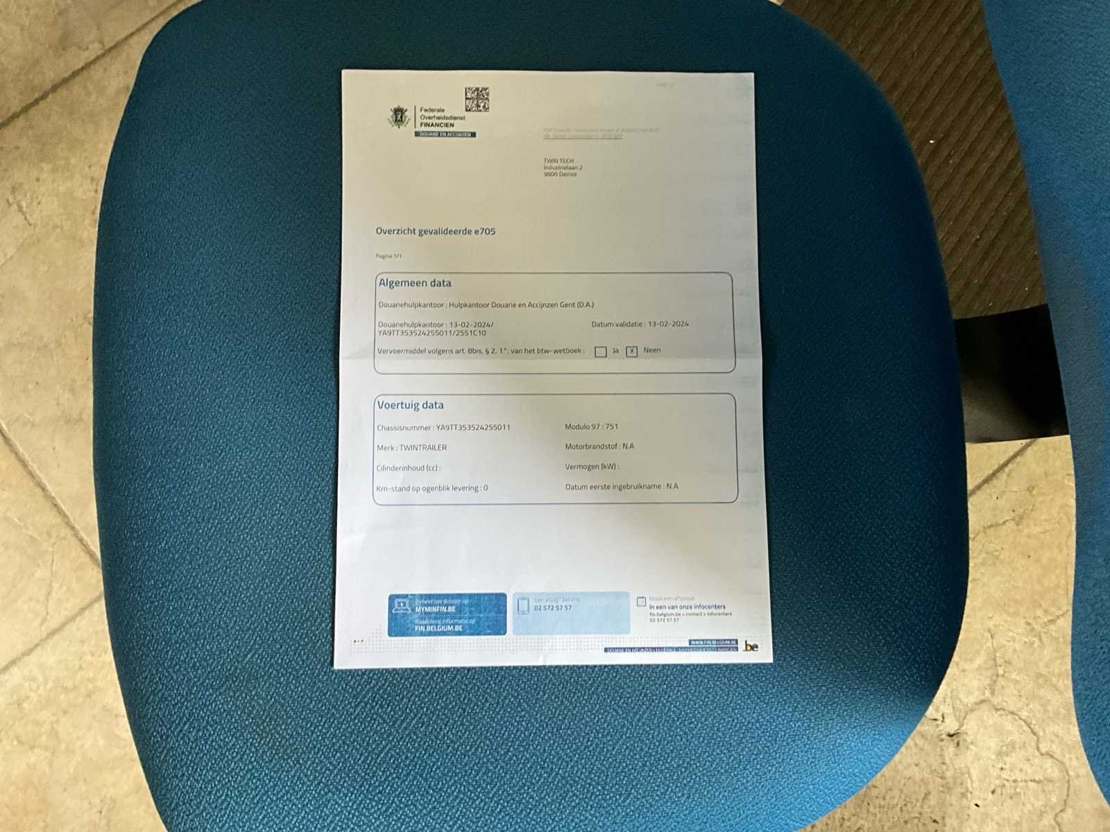 - kipper-machinelader - 2de extra batterij met druppellader - 2 zenders - reservewiel - achterlichtbescherming No Merk: TwinTrailer Type: TT Bouwjaar: 2024 Chassisnummer: YA9TT353524255011 Aantal assen: 2 Laadbak afmeting l: 350cm Laadbak afmeting b: 192cm Ledig gewicht: 1100kg Laadvermogen: 2400kg Datum eerste toelating: 22/02/2024 Nationaliteit documenten: Belgie