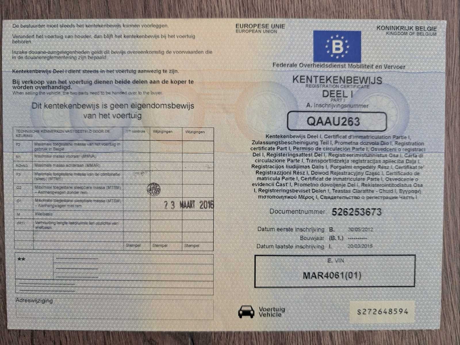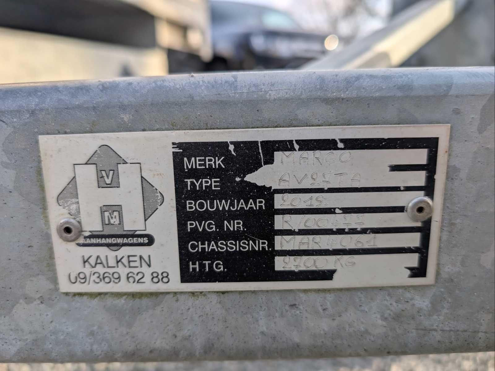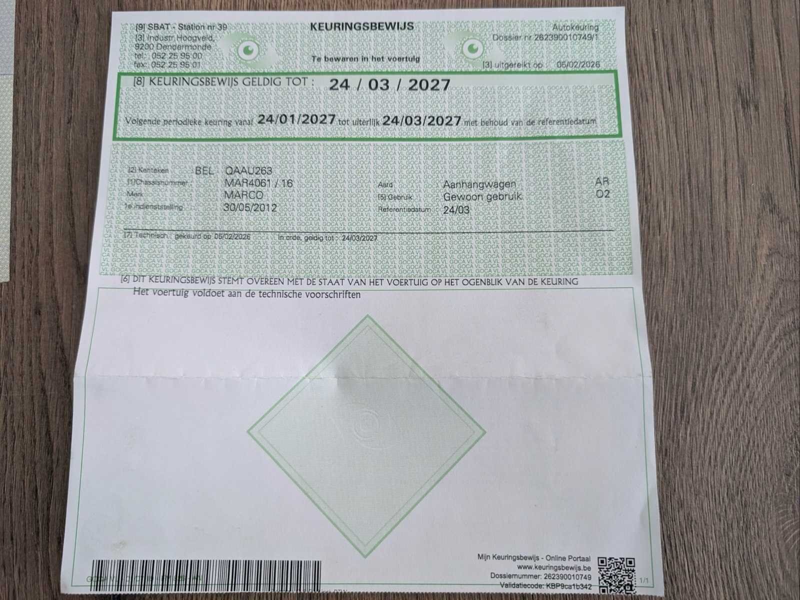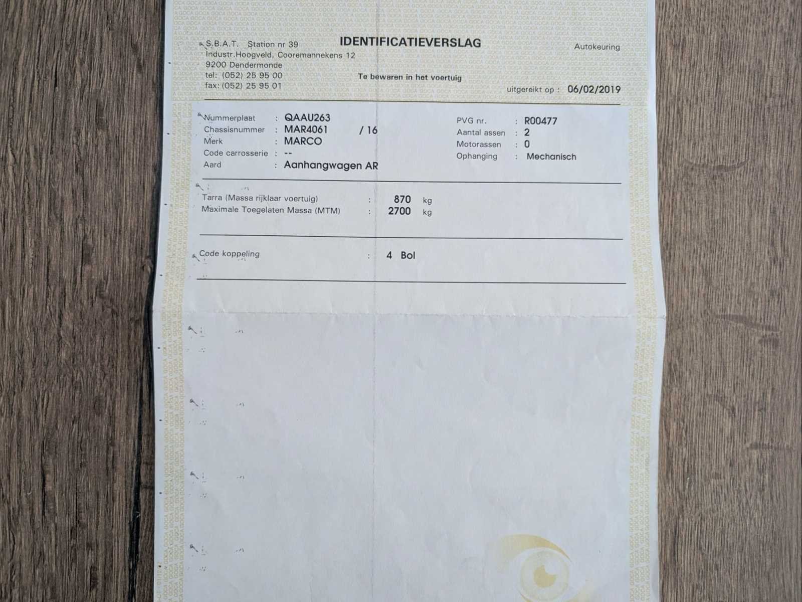 Deze aanhangwagen is waterdicht en blanco gekeurd. No Merk: Marco Type: AV27TA Bouwjaar: 2012 Chassisnummer: MAR4061 Aantal assen: 2 Ledig gewicht: 870kg Laadvermogen: 1830kg Datum eerste toelating: 30/05/2012 Hoogte: 185cm Lengte: 317cm Breedte: 180cm Nationaliteit documenten: Belgie