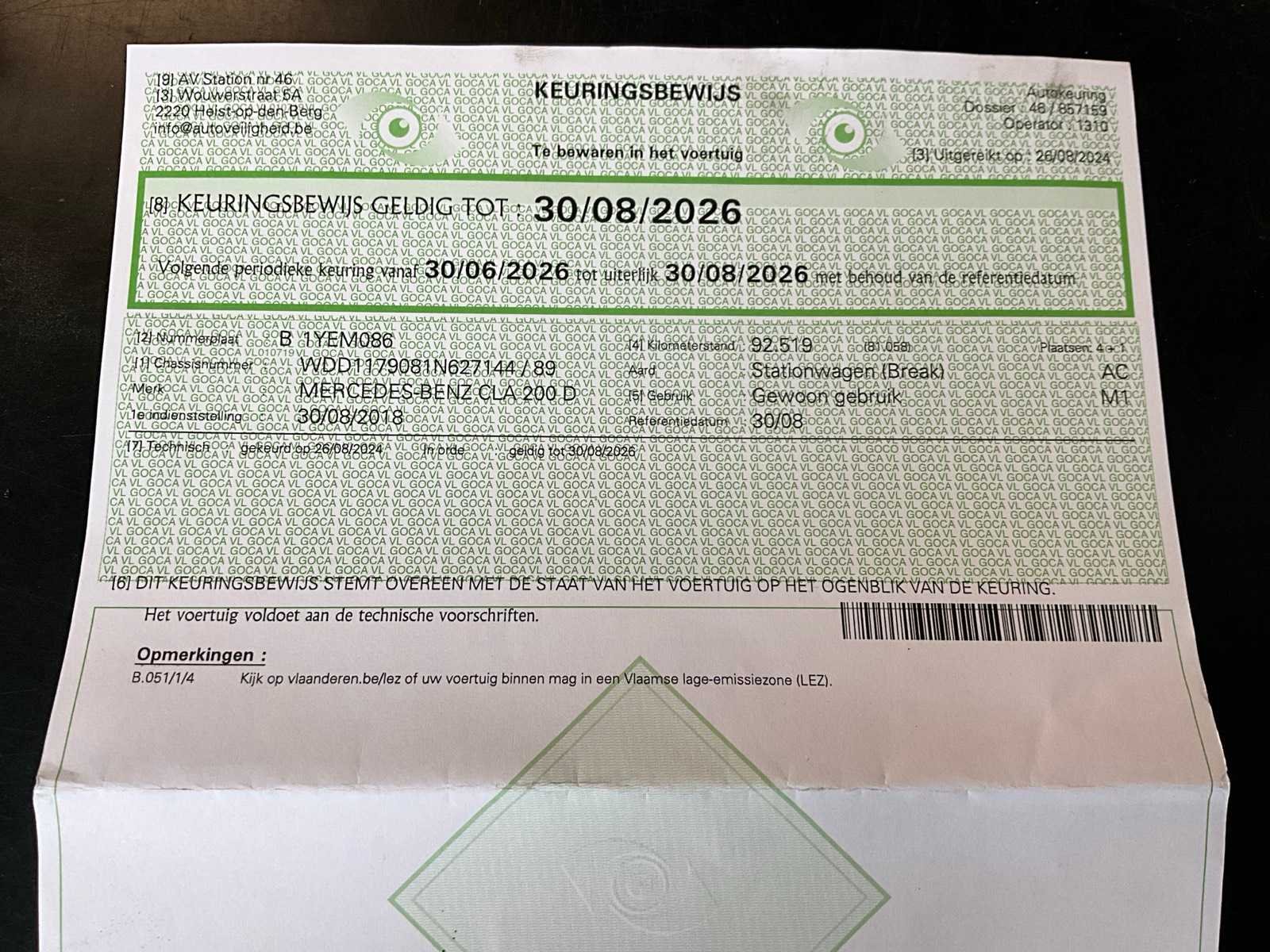 Stap in stijl met deze Mercedes-Benz CLA 200 d Shooting Brake AMG-Line uit 2018. Een perfecte combinatie van sportiviteit, luxe en praktische ruimte – afgewerkt in een elegante donkerblauwe lak met 18” AMG-velgen. Deze Shooting Brake biedt het beste van twee werelden: het dynamische design van een coupé én de functionaliteit van een ruime stationwagen. Bij koude start geeft de Mercedes Star-diagnose een foutmelding betreffende de injector van cilinder 4. Dit is voelbaar/hoorbaar bij koude motor. Zodra de motor op temperatuur komt (+/- 35°C en volledig normaal bij 80°C), rijdt en schakelt de wagen volledig normaal. ✔️ Geen olieverbruik ✔️ Geen zwarte rook ✔️ Motor loopt perfect bij warme toestand Wagen is perfect rijdbaar. Eventuele optimalisatie kan door toekomstige eigenaar bekeken worden - Algemene staat: Carrosserie volledig intact (geen steenslag), Geen schade, Interieur zeer netjes, Enkel lichte gebruikssporen op velgen, Sportieve en stijlvolle uitstraling - Multimedia & Comfort: Centrale display FM radio / Media interface Bluetooth telefonie Airconditioning met A/C Achteruitrijcamera met hulplijnen Parkeersensoren Elektrische ramen Elektrische spiegels Cruise control Boordcomputer - Veiligheid: ABS ESP Meerdere airbags ISOFIX Automatische verlichting Bandenspanningscontrole - Documenten & Historiek: Belgische wagen Ingeschreven sinds 30/08/2018 Laatste inschrijving: 05/08/2020 Keuring geldig tot 30/08/2026 Kentekenbewijs aanwezig Nee Merk: Mercedes-Benz Model: CLA200D Type: break Bouwjaar: 2018 Afgelezen kilometerstand: 98567km Cilinderinhoud: 2143cc Vermogen (kW): 100kW Brandstof: diesel Chassisnummer: WDD1179081N627144 Chassisnummer niet afleesbaar: true Datum eerste toelating: 30/8/2016 Aantal zitplaatsen: 5 Kleur: blauw Transmissie: Automaat Emissieklasse: Euro 6b Aantal deuren: 5 Aantal sleutels: 2 Nationaliteit documenten: B Gelijkvormigheidsattest aanwezig: true Start en rijdt: ja Keuringsrapport geldig tot: 30/8/2026 Vavato voert geen technische keuring uit.: true Inschrijvingsbewijs - deel 1 : Aanwezig Inschrijvingsbewijs - deel 2: Aanwezig