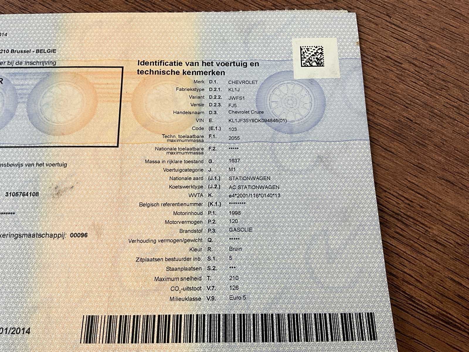 No Merk: Chevrolet Model: Cruze Bouwjaar: 2014 Afgelezen kilometerstand: 200865km Cilinderinhoud: 1998cc Vermogen (kW): 120kW Brandstof: Gasolie Chassisnummer: 4846