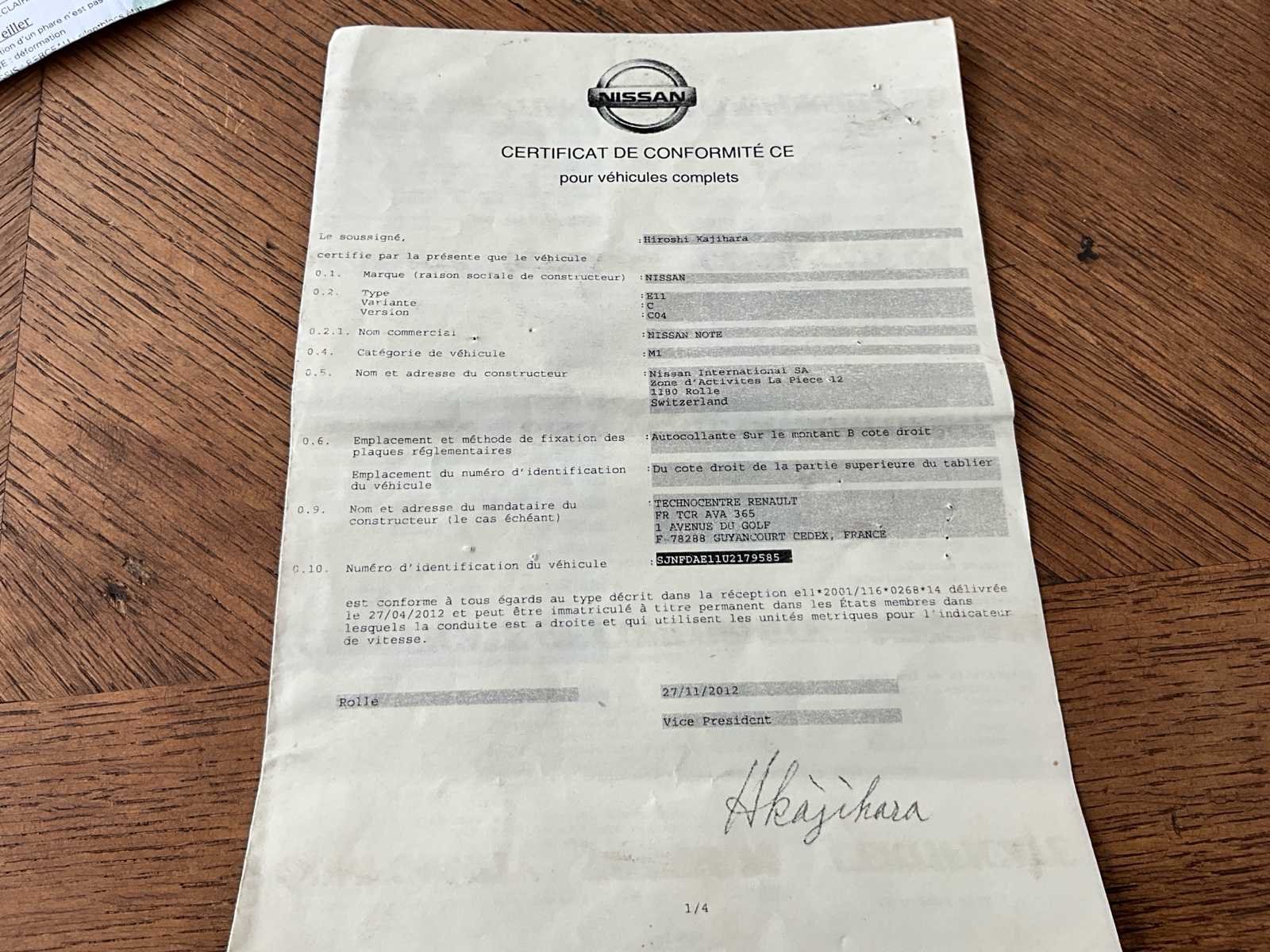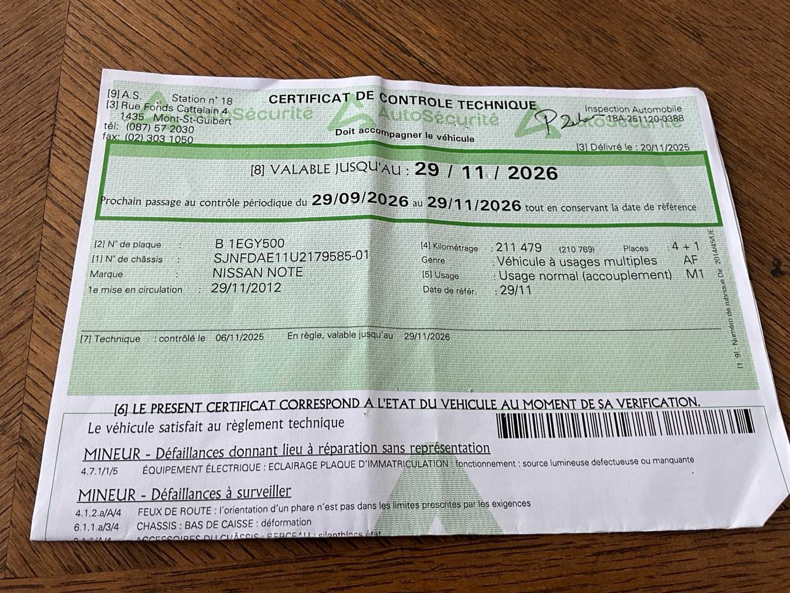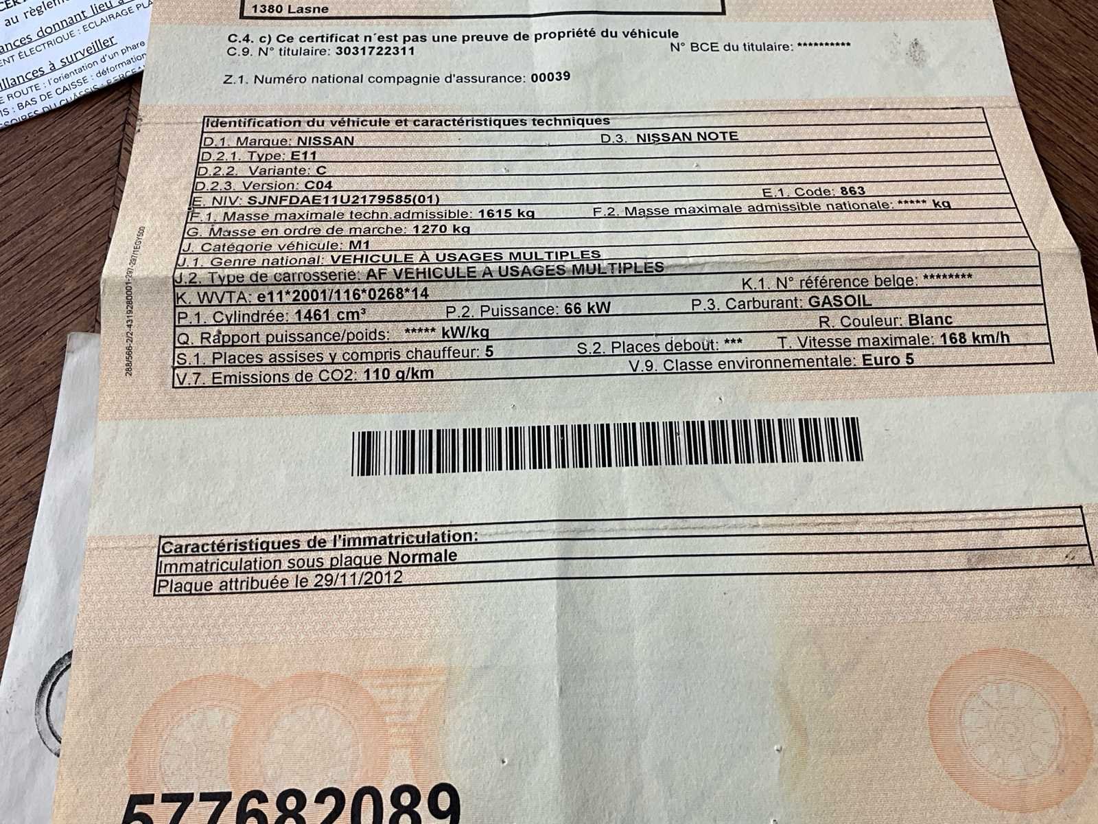 No Merk: Nissan Model: Note Bouwjaar: 2012 Afgelezen kilometerstand: 214070km Cilinderinhoud: 1461cc Vermogen (kW): 66kW Brandstof: Gasolie Chassisnummer: 9585