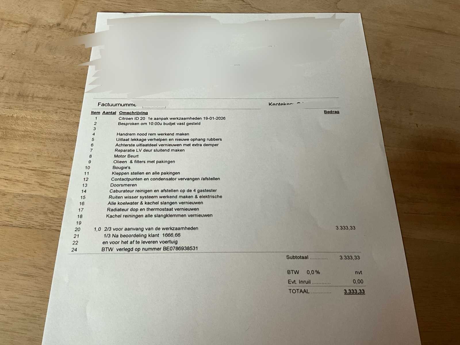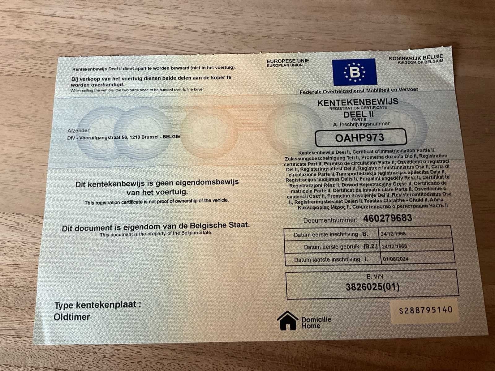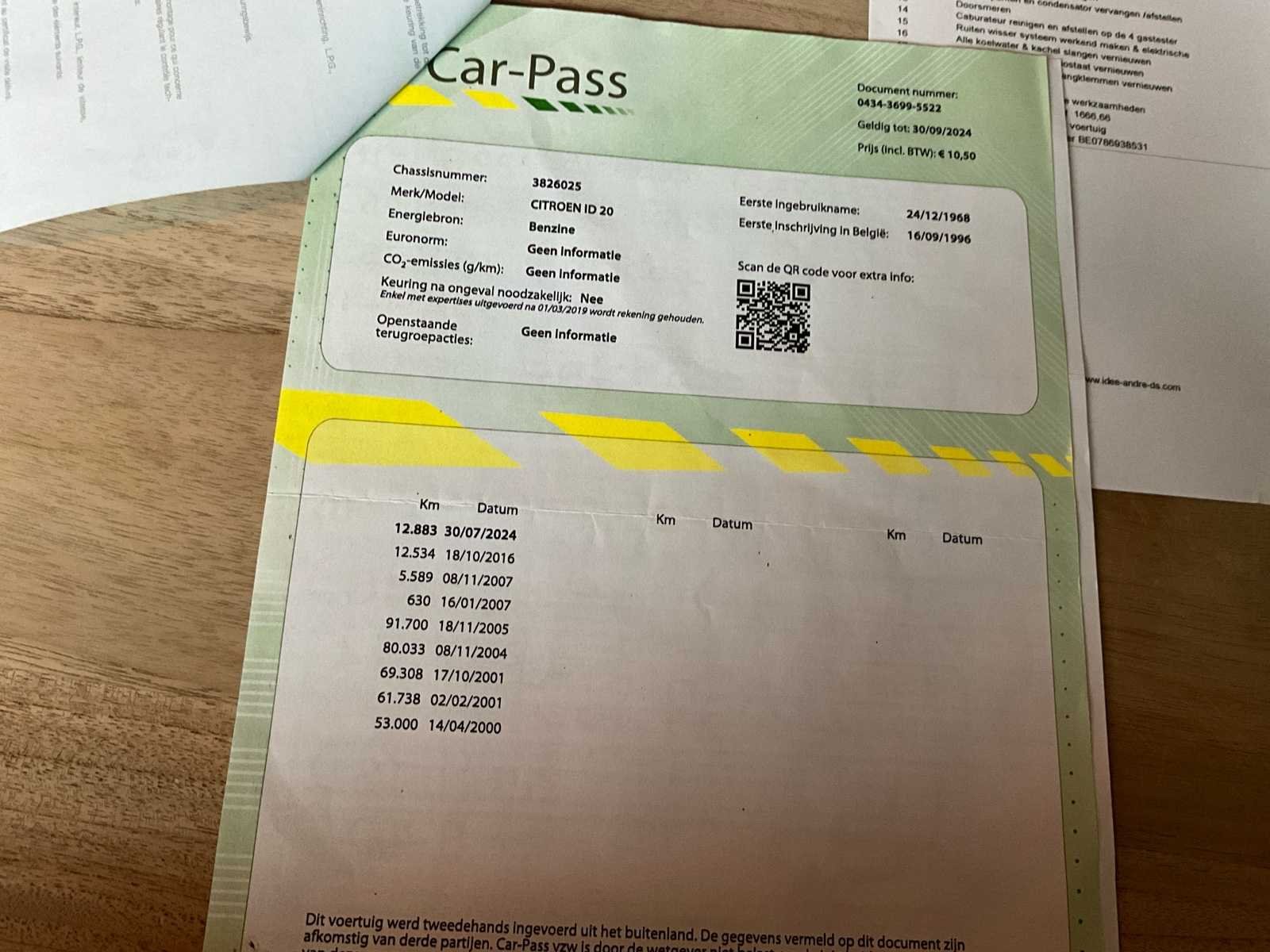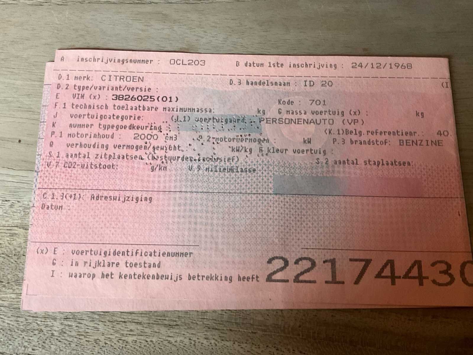 Carrosserie professioneel hersteld waar nodig. Volledig onderhoud uitgevoerd. Nieuwe matenset gemonteerd. Radiateurdop en thermostaat vernieuwd. Alle koelwater- en kachelslangen vernieuwd. Kachel gereinigd en alle slangklemmen vernieuwd. Carburateur gereinigd en professioneel afgesteld op een 4-gastester. Kleppen gesteld en alle pakkingen gecontroleerd/vernieuwd waar nodig. Bougies vernieuwd. Vier nieuwe banden geplaatst. Handrem volledig werkend gemaakt. Uitlaatsysteem hersteld. Oliefilters vernieuwd. Voertuig start, rijdt en functioneert naar behoren. Nee Merk: CITROEN Type: DS20 Bouwjaar: 1968 Chassisnummer: 3826025 Brandstof: benzine Datum eerste inschrijving: 24/12/1968 Datum eerste toelating: 24/12/1968 Boorddocumenten aanwezig?: true Nationaliteit documenten: belg Carrosserie: Oldtimer Transmissie: manueel Aantal deuren: 5 Aantal zitplaatsen: 5 Stuurwiel: links Aantal sleutels: 1 Startinformatie: start en rijd Inschrijvingsbewijs - deel 1 : ok Inschrijvingsbewijs - deel 2: ok Gelijkvormigheidsattest aanwezig: true