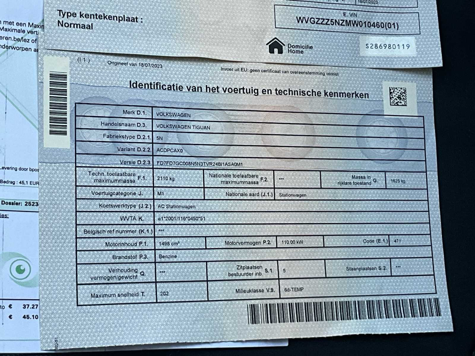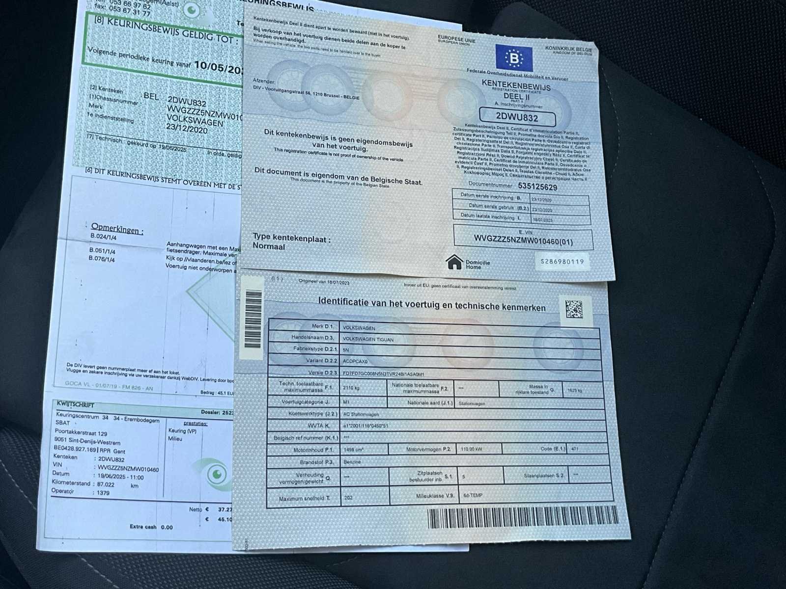 Merk • Volkswagen Model / Handelsnaam • Volkswagen Tiguan Voertuigcategorie • M1 – Personenwagen • Nationale aard: Stationwagen Koetswerktype • AC – Stationwagen ⸻ 🔢 IDENTIFICATIE Chassisnummer (VIN) • WVGZZZ5NZMW010460 (bevestigd op: • kentekenbewijs • technische fiche • zichtbaar in de voorruit) Belgische nummerplaat • 2DWU832 Type kentekenplaat • Normaal ⸻ 📅 DATA Datum eerste inschrijving • 23/12/2020 Datum laatste inschrijving • 18/07/2023 Bouwjaar • 2020 ⸻ 🧾 KEURING Keuringsbewijs geldig tot • 10/07/2027 Volgende periodieke keuring • vanaf 10/05/2027 • uiterlijk 10/07/2027 Laatste keuring • 19/06/2025 • Kilometerstand bij keuring: 87.022 km ⸻ ⚙️ TECHNISCHE GEGEVENS Motor • Cilinderinhoud: 1.498 cm³ • Brandstof: Benzine • Vermogen: 110 kW (≈ 150 pk) Emissie / milieu • Milieuklasse: Euro 6d-TEMP Maximum snelheid • 202 km/u ⸻ ⚖️ GEWICHTEN Technisch toelaatbare maximummassa (F.1) • 2.110 kg Massa rijklaar (G) • 1.625 kg ⸻ 🪑 CAPACITEIT Zitplaatsen • 5 zitplaatsen (incl. bestuurder) Staanplaatsen • Niet van toepassing ⸻ 🔑 TOEBEHOREN • 2 originele Volkswagen sleutels (afstandsbediening) ⸻ 📄 DOCUMENTEN AANWEZIG ✅ Belgisch kentekenbewijs (deel I) ✅ Identificatie- en technische fiche ✅ Keuringsbewijs ✅ Keuringskwitantie ✅ Sleutels (2x) No Merk: Volkswagen Model: Tiguan Bouwjaar: 2020 Cilinderinhoud: 1498cc Vermogen (kW): 150kW Brandstof: Benzine Aantal zitplaatsen: 5 Transmissie: Automaat Emissieklasse: 6D Aantal deuren: 5 Aantal sleutels: 2 Nationaliteit documenten: Belg Start en rijdt: Ja Vavato voert geen technische keuring uit.: true Inschrijvingsbewijs - deel 1 : Aanwezig Inschrijvingsbewijs - deel 2: Aanwezig