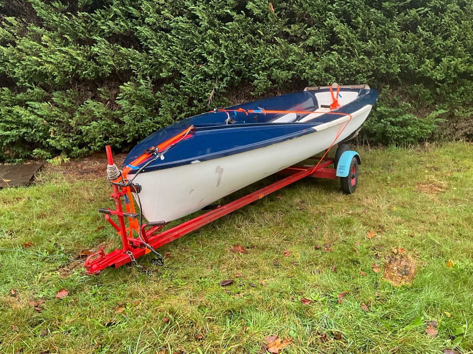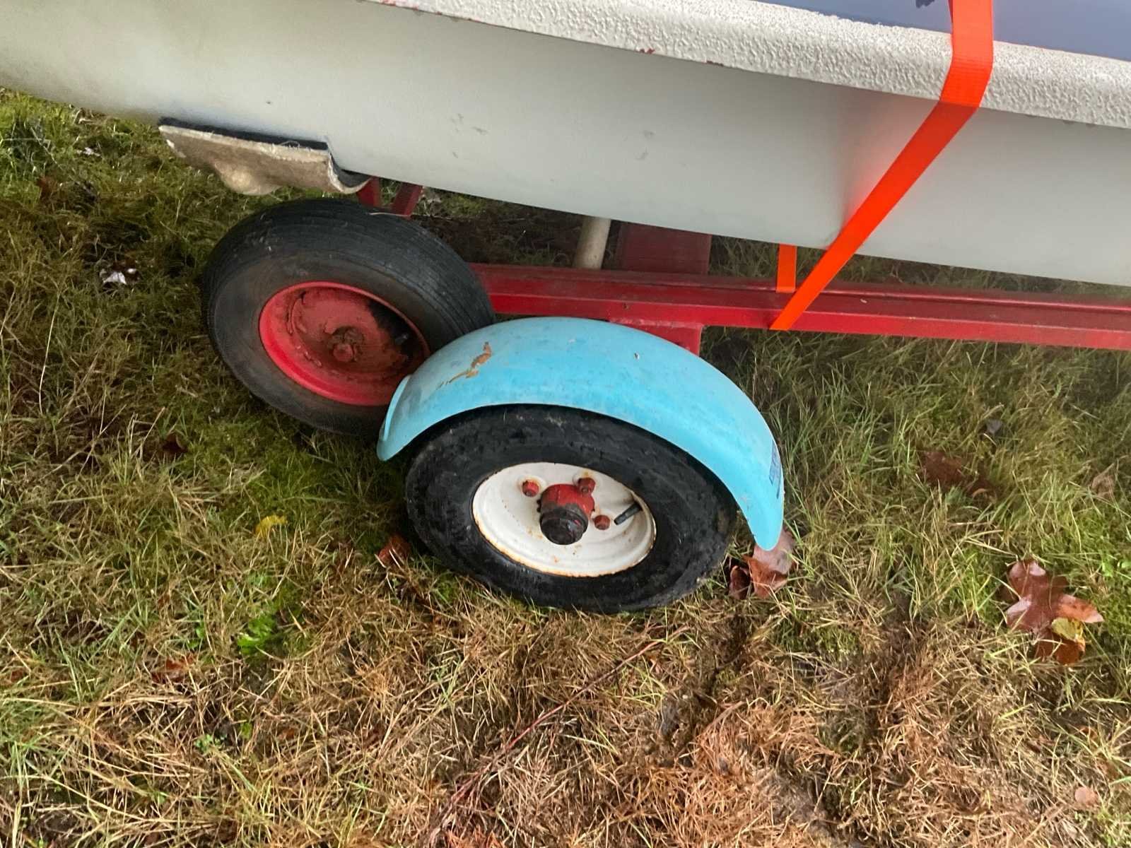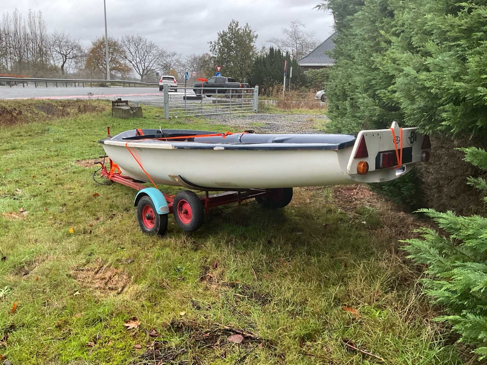 BOOT — TECHNISCHE INFO (geschat op basis van foto’s) • Type: Kleine zeilboot / polyester open zeilboot • Kleur: Wit met blauw dek • Lengte: ± 4,5 – 5,0 meter • Breedte: ± 1,5 meter • Materiaal: Polyester • Staat: • Romp volledig aanwezig • Enkele krassen / gelcoat schade zichtbaar • Geen zichtbare scheuren in romp • Oppervlakkige verwering door buitenstaan • Binnenkant algemeen oké No