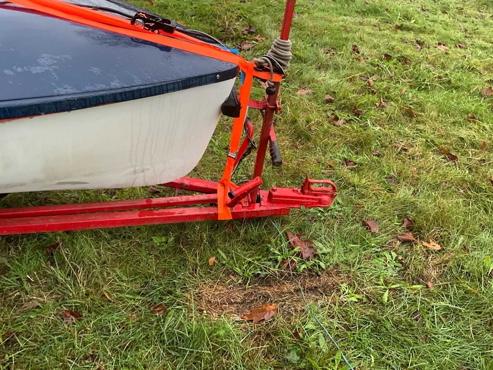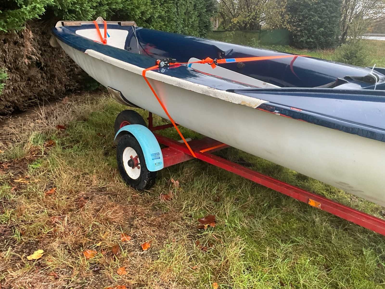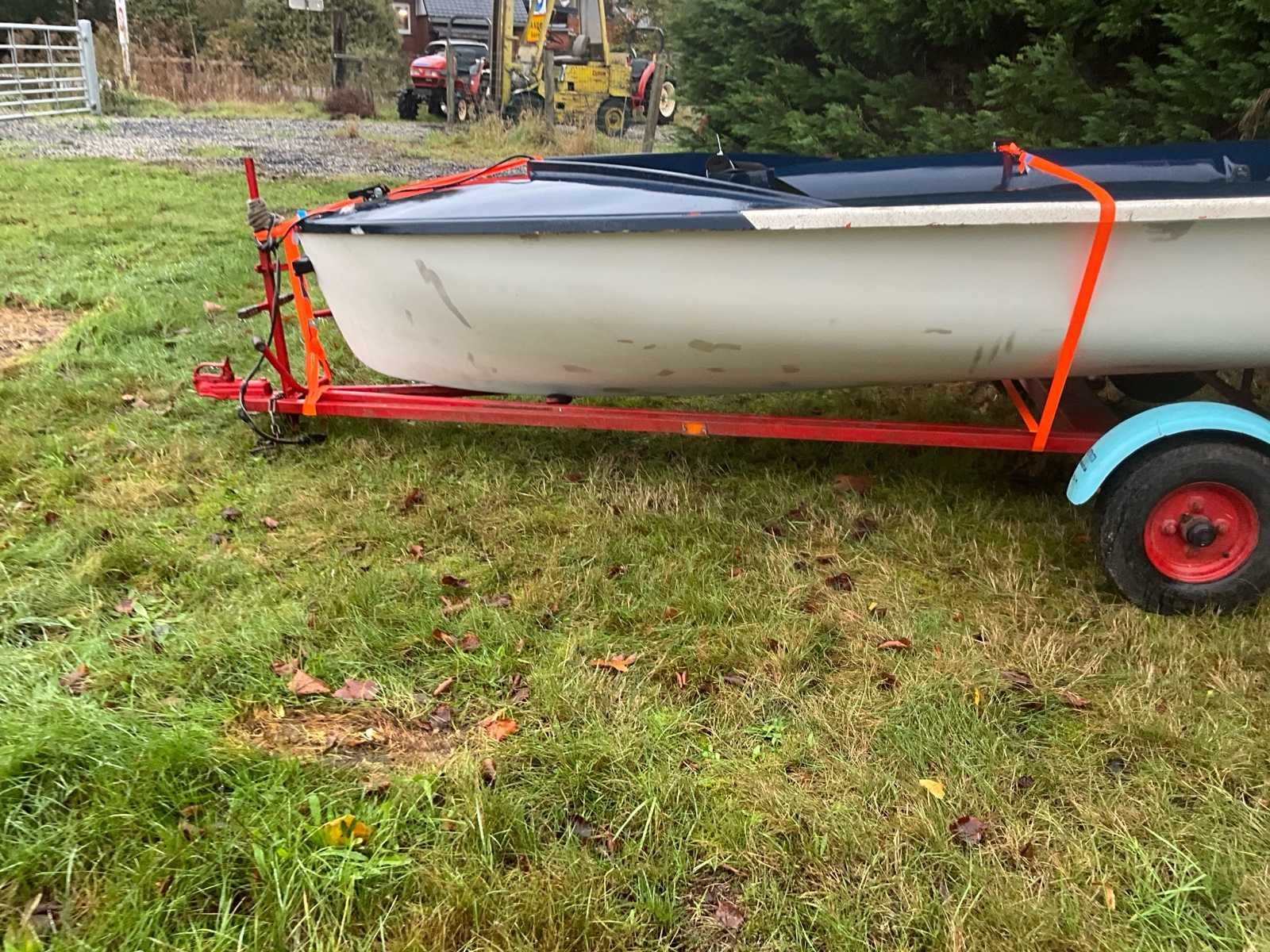 BOOT — TECHNISCHE INFO (geschat op basis van foto’s) • Type: Kleine zeilboot / polyester open zeilboot • Kleur: Wit met blauw dek • Lengte: ± 4,5 – 5,0 meter • Breedte: ± 1,5 meter • Materiaal: Polyester • Staat: • Romp volledig aanwezig • Enkele krassen / gelcoat schade zichtbaar • Geen zichtbare scheuren in romp • Oppervlakkige verwering door buitenstaan • Binnenkant algemeen oké No