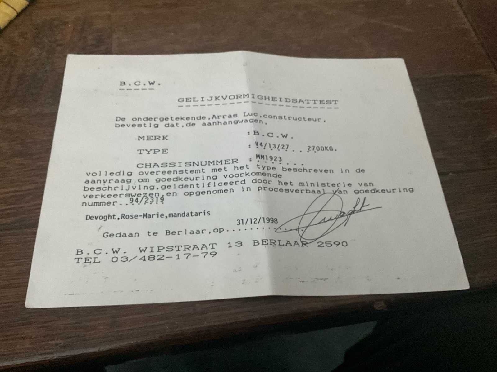Merk: BCW Chassisnummer: MM1923/45 Datum eerste inschrijving: 14/04/2000 Type voertuig: Aanhangwagen (AR) Gebruik: Gewoon gebruik Referentiedatum: 17/02 Keuringsbewijs geldig tot: 17/02/2026 Nee Merk: BCW Bouwjaar: 2000 Chassisnummer: MM1923/45 Nationaliteit documenten: belg