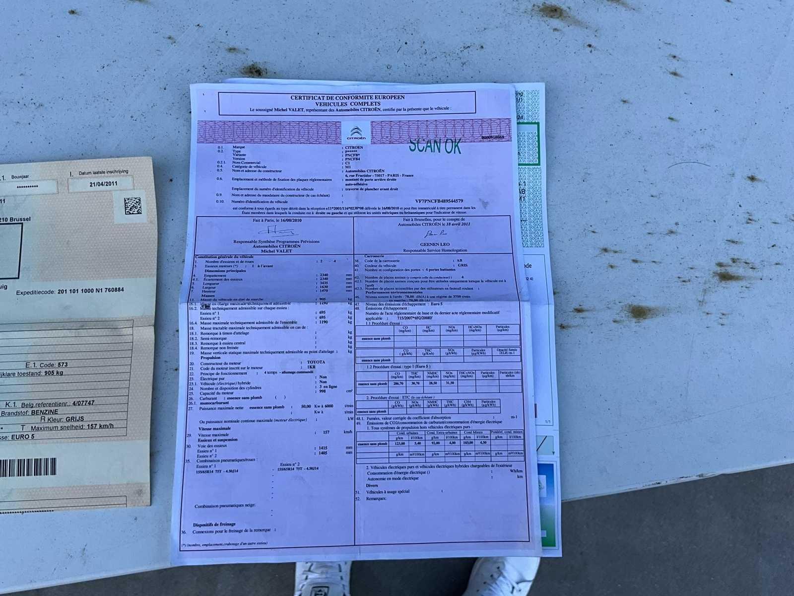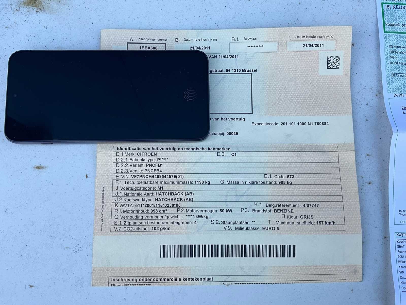 Registratie & Identificatie • Merk: Citroën • Inschrijvingsnummer: • Datum eerste inschrijving: 21/04/2011 • Datum laatste inschrijving: 21/04/2011 • VIN / Chassisnummer: VF7PNCFB4B89454579 ⸻ 📊 Technische Kenmerken • Model / Variant: PNCFB • Versie: PNCFB4 • Voertuigcategorie: M1 • Koetswerktype: Hatchback (AB) • Nationale aard: Hatchback (AB) Motor & Rijprestaties • Motorinhoud: 998 cm³ • Vermogen: 50 kW • Brandstof: Benzine • Max. snelheid: 157 km/h • CO₂-uitstoot: 103 g/km • Milieuklasse: Euro 5 ⸻ Gewichten • Technisch toelaatbare max. massa: 1190 kg • Massa in rijklare toestand: 905 kg ⸻ Kleur & Uitvoering • Kleur: Grijs • Zitplaatsen bestuurder + passagiers: 4 • Type: Hatchback Nee Merk: Citroën Model: C1 Bouwjaar: 2011 Cilinderinhoud: 998cc Vermogen (kW): 50kW Brandstof: benzine Chassisnummer: VF7PNCFB4B89454579 Transmissie: handgeschakkeld Emissieklasse: 5 Aantal deuren: 5 Aantal sleutels: 2 CO2-uitstoot NEDC: 103 Start en rijdt: ja Vavato voert geen technische keuring uit.: true Inschrijvingsbewijs - deel 1 : aanwezig Inschrijvingsbewijs - deel 2: aanwezig