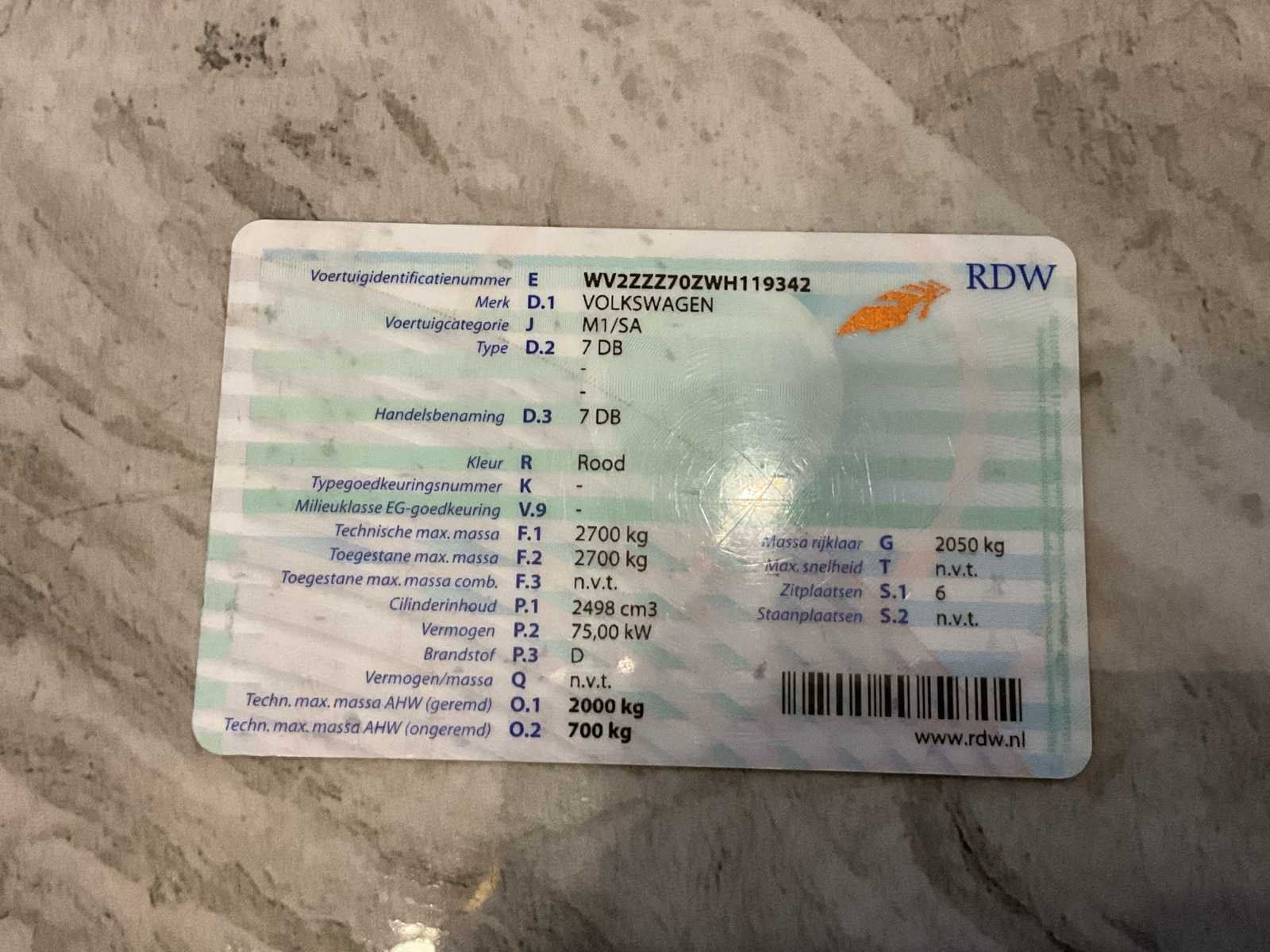 Start rijd en doet wat hij moet doen 4 nieuwe nieuwe 4 nieuwe velgen Nieuwe achterremschijfen voor en achter Nieuwe radiateur Nieuwe koppelingset met vliegwiel Kleine onderhoud is geven Nee Merk: Volkswagen Model: Transporter (T4) Bouwjaar: 1998 Afgelezen kilometerstand: 543000km Cilinderinhoud: 2498cc Vermogen (kW): 75kW Brandstof: diesel Chassisnummer: WV2ZZZ70ZWH119342 Datum eerste toelating (NL): 22/10/2001 Kleur: rood Transmissie: handgeschakkeld Stuurwiel: links Aantal sleutels: 2 Start en rijdt: ja Vavato voert geen technische keuring uit.: true