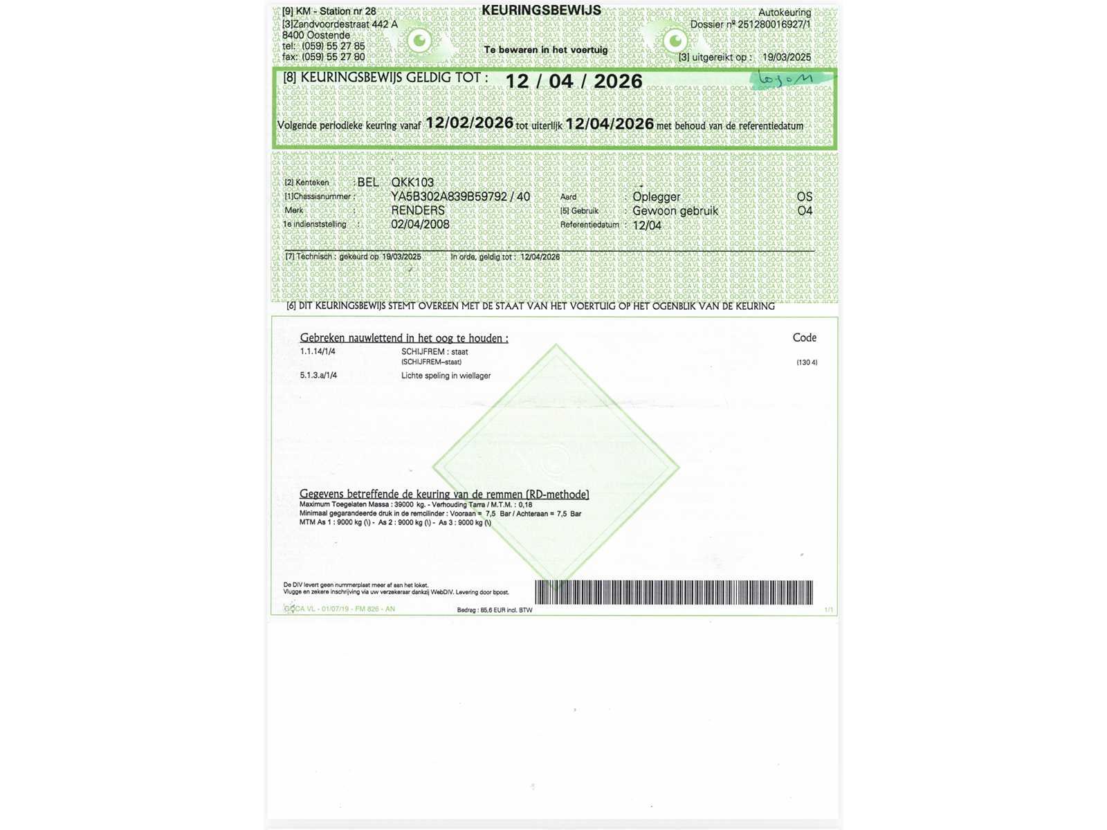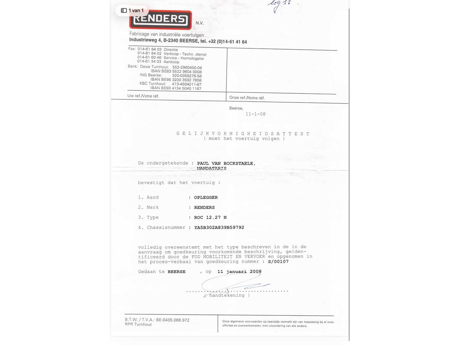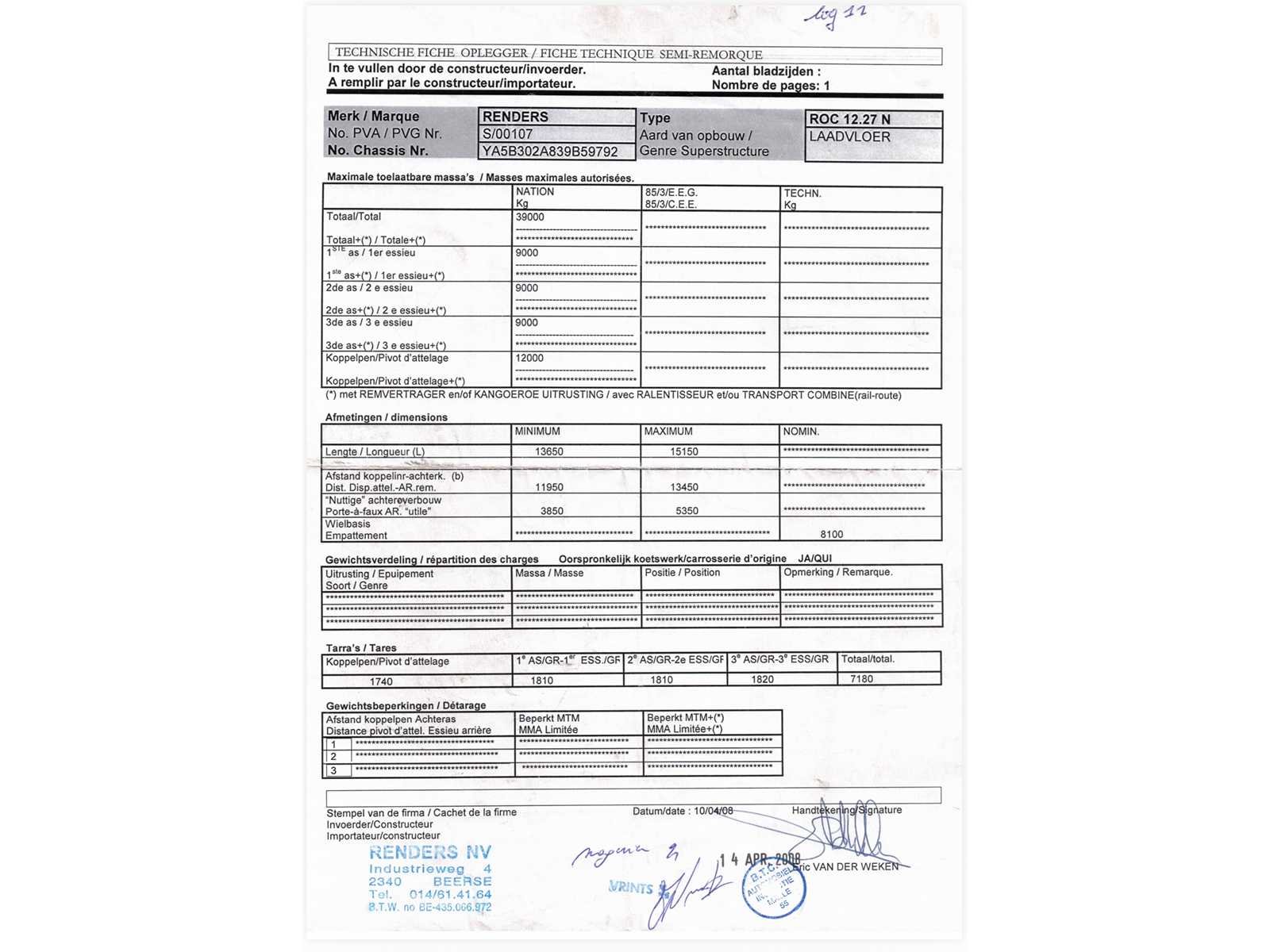 Nee Merk: Renders Type: ROC12.27N Model: Laadvloer Bouwjaar: 2008 Chassisnummer: YA5B302A839B59792 Aantal assen: 3 Laadbak afmeting l: 1515cm Laadbak afmeting b: 255cm Ledig gewicht: 7180kg Laadvermogen: 31820kg Datum eerste toelating: 02/04/2008 Kentekenpapieren compleet?: true Hoogte: 115cm Lengte: 1515cm Breedte: 255cm Nationaliteit documenten: BE