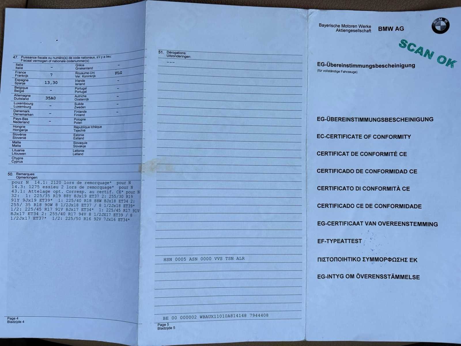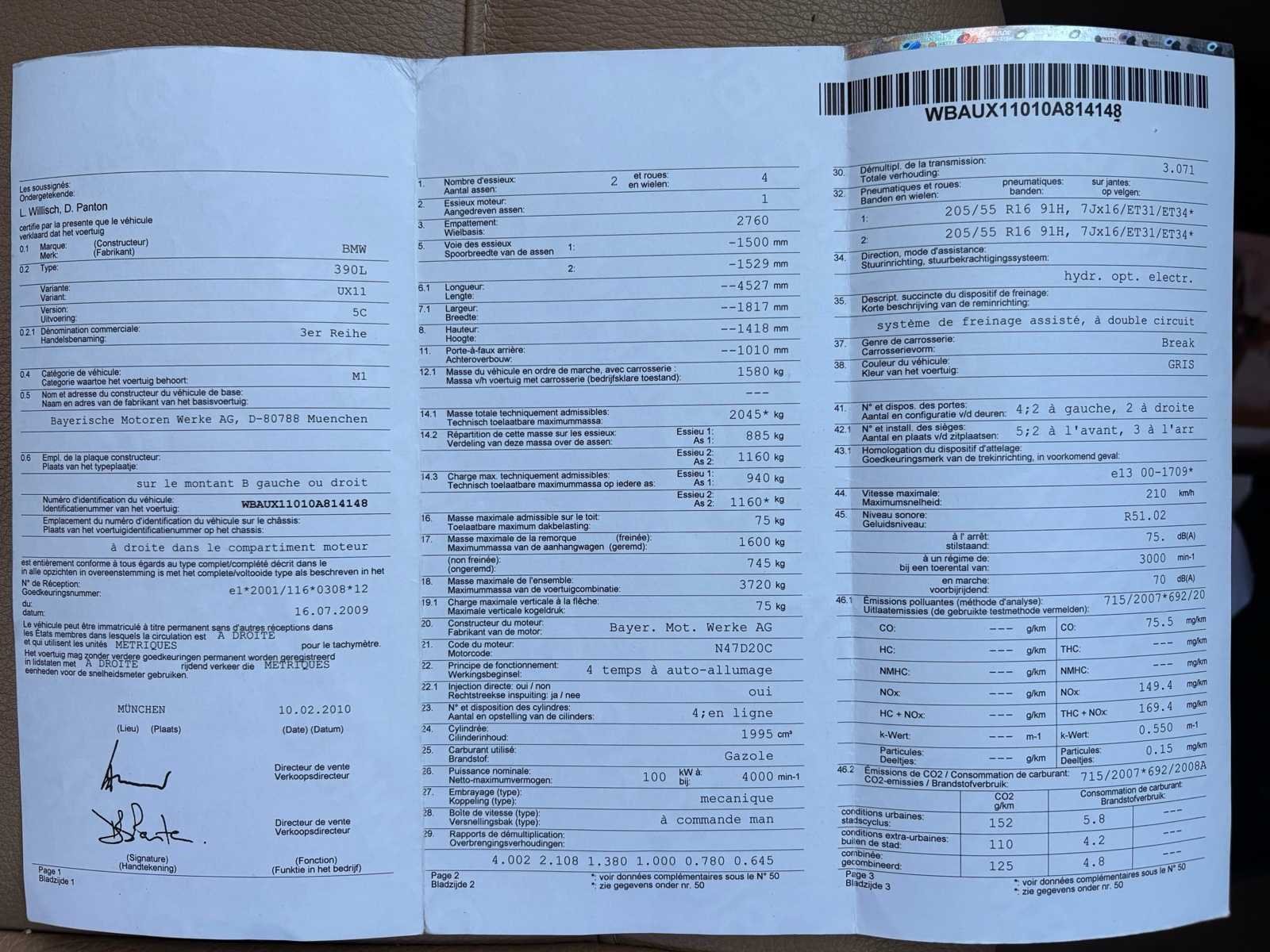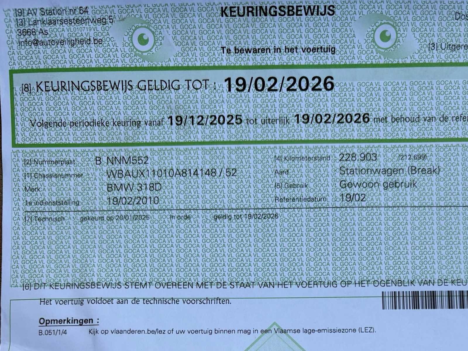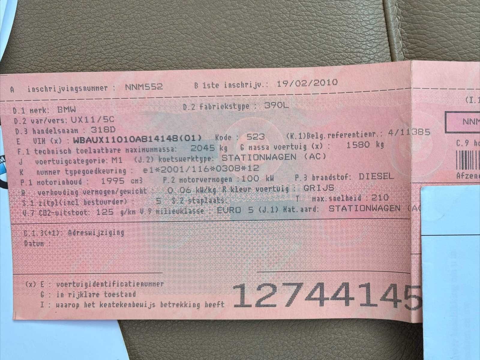 Nee Merk: BMW Model: 318D Bouwjaar: 2010 Afgelezen kilometerstand: 239836km Cilinderinhoud: 1995cc Vermogen (kW): 100kW Brandstof: Diesel Chassisnummer: WBAUX11010A814148 Datum eerste toelating: 19/02/2010 Vermogen (pk): 136hp Aantal zitplaatsen: 5 Maximaal trekgewicht ongeremd: 745kg Maximaal trekgewicht geremd: 1600kg Transmissie: Manueel Stuurwiel: Links Emissieklasse: Euro 5 Ledig gewicht: 1580kg Aantal cilinders: 4 Carrosserie: Stationwagen Nationaliteit documenten: BE CO2-uitstoot NEDC: 125 Gelijkvormigheidsattest aanwezig: true Start en rijdt: Ja Keuringsrapport geldig tot: 19/02/2026 startinformatie : Start, rijdt, remt Vavato voert geen technische keuring uit.: true Airconditioning: true Leder bekleed: true Inschrijvingsbewijs - deel 1 : Ok Inschrijvingsbewijs - deel 2: OK