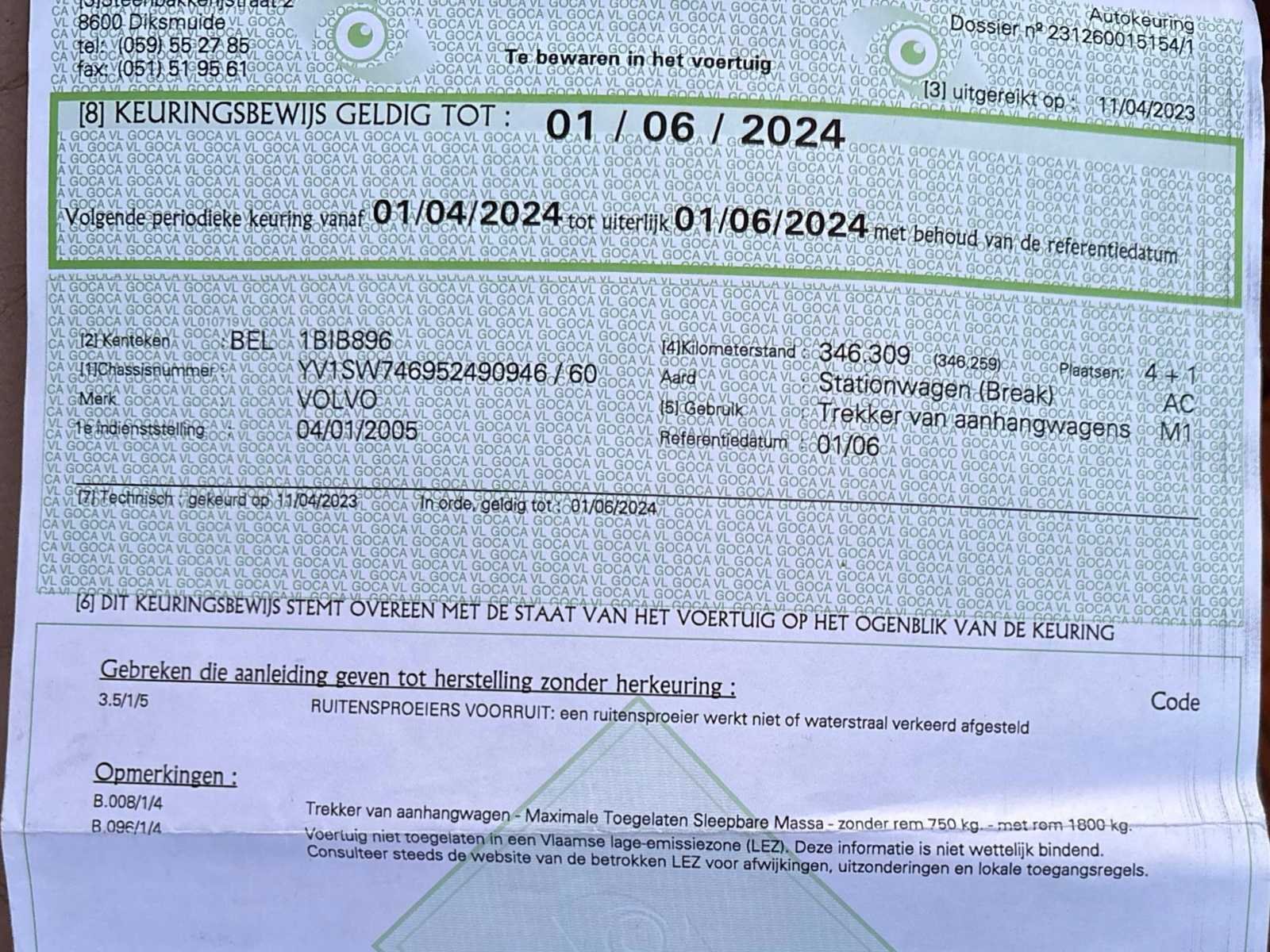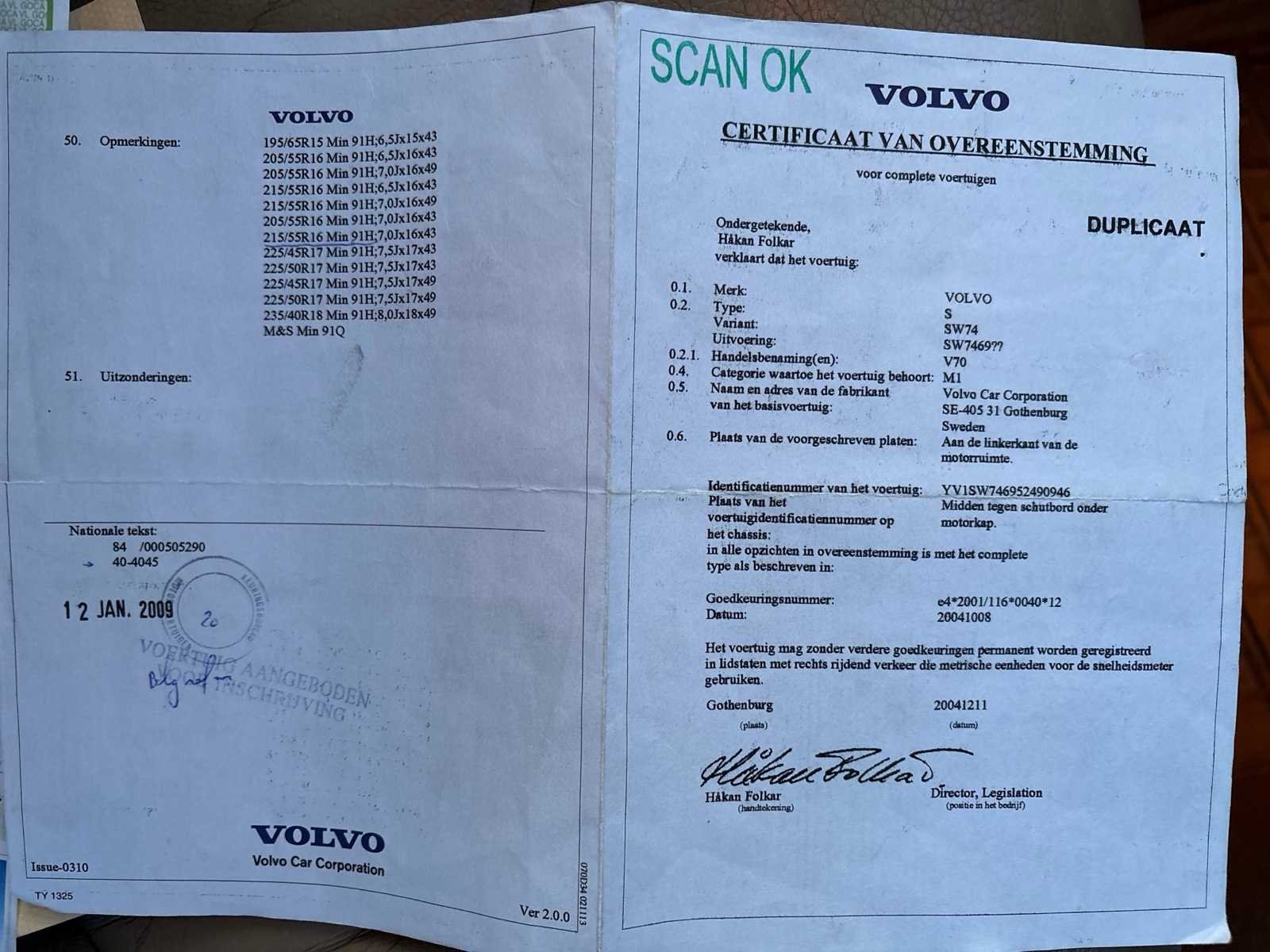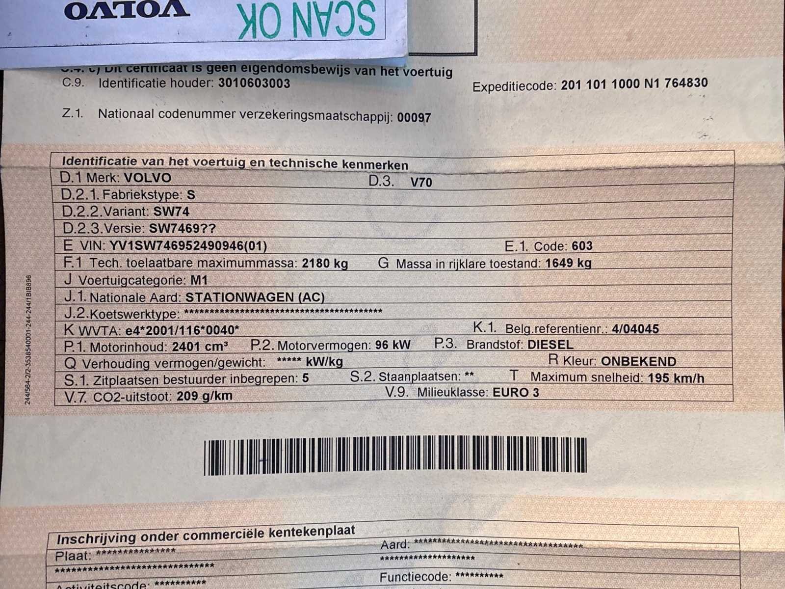 Nee Merk: Volvo Model: V70 Bouwjaar: 2005 Afgelezen kilometerstand: 355492km Cilinderinhoud: 2401cc Vermogen (kW): 96kW Brandstof: Diesel Chassisnummer: YV1SW746952490946 Datum eerste toelating: 04/01/2005 Vermogen (pk): 131hp Aandrijving: Voorwiel Aantal zitplaatsen: 5 Maximaal trekgewicht ongeremd: 750kg Maximaal trekgewicht geremd: 1800kg Transmissie: Automaat Stuurwiel: Links Emissieklasse: Euro 3 Aantal deuren: 5 Aantal sleutels: 1 Ledig gewicht: 1649kg Aantal cilinders: 5 Carrosserie: Stationwagen Nationaliteit documenten: BE CO2-uitstoot NEDC: 209 Gelijkvormigheidsattest aanwezig: true Start en rijdt: Ja Keuringsrapport geldig tot: 01/06/2024 startinformatie : Start en rijdt Zichtbare schade: Platte batterij maar start direct met startbooster Vavato voert geen technische keuring uit.: true Airconditioning: true Leder bekleed: true Inschrijvingsbewijs - deel 1 : OK Inschrijvingsbewijs - deel 2: OK