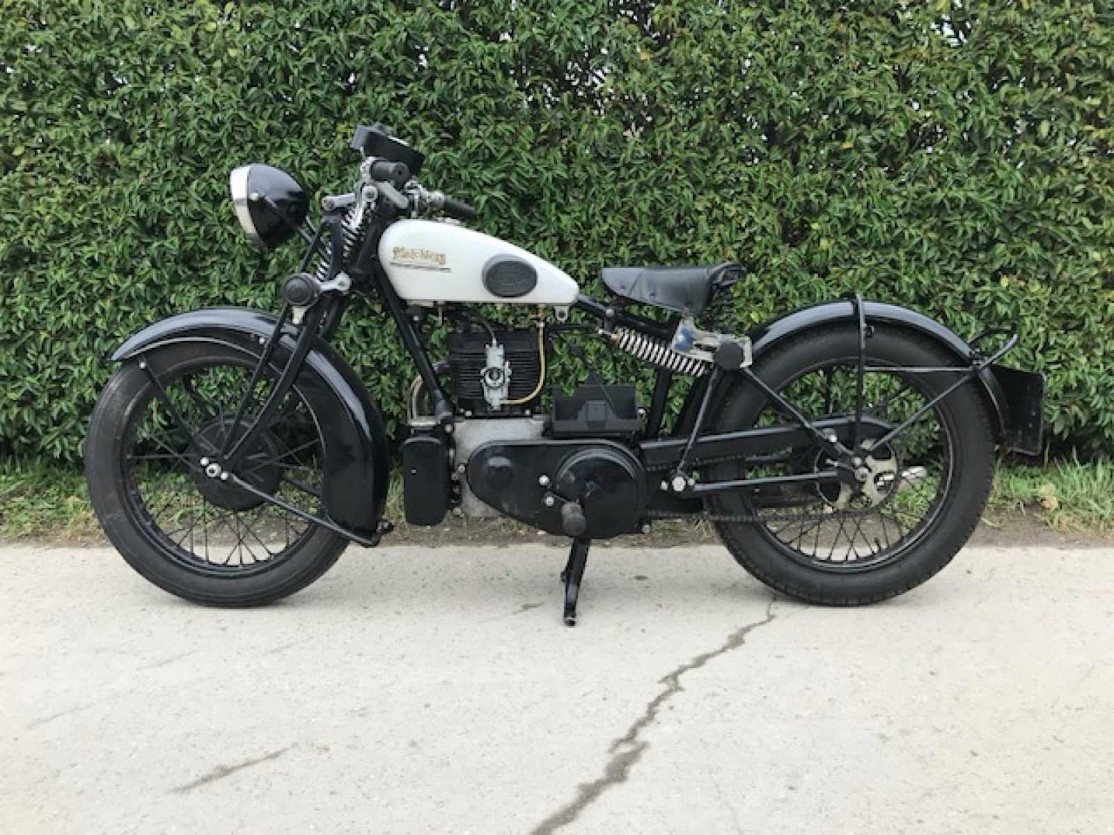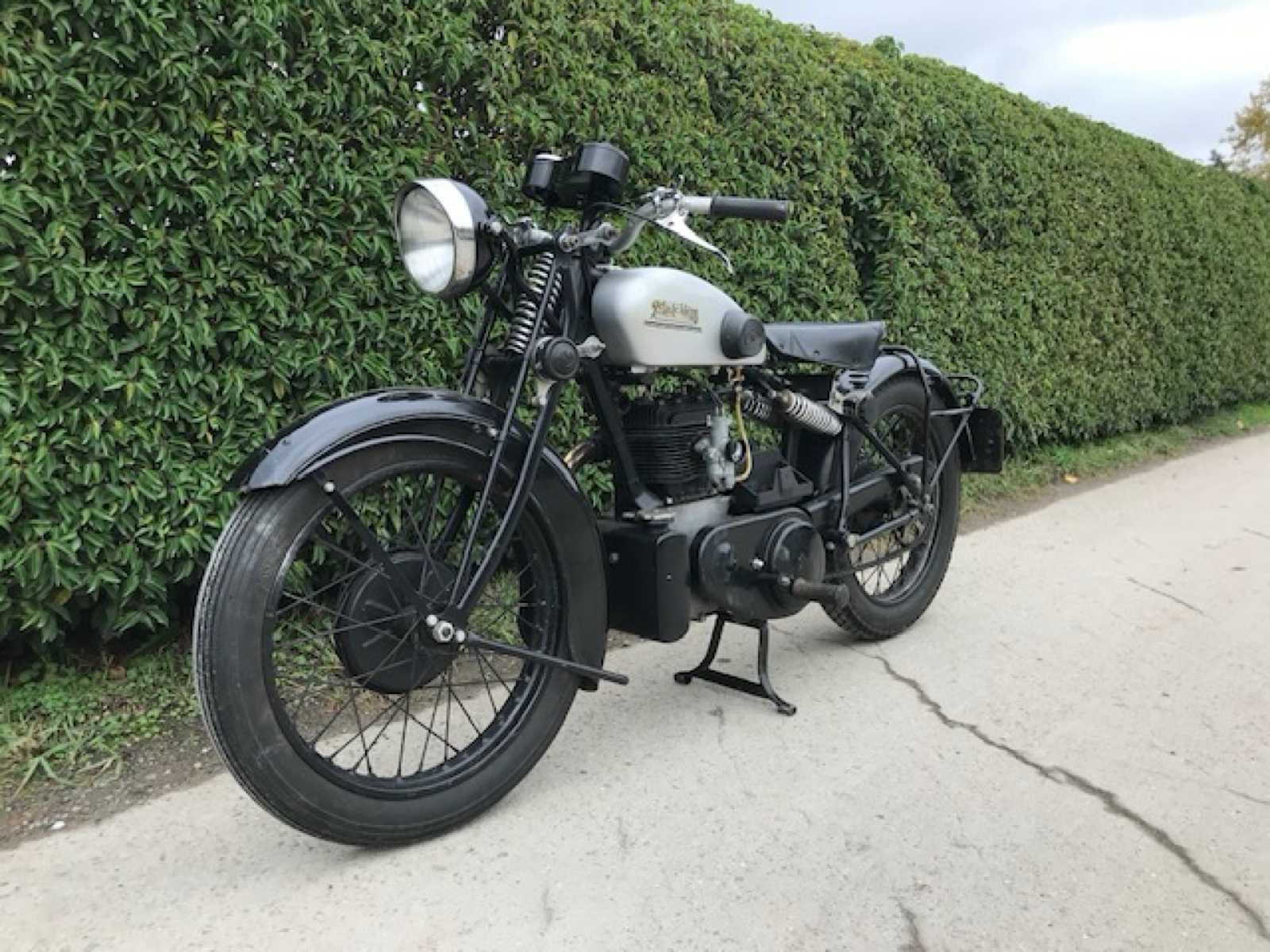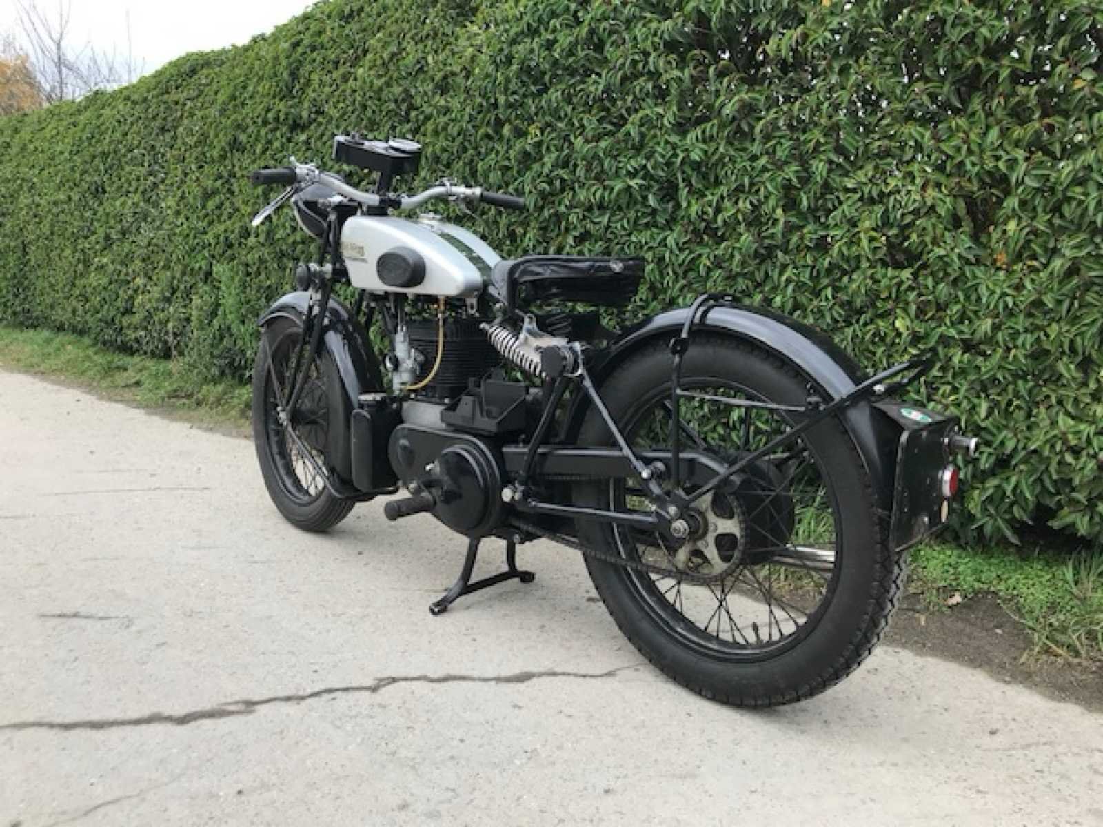 Nu met juiste dashbord! 2 cilinder in V! Engelse Matchless Silver arrow. Dit is een 400cc zijklepper V-twin met achtervering van 1930. In oktober 1929 kwam een nieuw top model van Matchless op de markt. Dit was een 2 cilinder in V maar met een kleine hoek van 18° zodat de cilinderkop toch uit 1 stuk gegoten kon worden. Hierdoor leek de motor op een 2 cilinder in lijn maar dit is wel degelijk een V-twin. Ook speciaal aan dit motorblok was dat het een unit motor was wat ongebruikelijk was voor Matchless in 1929. Dit wil zeggen dat motor en versnellingsbak 1 geheel vormen. De versnellingsbak was onder de motor ingebouwd en was toegankelijk voor inspectie door een demonteerbaar zijdeksel aan de rechter zijde. De krukas lag dwars in de motor maar de nokkenas zat in de lengte richting en werd aangedreven door een pignon-kroonwiel. De uitlaatkleppen hadden een gezamenlijk spruitstuk waardoor er maar 1 uitlaatbuis nodig was. Ook nieuw voor 1929 was de zadeltank, middenstandaard en de cantilever achtervering zoals bij Vincent-HRD. Dit model kwam op de meest slechte moment op de markt, enkele weken na de grote beurskrach in Amerika. In 1931 werd het model aangepast met rondere benzinetank, 4 versnelling bak en grotere oliebak. De productie stopte in 1933 door te lage verkoopcijfers door de crisisjaren. Dit is het eerste model Silver Arrow type A1 De Luxe met draaigas, elektrische verlichting en instrumentenpaneel. Motorfiets start en rijdt goed. Nu compleet met origineel dashbord, nog niet gemonteerd. Met Belgische papieren No Merk: 1930 Matchless Model: Silver Arrow A1 De Luxe Cilinderinhoud: 400cc Startinformatie: Start en rijdt Bouwjaar: 1930