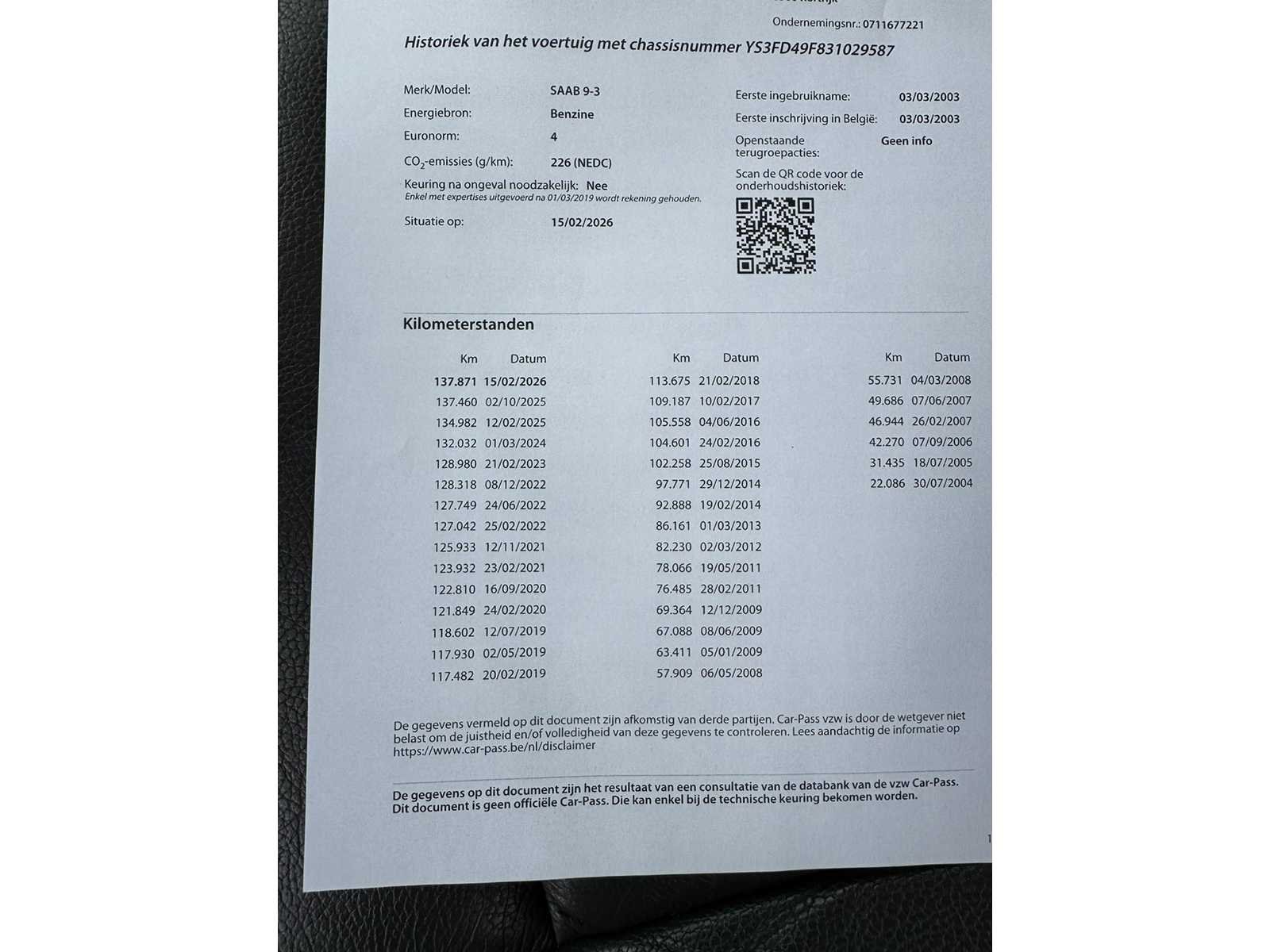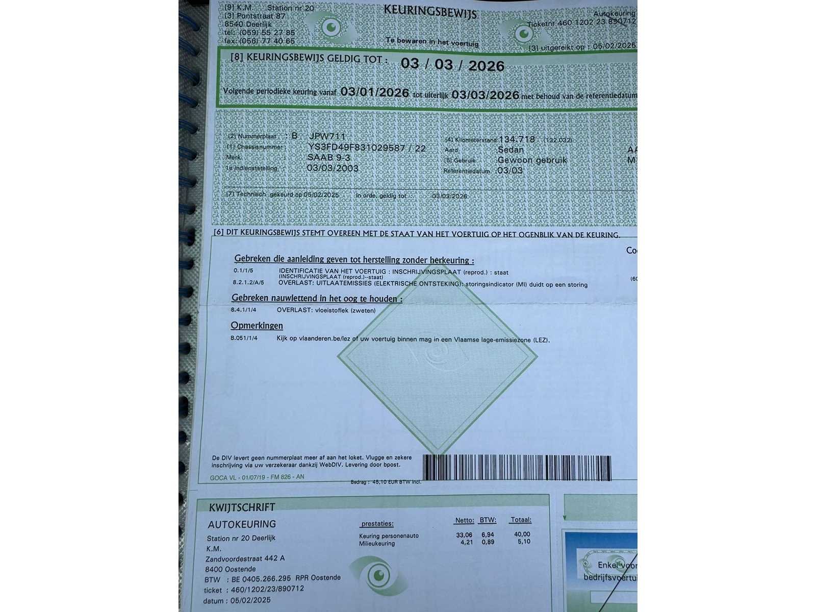 Nee Merk: saab Model: 9-3 Bouwjaar: 2003 Afgelezen kilometerstand: 137871km Cilinderinhoud: 1978cc Vermogen (kW): 110kW Brandstof: benzine Chassisnummer: YS3FD49F831029587 Datum eerste toelating: 03-03-2003 Vermogen (pk): 150hp Aantal zitplaatsen: 5 Transmissie: automaat Emissieklasse: euro 4 Aantal deuren: 5 Nationaliteit documenten: BE CO2-uitstoot NEDC: 226 Gelijkvormigheidsattest aanwezig: true Carpass: true Start en rijdt: ja Keuringsrapport geldig tot: 03/03/2026 Inschrijvingsbewijs - deel 1 : ok Inschrijvingsbewijs - deel 2: ok
