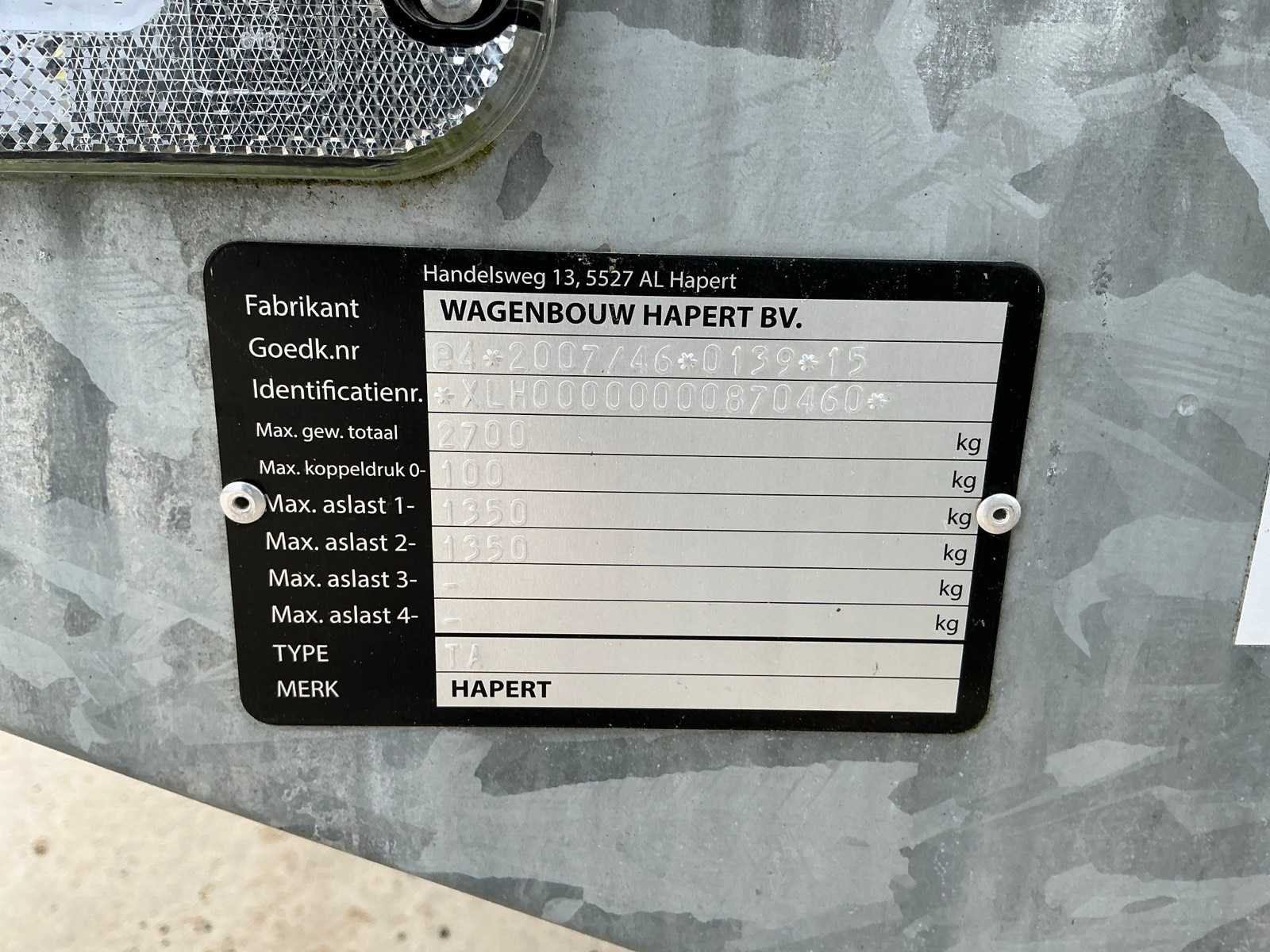 MTM 2700KG Nee Merk: Hapert Type: TA Bouwjaar: 2025 Chassisnummer: XLH00000000870460 Aantal assen: 2 Laadbak afmeting l: 405cm Laadbak afmeting b: 200cm