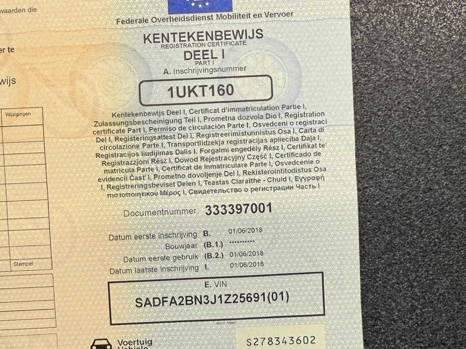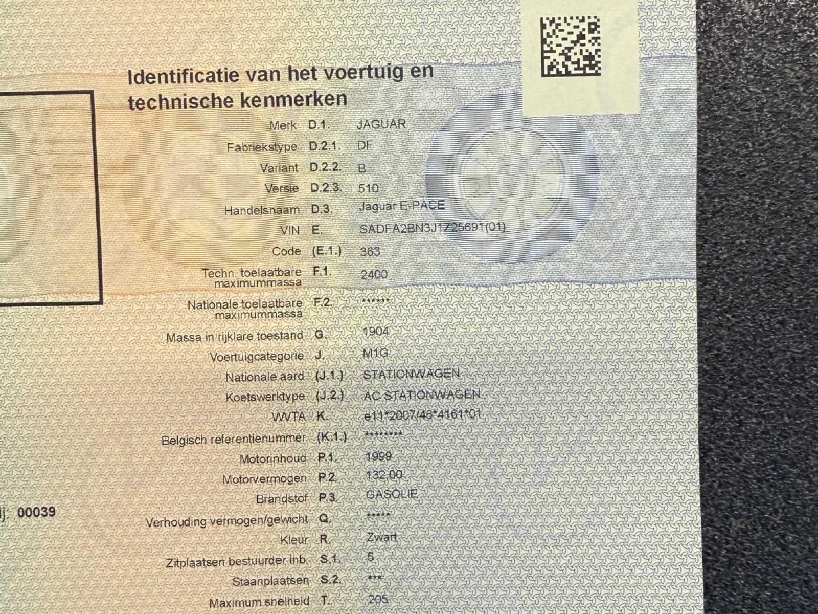Automaat / Panorama dak / elektrische koffer / stoelverwarming / stuur verwarming / … No Merk: Jaguar Model: E-PACE Type: 2.0d AWD Bouwjaar: 2018 Afgelezen kilometerstand: 130000km Cilinderinhoud: 1999cc Vermogen (kW): 132kW Brandstof: Diesel Chassisnummer: SADFA2BN3J1Z25691 Datum eerste toelating: 01/06/2018 Aantal zitplaatsen: 5 Transmissie: Automaat Emissieklasse: EURO 6B Aantal deuren: 5 Aantal sleutels: 2 Nationaliteit documenten: Belgisch Start en rijdt: YES Airconditioning: true Inschrijvingsbewijs - deel 1 : Aanwezig