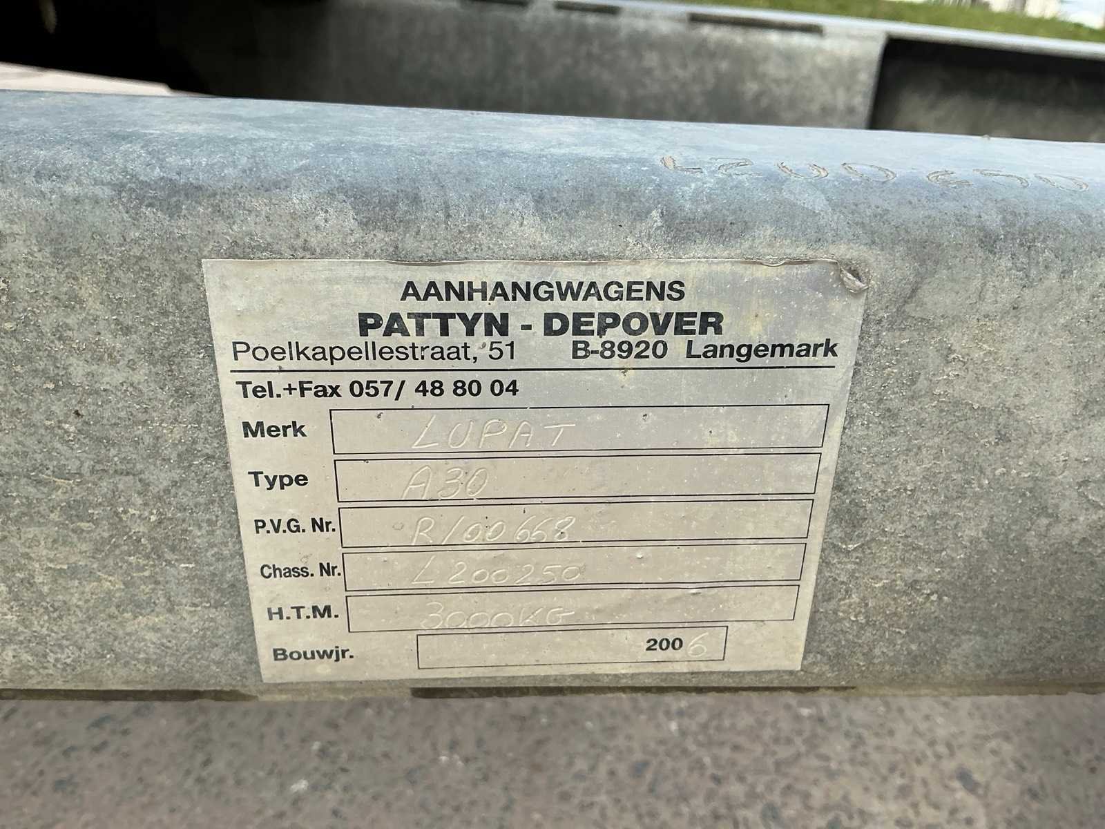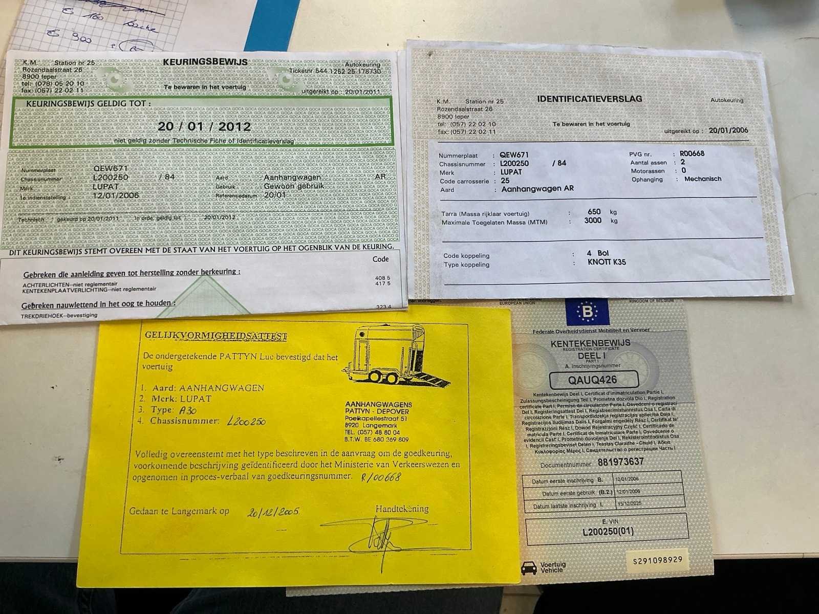 Nee Merk: LUPAT Bouwjaar: 2006 Chassisnummer: L200250 Aantal assen: 2 Laadbak afmeting l: 300cm Laadbak afmeting b: 145cm Nationaliteit documenten: Belgisch