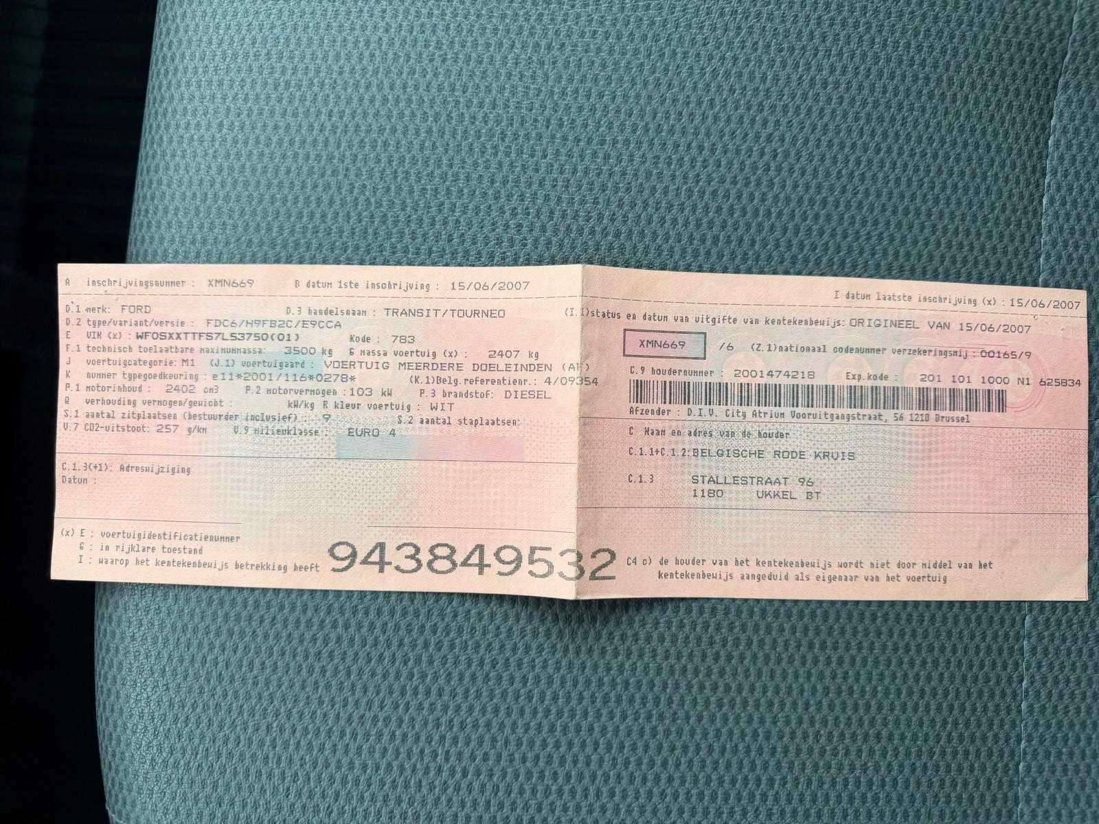 De wagen start en rijdt zonder problemen. Zie foto’s voor verdere details en schades. Nee Merk: Ford Model: Transit/Tourneo Bouwjaar: 2007 Afgelezen kilometerstand: 122766km Cilinderinhoud: 2403cc Vermogen (kW): 103kW Brandstof: diesel Chassisnummer: WF0SXXTTFS7L53750 Datum eerste toelating: 15/06/2007 Aantal zitplaatsen: 9 Transmissie: Handgeschakeld Emissieklasse: Euro 4 Nationaliteit documenten: België Start en rijdt: Ja Vavato voert geen technische keuring uit.: true Inschrijvingsbewijs - deel 1 : Aanwezig