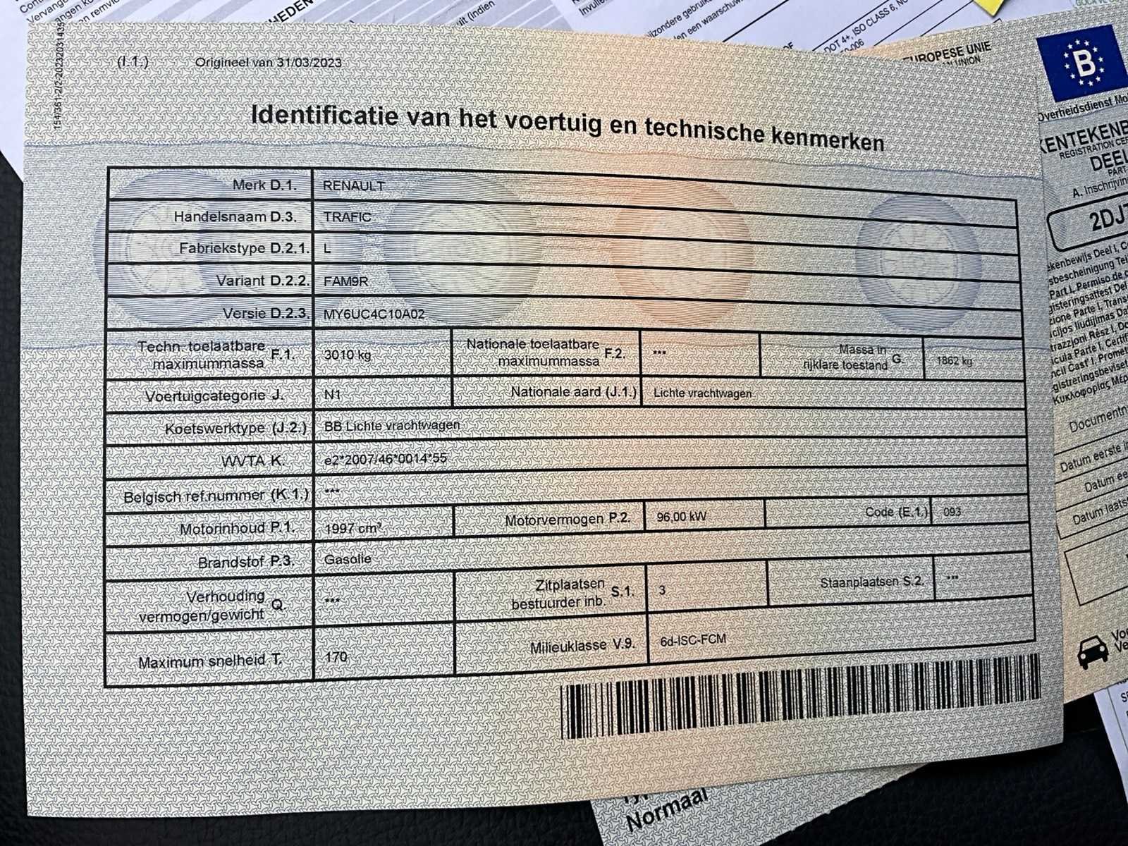 Nee Merk: Renault Model: Trafic Bouwjaar: 2023 Afgelezen kilometerstand: 49954km Cilinderinhoud: 1997cc Vermogen (kW): 96kW Brandstof: diesel Chassisnummer: VF1FL000270597789 Datum eerste toelating: 31/03/2023 Nationaliteit documenten: Belgisch Start en rijdt: Start en rijdt startinformatie : Ja Inschrijvingsbewijs - deel 1 : Aanwezig Inschrijvingsbewijs - deel 2: Aanwezig