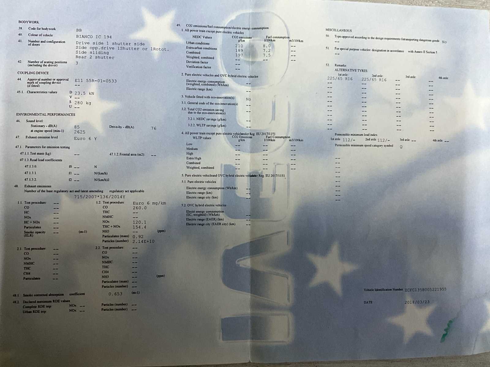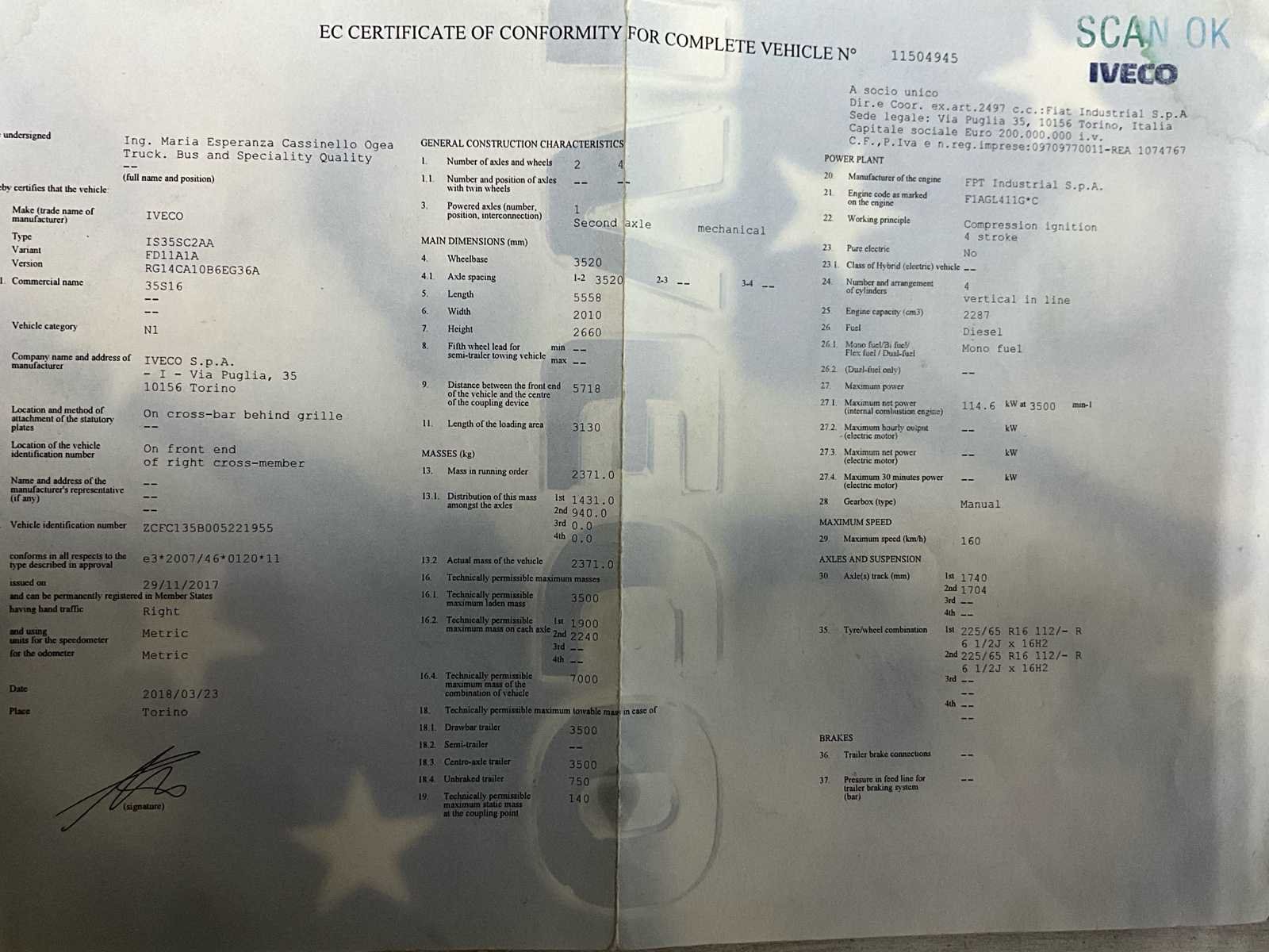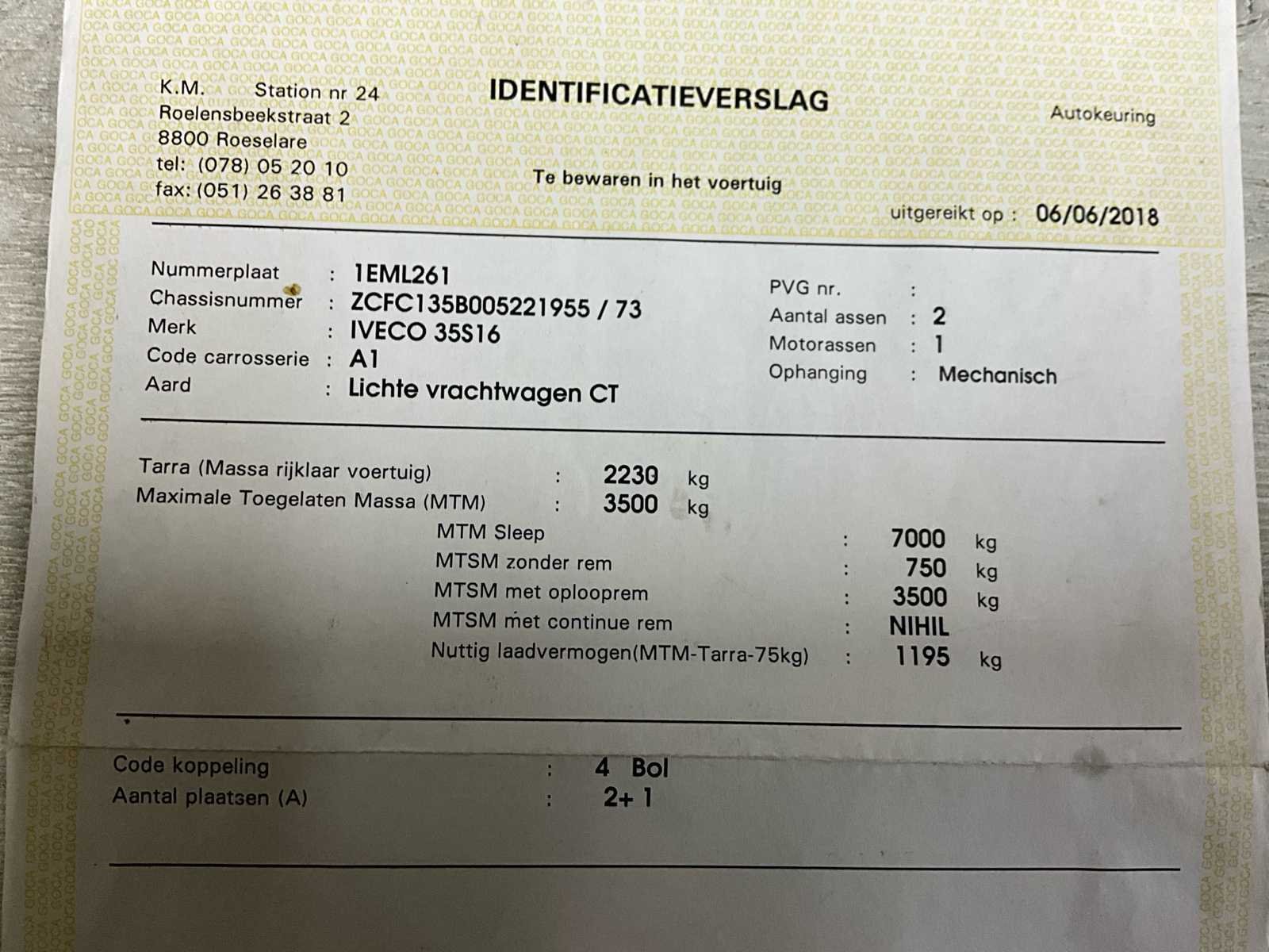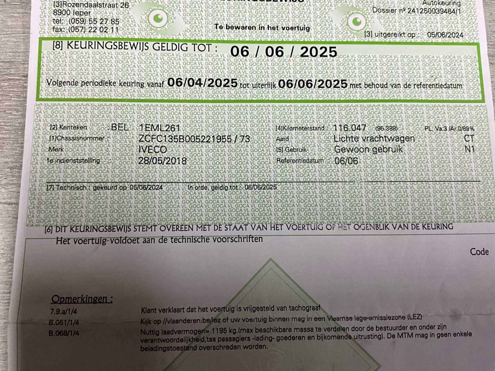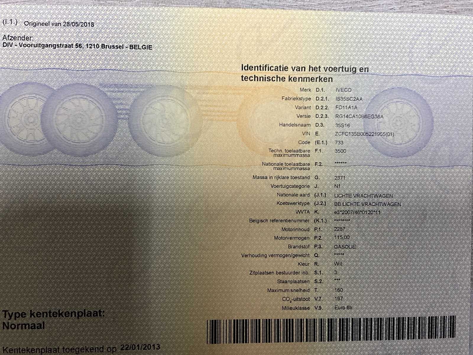 Alu dakdrager + ladder - technisch gekeurd op 116047km zonder opmerking - foutmelding roetfilter - foutmelding gloedkaarsen - achteraan en links lichte schade carrosserie (zie foto’s) No Merk: IVECO Model: Daily Type: lichte vracht Bouwjaar: 2018 Afgelezen kilometerstand: 137209km Cilinderinhoud: 2287cc Vermogen (kW): 115kW Brandstof: diesel Chassisnummer: ZCFC135B005221955 Laadvermogen: 1195kg Datum eerste toelating: 28/5/2018 Emissieklasse: Euro 6b Ledig gewicht: 2230kg Nationaliteit documenten: B Gelijkvormigheidsattest aanwezig: true Start en rijdt: ja Vavato voert geen technische keuring uit.: true Inschrijvingsbewijs - deel 1 : aanwezig Inschrijvingsbewijs - deel 2: aanwezig