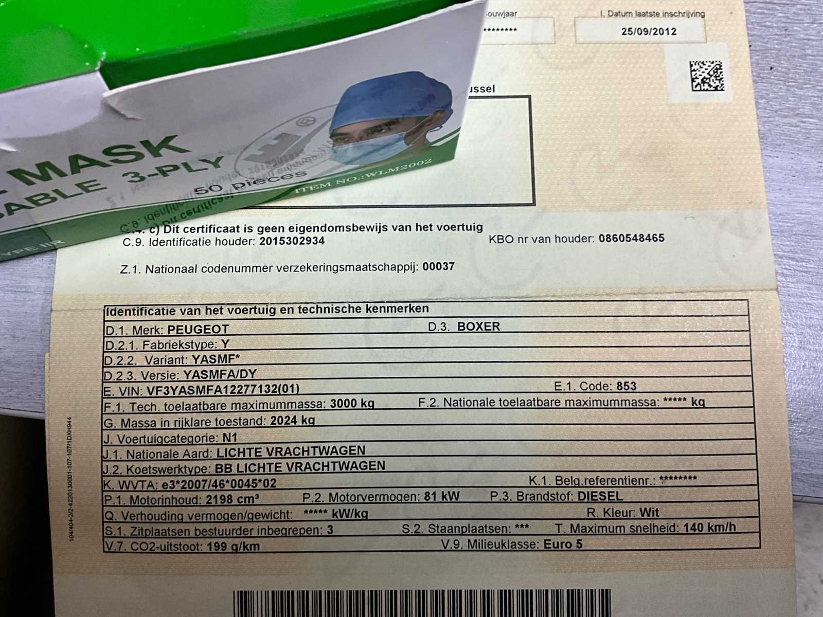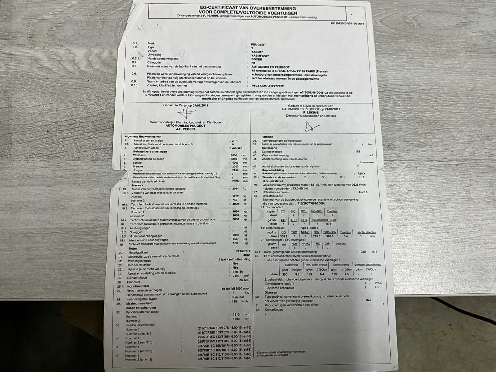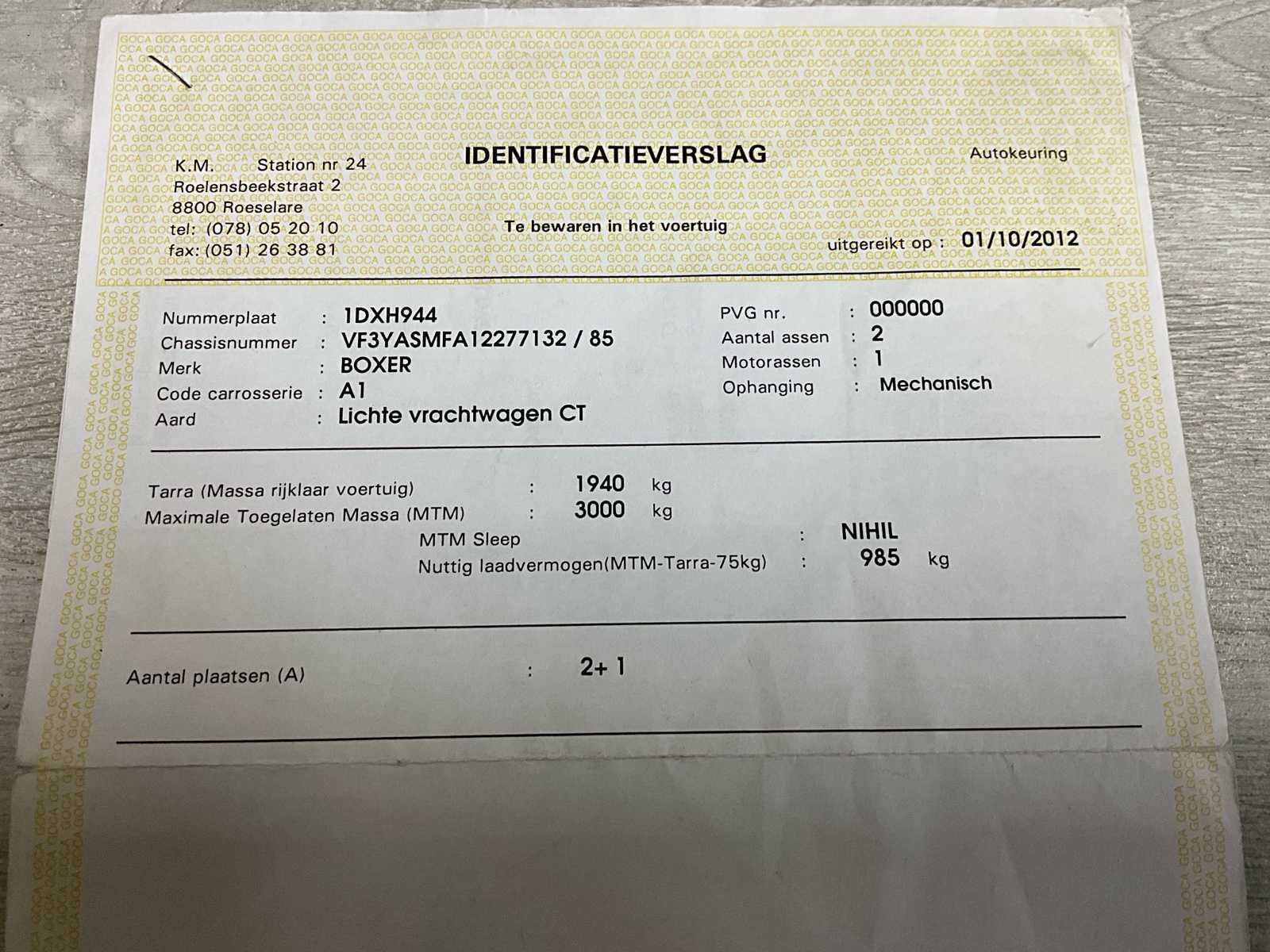 Start, rijdt, kan onmiddellijk ingezet worden No Merk: Peugeot Model: Boxer Type: 6 pers - airco Bouwjaar: 2012 Afgelezen kilometerstand: 114370km Cilinderinhoud: 2198cc Vermogen (kW): 81kW Brandstof: diesel Chassisnummer: VF3YASMFA12277132 Laadvermogen: 985kg Datum eerste toelating: 25/09/2012 Aantal zitplaatsen: 3 Kleur: wit Transmissie: manueel (6) Emissieklasse: Euro 5 Aantal deuren: 5 Nationaliteit documenten: B Gelijkvormigheidsattest aanwezig: true Start en rijdt: ja Vavato voert geen technische keuring uit.: true Airconditioning: true