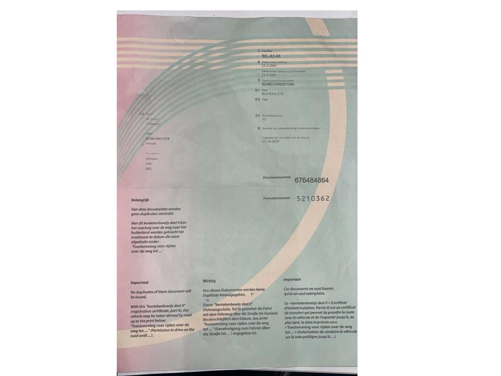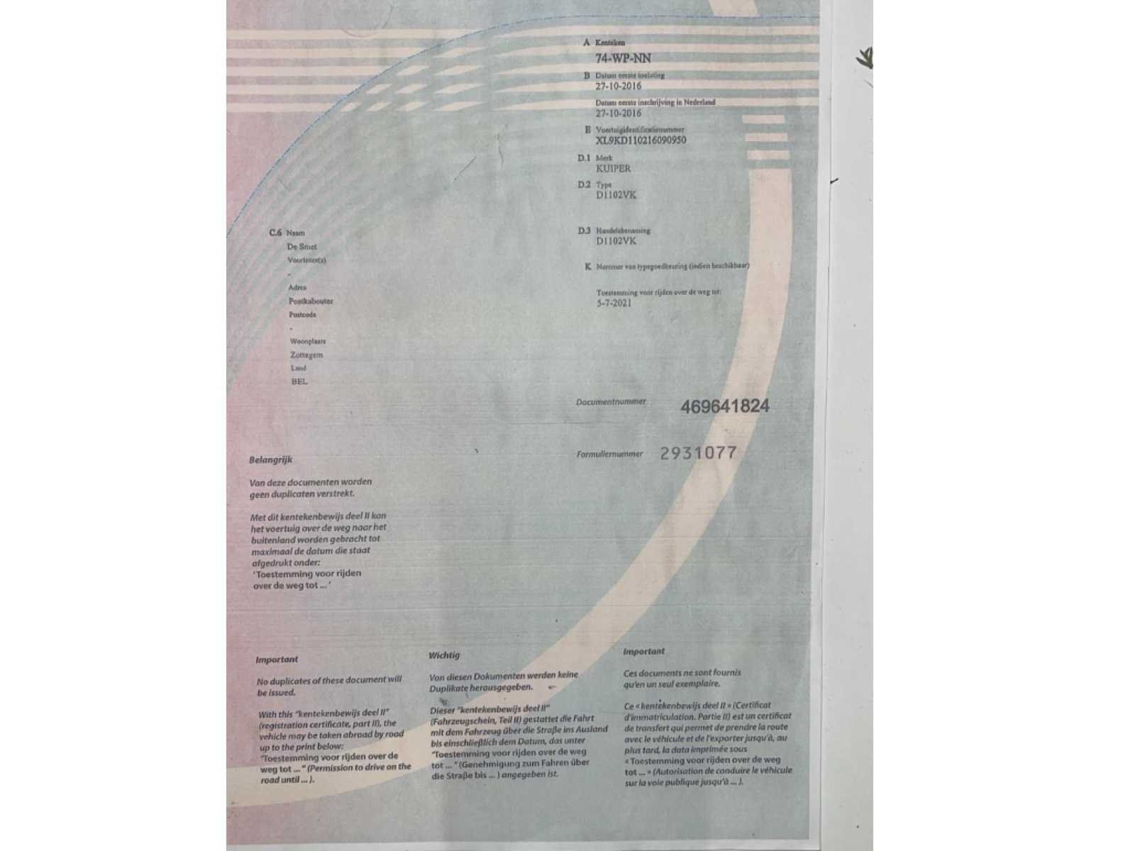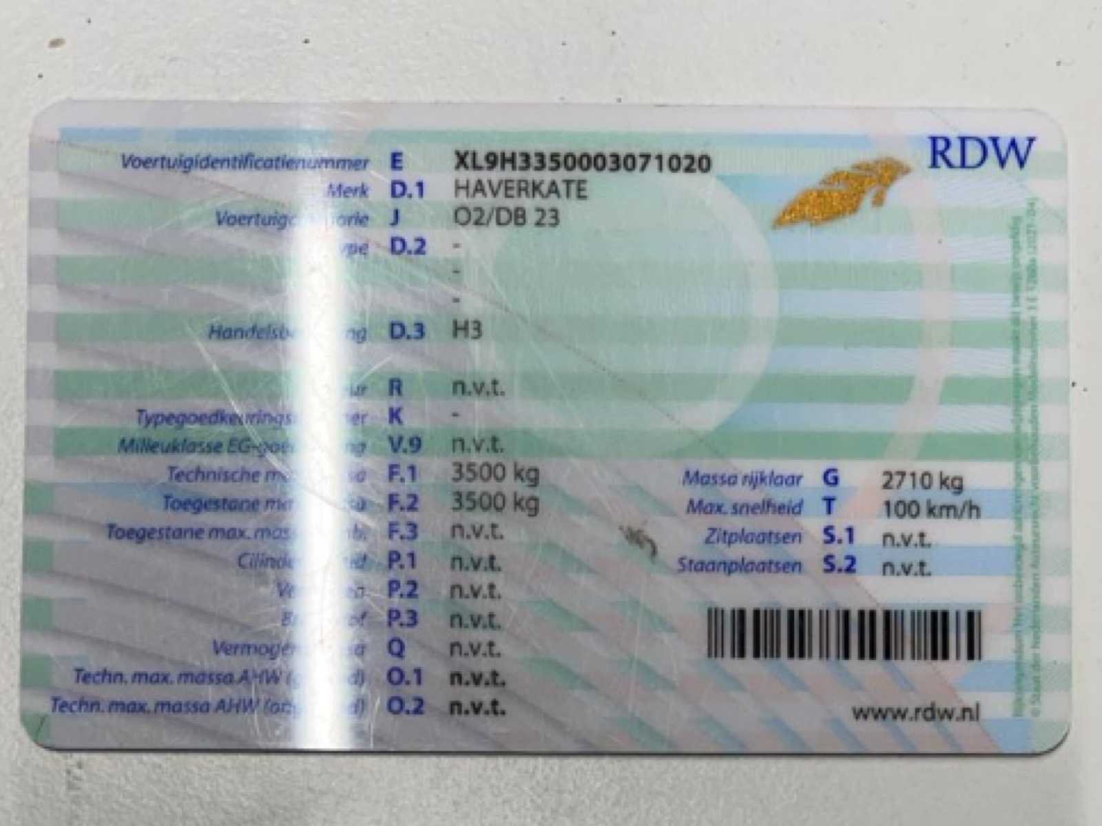 Uitschuifbaar tot 16m werkruimte Transport lengte 8m Kenteken (Nederland) • WL-RJ-06 ✅ Land van inschrijving • Nederland (RDW) ⸻ 🔢 IDENTIFICATIE Voertuigidentificatienummer (VIN / chassisnummer) • XLH93350003701200 (afgelezen van de technische kaart – voldoende duidelijk) Merk • Haverkamp (D.1 Merk: HAVERKAMP) Type / Handelsbenaming • H3 (zoals vermeld op de kaart) ⸻ 📅 DATA Datum eerste toelating • 23-02-2004 Datum eerste inschrijving in Nederland • 23-02-2004 Datum tenaamstelling (laatste) • 16-12-2021 ⸻ ⚙️ TECHNISCHE GEGEVENS (RDW-kaart) Voertuigcategorie • O2 / Aanhangwagen (af te leiden uit massa’s en layout) Massa leeg • ≈ 970 kg Toegestane maximum massa • 3.500 kg ✅ Aantal assen • 2 (tandemasser) Remmen • Geremd Trekhaak / koppeling • Oplooprem aanwezig (zichtbaar op foto’s) ⸻ 📄 DOCUMENTEN (op foto’s) • ✅ Nederlands Kentekenbewijs Deel I (kaart) • ✅ Nederlands Kentekenbewijs Deel II (papier) • RDW-documentnummers zichtbaar maar niet essentieel voor verkoop Nee Merk: Haverkamp Bouwjaar: 2004 Aantal assen: 2 Nationaliteit documenten: Nederland