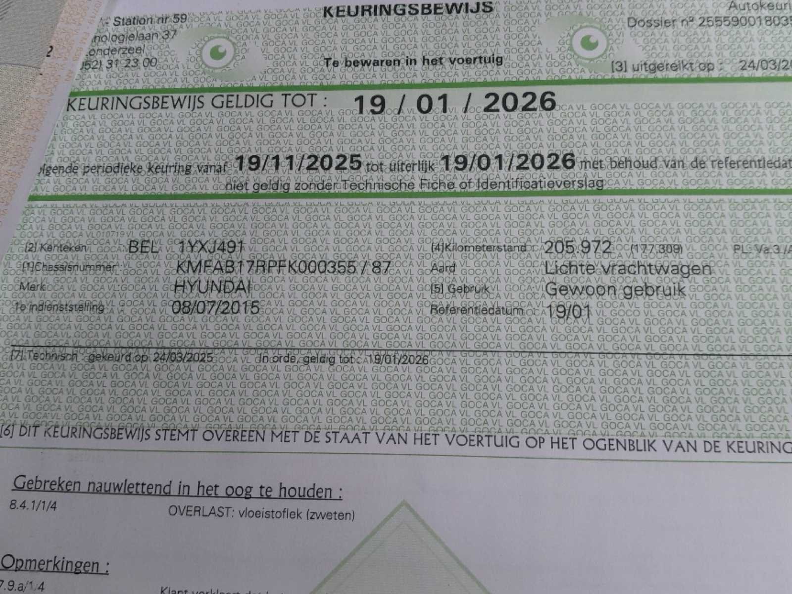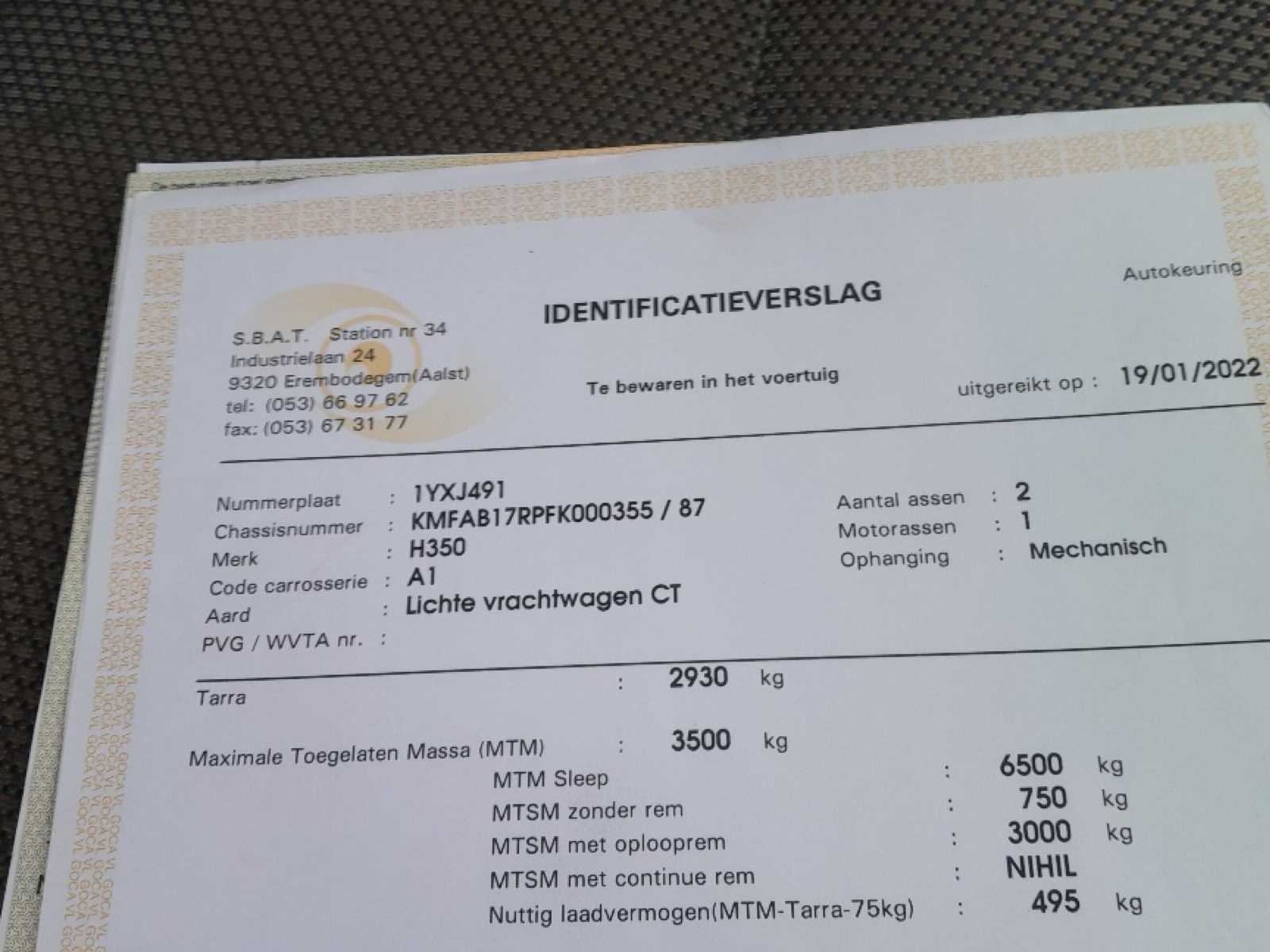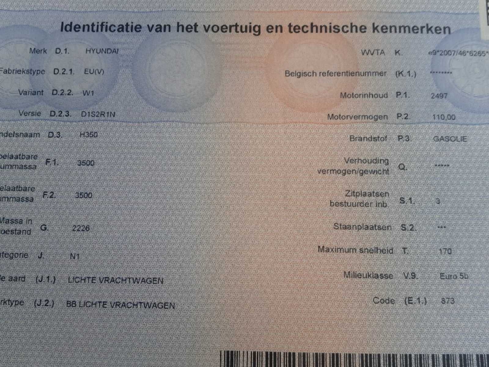 Hyundai H350 camionnette 2.5 CRDi diesel Euro 5b BTW wagen 5500 euro Te koop aangeboden een Hyundai H350 camionnette met de sterke en betrouwbare 2.5 dieselmotor Euro 5b. Deze bestelwagen is uitermate geschikt voor professioneel gebruik en biedt veel laadruimte in combinatie met een comfortabele rijervaring. Algemene gegevens Merk Hyundai Model H350 Type camionnette bestelwagen Motor 2.5 CRDi diesel Vermogen 110 kW Emissienorm Euro 5b Eerste inschrijving 05 07 2015 Kilometerstand 225000 km Chassisnummer KMFAB17RPFK000355 BTW wagen btw aftrekbaar Onderhoud en staat Dealer onderhouden Start en rijdt goed Motor loopt mooi Versnellingsbak schakelt correct Geschikt voor dagelijks werkgebruik Uitrusting Airconditioning Achteruitrijcamera Korte chassis met hoge opbouw Twee originele sleutels Laadruimte Ruime en hoge laadruimte Ideaal voor bouw levering installatie of verhuis Makkelijk te laden en praktisch in gebruik Carrosserie Gebruikte wagen Rondom krassen en deukjes aanwezig Geen nieuwe wagen maar technisch correct Ideaal als werkvoertuig Samenvatting Betrouwbare 2.5 diesel Euro 5b Dealer onderhouden Airco en camera achteraan Korte maar hoge camionnette BTW wagen No Merk: Hyundai Model: H350 Bouwjaar: 2015 Afgelezen kilometerstand: 225000km Cilinderinhoud: 2497cc Vermogen (kW): 110kW Brandstof: Diesel Chassisnummer: KMFAB17RPFK000355 Transmissie: Handgeschakkeld Emissieklasse: 5B Start en rijdt: Ja startinformatie : Start en rijd Vavato voert geen technische keuring uit.: true Inschrijvingsbewijs - deel 1 : Ok Inschrijvingsbewijs - deel 2: Ok