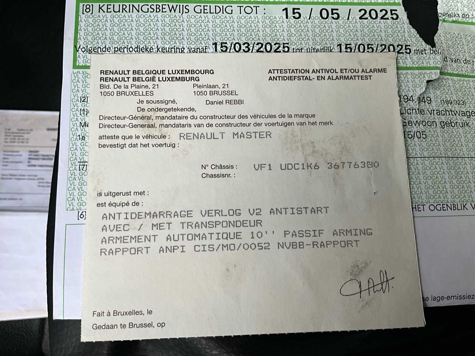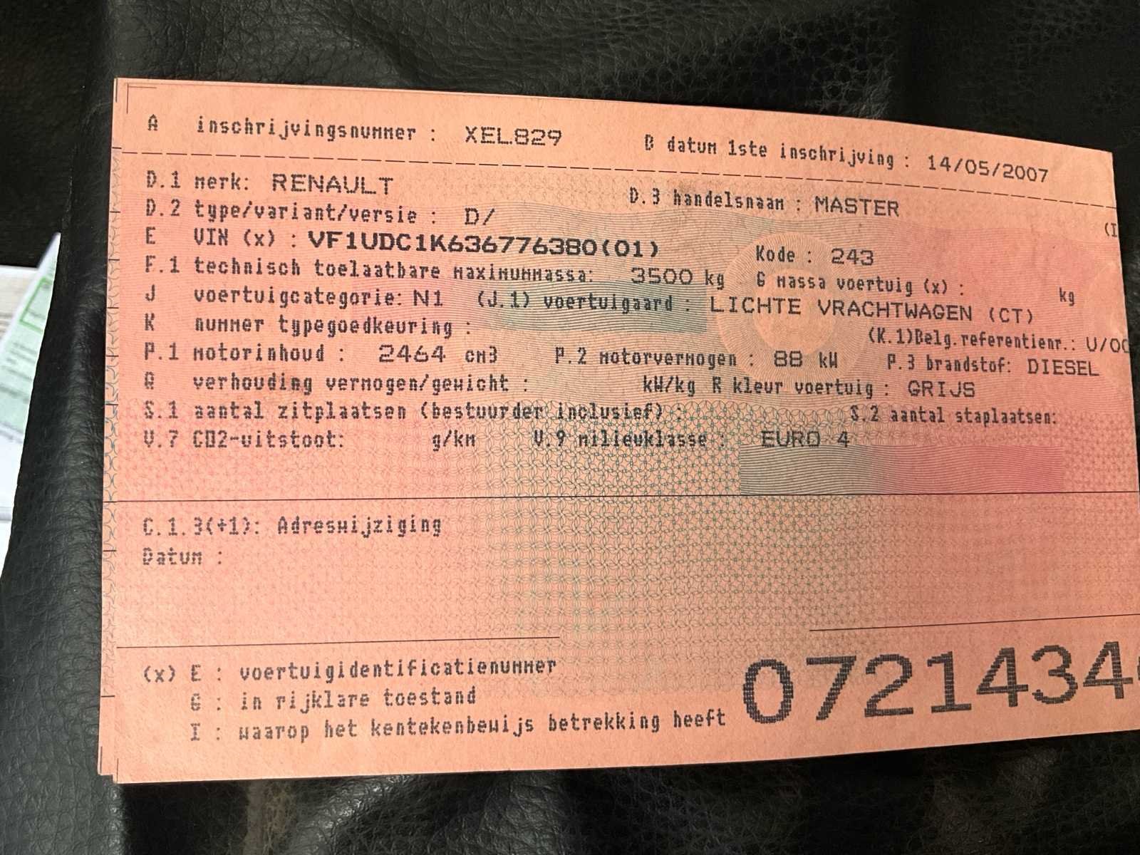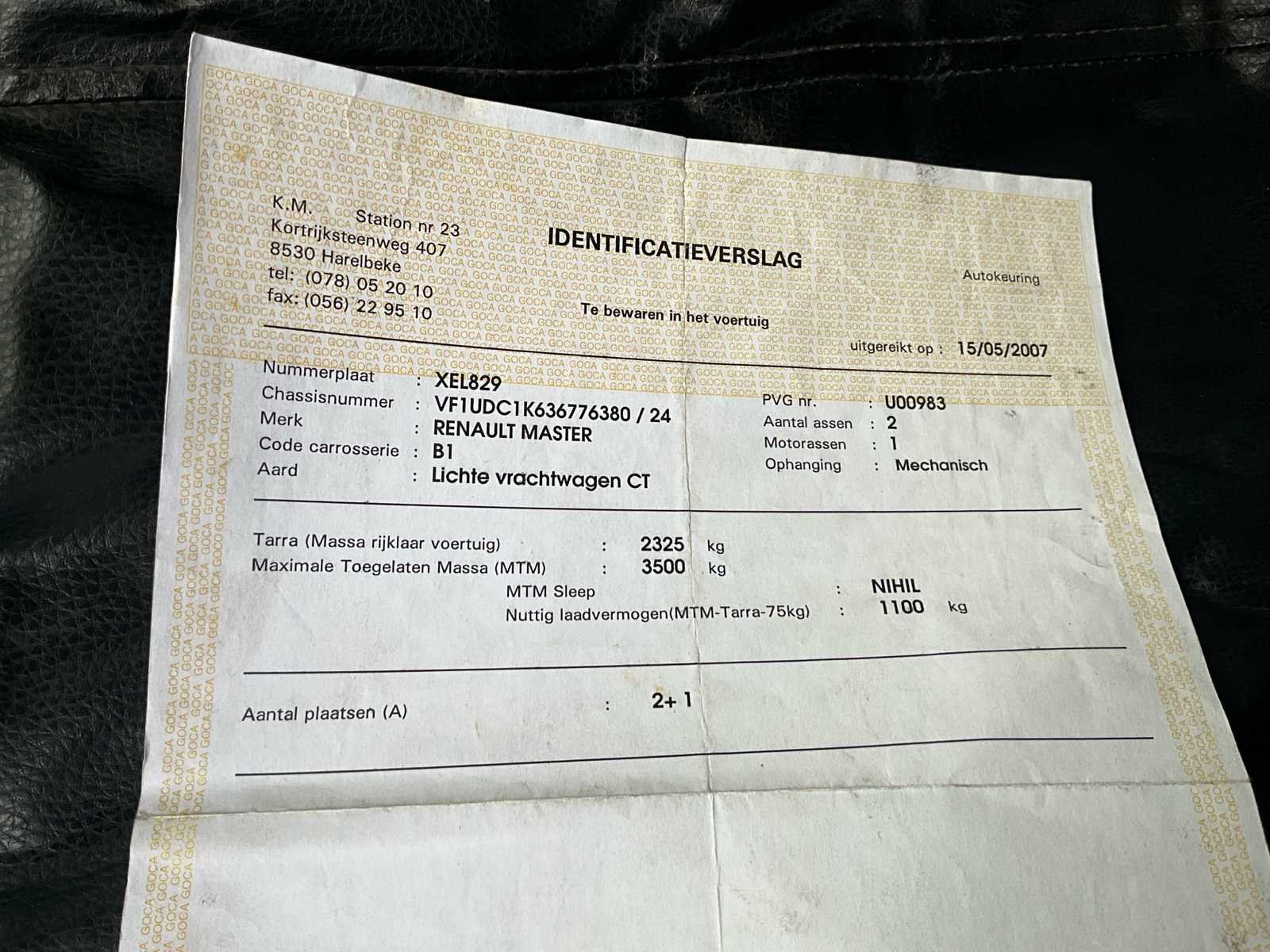 🚚 Algemene voertuiggegevens Merk: Renault Model / Handelsnaam: Master Type: UDC1K6 Voertuigcategorie: N1 – lichte vrachtwagen / camionnette Carrosserievorm: Lichte vracht (CT) Kleur: Grijs Brandstof: Diesel Motorinhoud: 2.464 cc Vermogen: 88 kW (≈ 120 pk) Milieuklasse: Euro 4 🆔 Identificatie Nummerplaat: XEL829 Chassisnummer (VIN): VF1UDC1K636776380 Eerste inschrijving: 14/05/2007 Land eerste inschrijving: België ⚖️ Gewichten & laadvermogen Massa rijklaar (tarra): 2.325 kg Maximaal toegelaten massa (MTM): 3.500 kg MTM sleep: nihil Nuttig laadvermogen: ± 1.100 kg 👥 Zitplaatsen Aantal zitplaatsen: 2 + 1 (bestuurder + 2) 🛠️ Keuring Laatste keuring geldig tot: 15/05/2025 Volgende periodieke keuring: Vanaf 15/03/2025 Uiterlijk 15/05/2025 ✅ Goedgekeurd – geen technische gebreken ➡️ “Het voertuig voldoet aan de technische voorschriften.” 🔐 Anti-diefstal Startonderbreker: Antidemarrage Verlog V2 Antistart Transponder: aanwezig Automatische inschakeling: ± 10 sec (passive arming) ANPI / NVBB rapport: aanwezig 📄 Identificatieverslag (Autokeuring) Afgeleverd: 15/05/2007 Code carrosserie: B1 Aard: Lichte vrachtwagen CT Aantal assen: 2 Motorassen: 1 Ophanging: Mechanisch 📘 Certificaat van Conformiteit Aanwezig Voertuigtype: Camionnette / lichte vrachtauto Typegoedkeuring: 000983 Uitgever: Renault Belgique Luxembourg 🌍 LEZ / Milieu (belangrijk) Euro 4 diesel Nee Merk: Renault Model: Master Bouwjaar: 2007 Afgelezen kilometerstand: 200559km Cilinderinhoud: 2464cc Vermogen (kW): 88kW Brandstof: diesel Chassisnummer: VF1UDC1K636776380 Datum eerste toelating: 14/05/2007 Vermogen (pk): 120hp Aantal zitplaatsen: 3 Transmissie: manueel Stuurwiel: links Emissieklasse: 4 Aantal sleutels: 1 Nationaliteit documenten: belg Gelijkvormigheidsattest aanwezig: true Start en rijdt: ja Keuringsrapport geldig tot: 15/05/2025 Vavato voert geen technische keuring uit.: true Inschrijvingsbewijs - deel 1 : ja Inschrijvingsbewijs - deel 2: ja