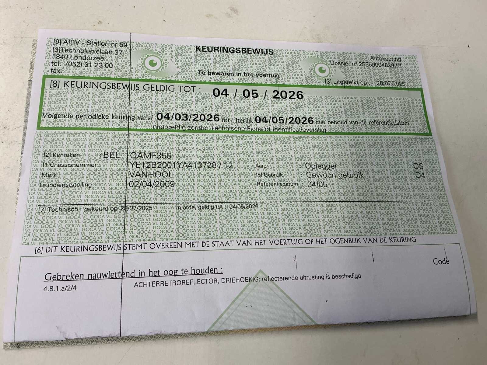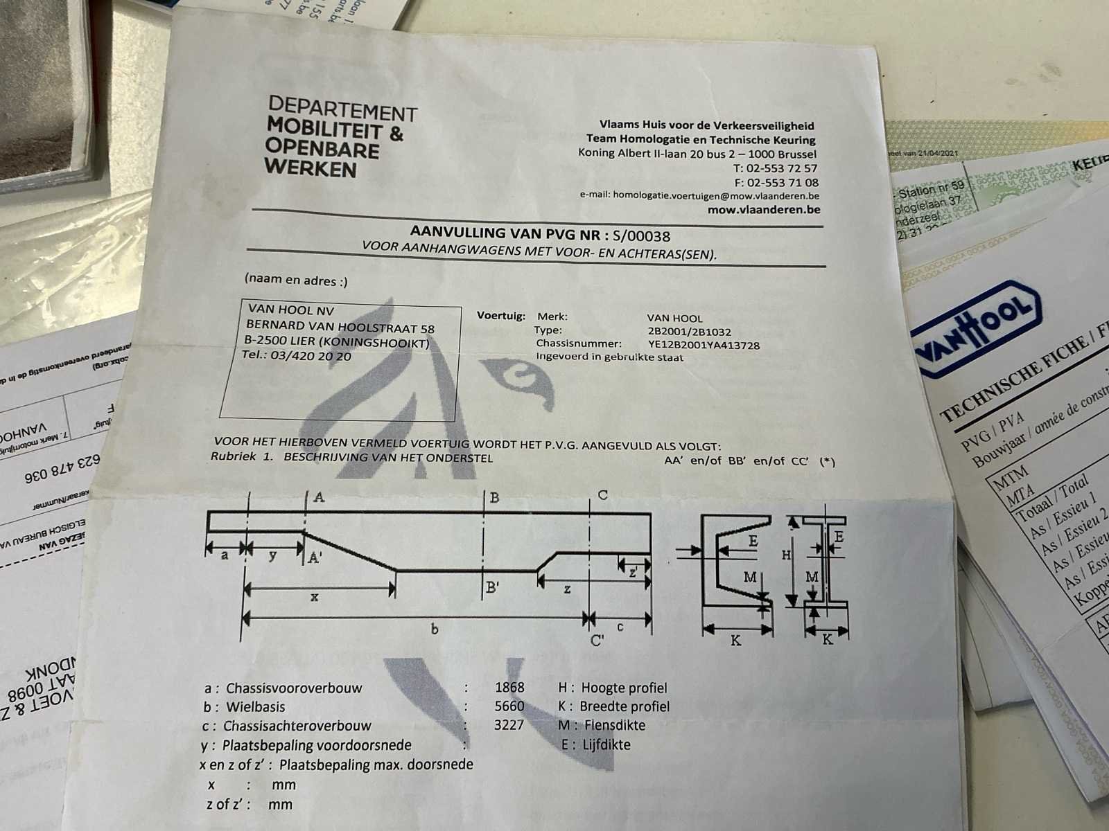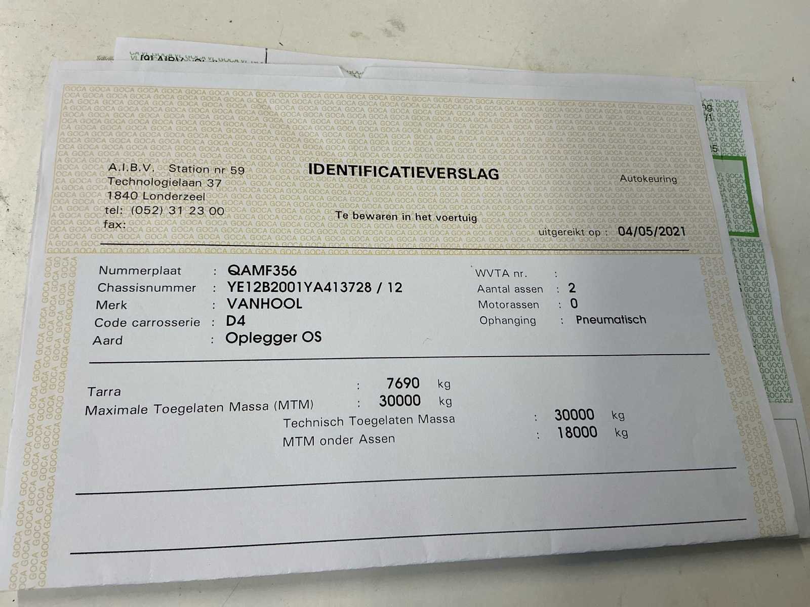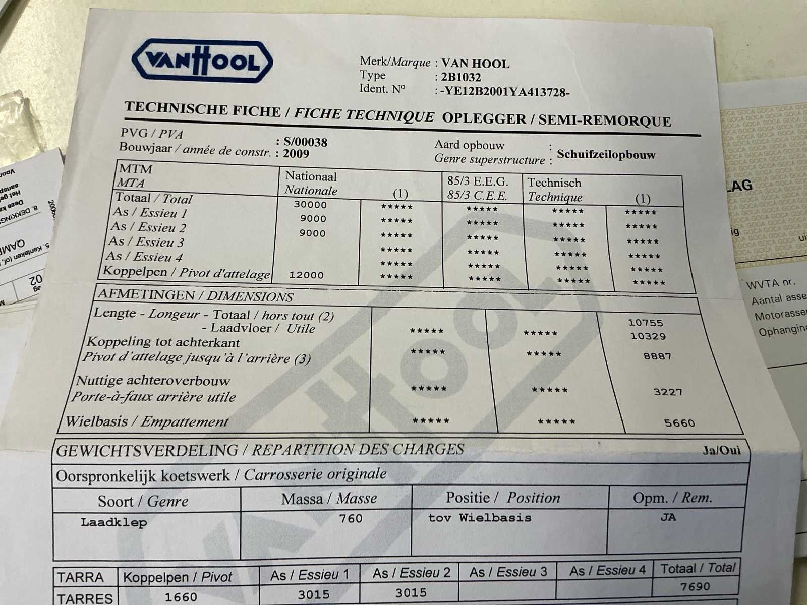 Deze Van Hool VHLO-2001 YA oplegger werd voor het eerst ingeschreven op 2 april 2009 en is uitgerust met een luchtgeveerde tandem asopstelling (2 assen van elk 9.000 kg). De maximaal toegelaten massa bedraagt 30.000 kg, met een maximaal asvermogen van 18.000 kg. Het ledig gewicht bedraagt 7.690 kg. De oplegger is voorzien van een Haldex Trailer EBS-remsysteem en beschikt over een hydraulische laadklep achteraan, wat het laden en lossen van goederen aanzienlijk vergemakkelijkt. Dankzij de pneumatische ophanging wordt een stabiele en comfortabele rit gegarandeerd, ook bij wisselende belading. De oplegger is gekeurd en geldig tot 4 mei 2026. Deze Van Hool oplegger is geschikt voor diverse transporttoepassingen en vormt een degelijke en betrouwbare oplossing voor professioneel gebruik. No Merk: Van Hool Type: VHLO-2001 YA Bouwjaar: 2009 Chassisnummer VIN: YE12B2001YA413728 Datum eerste toelating: 02/04/2009 Aantal assen: 2 Hydraulische laadklep: true