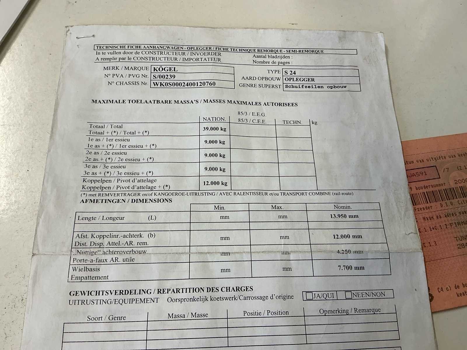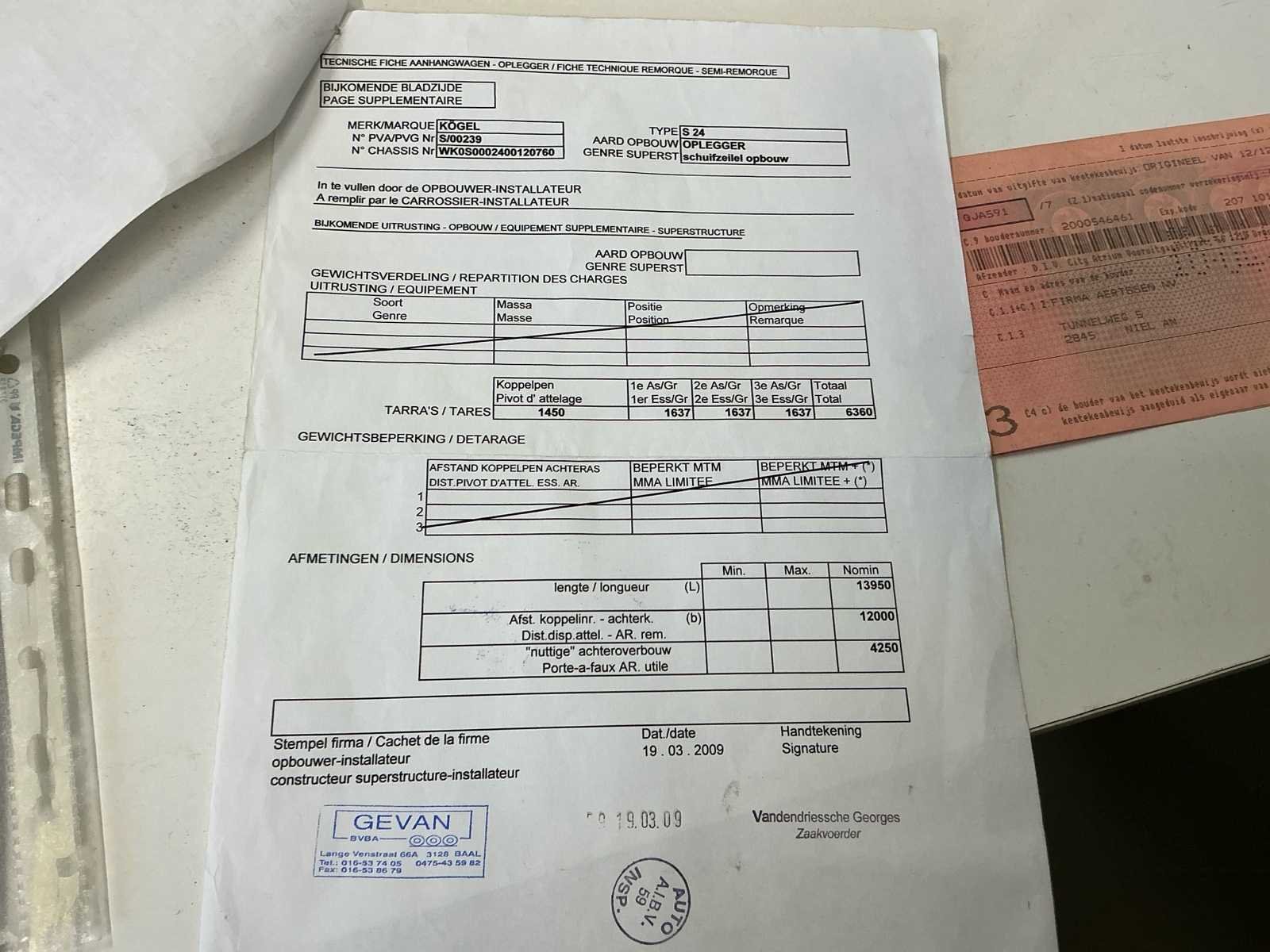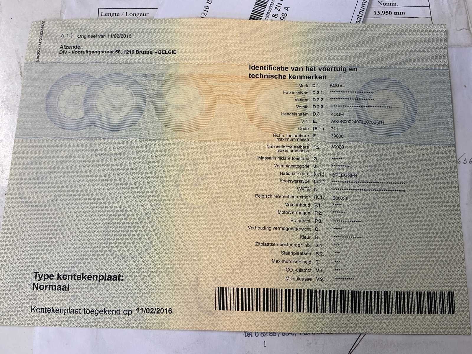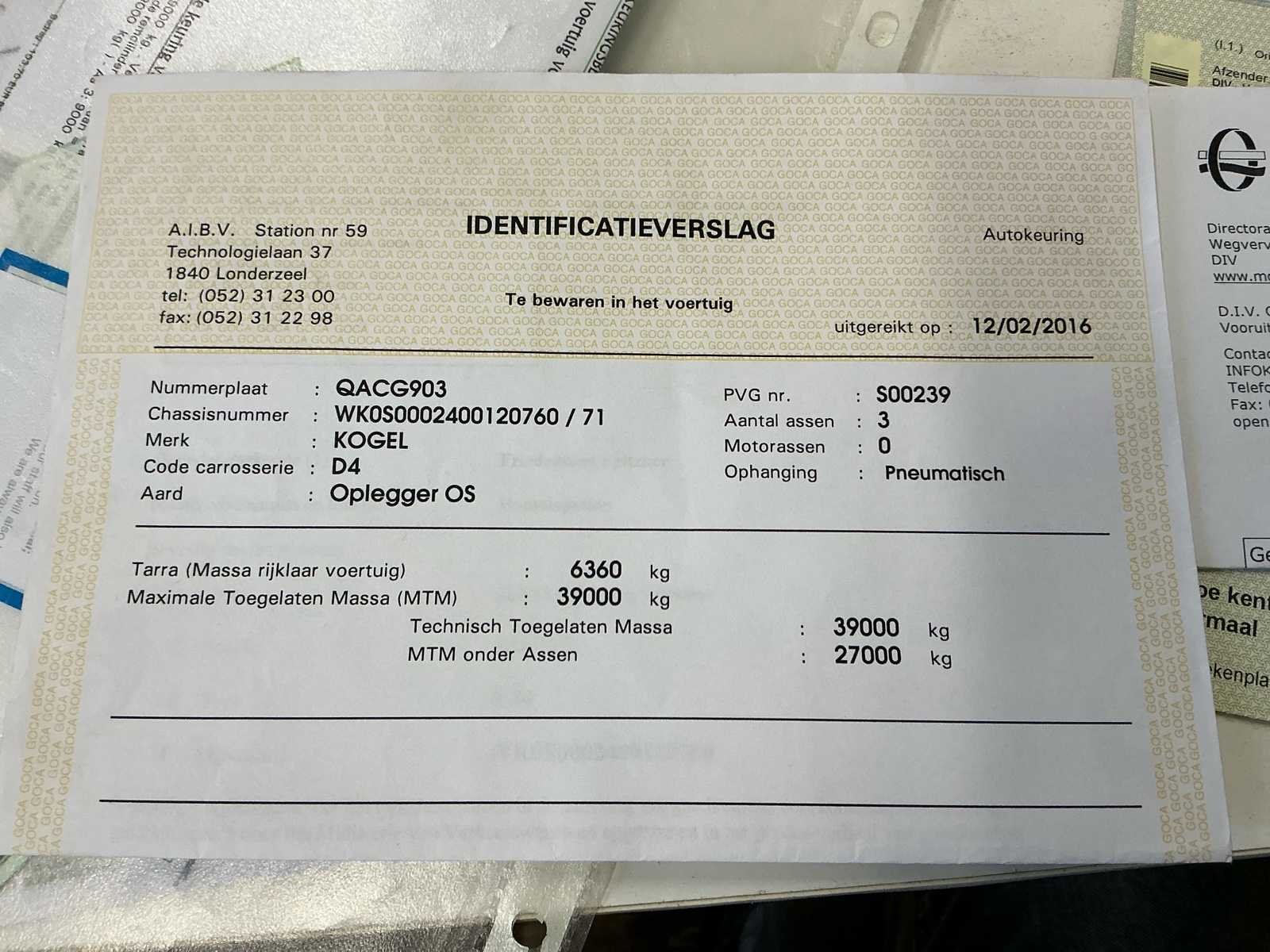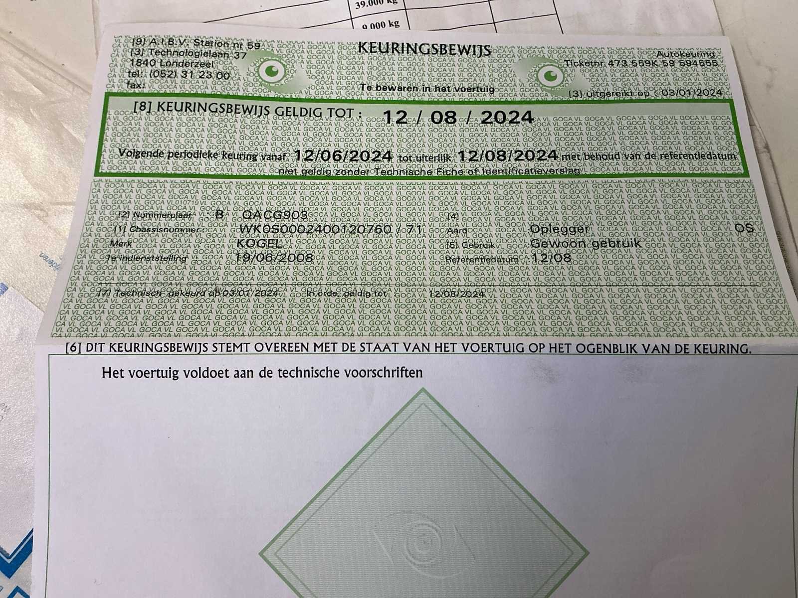Kogel zeiltrailer uit 2008 in goede staat. Enkele banden zijn te vervangen. Zeil in goede staat. No Merk: Kogel Type: S24 Bouwjaar: 2008 Chassisnummer VIN: WK0S0002400120760 Datum eerste toelating: 19/06/2008 Aantal assen: 3